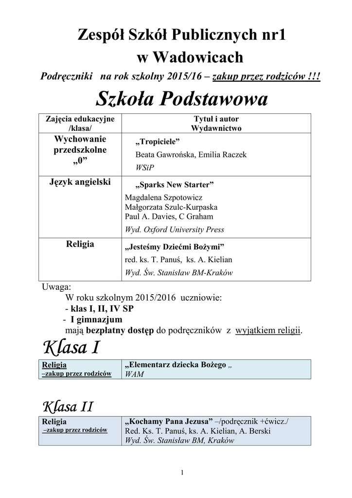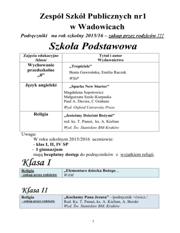 Zespół Szkół Publicznych nr1 w Wadowicach Podręczniki na rok szkolny 2015/16 – zakup przez rodziców !!! Szkoła Podstawowa Zajęcia edukacyjne /klasa/ Wychowanie przedszkolne „0” Język angielski Tytuł i autor Wydawnictwo „Tropiciele” Beata Gawrońska, Emilia Raczek WSiP „Sparks New Starter” Magdalena Szpotowicz Małgorzata Szulc-Kurpaska Paul A. Davies, C Graham Wyd. Oxford University Press Religia „Jesteśmy Dziećmi Bożymi” red. ks. T. Panuś, ks. A. Kielian Wyd. Św. Stanisław BM-Kraków Uwaga: W roku szkolnym 2015/2016 uczniowie: - klas I, II, IV SP - I gimnazjum mają bezpłatny dostęp do podręczników z wyjątkiem religii. Klasa I Religia –zakup przez rodziców „Elementarz dziecka Bożego „ WAM Klasa II Religia –zakup przez rodziców „Kochamy Pana Jezusa” –/podręcznik +ćwicz./ Red. Ks. T. Panuś, ks. A. Kielian, A. Berski Wyd. Św. Stanisław BM, Kraków 1 Klasa III Edukacja wczesnoszkolna Język angielski Religia BOX- „ Elementarz XXI wieku”. 1.Podręcznik –Elementarz -1, 2 część E. Hryszkiewicz B. Stępień 2.Ćwiczenia -1,2,3,4 część E. Hryszkiewicz M. Ogrodowicz 3.Matematyka -1,2,3,4 część M. Bura M. Kwil 4.Potyczki językowe –ćw. ortograficzne E. Kacprzak 5.Zajęcia komputerowe M. Kęska 6. Teczka artysty N. Gryzoń M. Król W. Vargas 7.Wyprawka Nowa Era Super Sparks 3 - /podr. +ćw./ Paul A. Davies, C Graham Magdalena Szpotowicz Małgorzata Szulc-Kurpaska Wyd. Oxford University Press „Przyjmujemy Pana Jezusa” Red. ks. Tadeusz Panuś Wyd. Św. Stanisława BM, Kraków Klasa Klasa IV Religia zakup przez rodziców „Słuchamy Pana Boga” Red. Ks. T. Panuś, ks. A. Kielian, A. Berski Wyd. św. Stanisław BM, Kraków 2012 2 Klasa V Język polski „Między nami”- /podr. + ćw./ Agnieszka Łuczak, Anna Murdzek Gdańskie Wydawnictwo Oświatowe Matematyka Matematyka z plusem –kl. 5. Podręcznik M. Dobrowolska, P. Zarzycki, M. Jucewicz Zeszyty ćwiczeń-Matematyka 5: - Liczby całkowite i ułamki- część 1 i 2 Z. Bolałek, M. Dobrowolska, A. Mysior, S. Wojtan - Geometria A. Mysior, P. Zarzycki Gdańskie Wydawnictwo Oświatowe Steps in English 2-/podr. + ćw./ Tim Falla, Paul A. Davies, Sylvia Wheeldon, Paul Shipton, Ewa Palczak, Magdalena Szpotowicz Wyd. Oxford University Press Historia wokół nas-/ podręcznik + zeszyt ćwiczeń/ R. Lolo, A. Pieńkowska, R. Towalski, W. Kalwat WSiP „Przyroda z klasą”-klasa 5 J. Buniowska, E. Frąckowiak, E, Gęca Wyd. Lektorklett Poznań „Słuchanie muzyki” kl.5 -/podr. z ćw./ Eugeniusz Wachowiak Wyd. GAWA „Lubię tworzyć”-kl.5 /podr. +ćw./ W. Sygut, A. Misior-Waś MAC Zajęcia techniczne cz.1 /podr. z ćw./ B. Stanecka, Cz. Stanecki Stanpol „Wierzymy w Pana Boga” Red. Ks. T. Panuś, ks. A. Kielian Wyd. Św. Stanisław BM, Kraków 2013r. Język angielski Historia Przyroda Muzyka Plastyka Zajęcia techniczne Religia 3 Klasa VI Język polski „Między nami”- /podr. + ćw./ Agnieszka Łuczak, Anna Murdzek Gdańskie Wydawnictwo Oświatowe 2014r. Matematyka Matematyka 6. PodręcznikM. Dobrowolska, P. Zarzycki, M. Jucewicz Zbiór zadań kl.6. P. Zarzycki, K. Zarzycka Gdańskie Wydawnictwo Oświatowe 2014r. Steps in English 3-/podr. + ćw./ Tim Falla, Paul A. Davies, Sylvia Wheeldon, Paul Shipton, Ewa Palczak Wyd. Oxford University Press „Historia wokół nas”- /podr.+ ćw./ R. Lolo, A. Pieńkowska, R. Towalski WSiP „Przyroda z klasą 6’’ E. Frąckowiak, E. Gęca, J. Buniowska Lektorklett „Lubię tworzyć”-kl.6 /podr. +ćw./ W. Sygut, A. Misior-Waś MAC Język angielski Historia Przyroda Plastyka Muzyka Zajęcia techniczne Religia „Słuchanie muzyki „kl.6 /podr. z ćw./ Ługiewicz, Wachowiak GAWA Zajęcia techniczne cz. 2 /podr. z ćw./ B. Stanecka, Cz. Stanecki StanPol „W kościele umacniamy wiarę” Red. ks. T. Panuś, ks. A. Kielian, ks. A. Berski Wyd.Św. Stanisława ,Kraków 4 Gimnazjum Klasa I Religia – zakup przez rodziców „Spotkanie ze słowem” red. ks. T. Panuś , R. Chrzanowska, M. Knicka wyd. Św. Stanisława BM Kraków Klasa II Język polski –IIa „Między nami” / Podr. + ćwicz./ A Łuczak, E. Prylińska , R. Maszka Gdańskie Wydawnictwo Oświatowe Język polski – II b,c „To lubię!” Teksty i zadania. Podręcznik / bez ćwiczeń/ M. Jędrychowska, Z. A. Kłakówna Wydawnictwo Edukacyjne Matematyka 2. Podręcznik dla gimnazjum /wyd.2010r. i nowsze/ praca zbiorowa pod red. M. Dobrowolskiej Matematyka 2. Zbiór zadań. Nowa wersja. M. Braun, J. Lech Gdańskie Wydawnictwo Oświatowe Interface 3 /podr.+ćw/ Emma Heyderman, Fiona Mauchline Macmillan Interface 2 /podr.+ćw/ Emma Heyderman, Fiona Mauchline Macmillan “Das ist Deutsch” 3-Język niemiecki dla gimnazjum podr.+ćw. J. Kamińska NOWA ERA “Das ist Deutsch”Kompakt 2. -Język niemiecki dla gimnazjum -podr. z ćw. J. Kamińska NOWA ERA Historia 2. Podręcznik do gimnazjum. Janusz Ustrzycki OPERON „Dziś i jutro”- Podręcznik z ćwiczeniami dla gimnazjum cz.1 J. Janicka, A. Kucia, T. Maćkowski NOWA ERA Matematyka Język angielski kontynuacja Język angielski – początkowy Język niemieckikontynuacja Język niemiecki początkowy Historia WOS 5 Chemia „Chemia Nowej Ery cz.2 .” /podr.+ ćw. / T. Kulawik, M.Litwin, J.Kulawik, D. Babczonek-Wróbel NOWA ERA Fizyka Geografia Biologia Religia „Świat fizyki ”- cz. 2 i 3 B. Sagnowska Świat fizyki. Zbiór prostych zadań dla gimnazjum. Andrzej Kurowski, Jolanta Niemiec ZAMKOR „Puls Ziemi”- /podr. + ćw./ B. Dobosik, A. Hibszer, J. Soja NOWA REA Kontynuacja -„Puls życia 1”-podręcznik do biologii dla gimnazjum. „Puls życia 2”-podręcznik do biologii dla gimnazjum M. Jefimow, M. Sęktas NOWA ERA „Aby nie ustać w drodze” red. ks. T. Panuś , R. Chrzanowska wyd. Św. Stanisława BM Kraków 2013 Klasa III Język polski – III b,c Język polski – IIIa Matematyka Język angielski kontynuacja Język angielski – początkowy Język niemieckikontynuacja Język niemieckipoczątkowy „