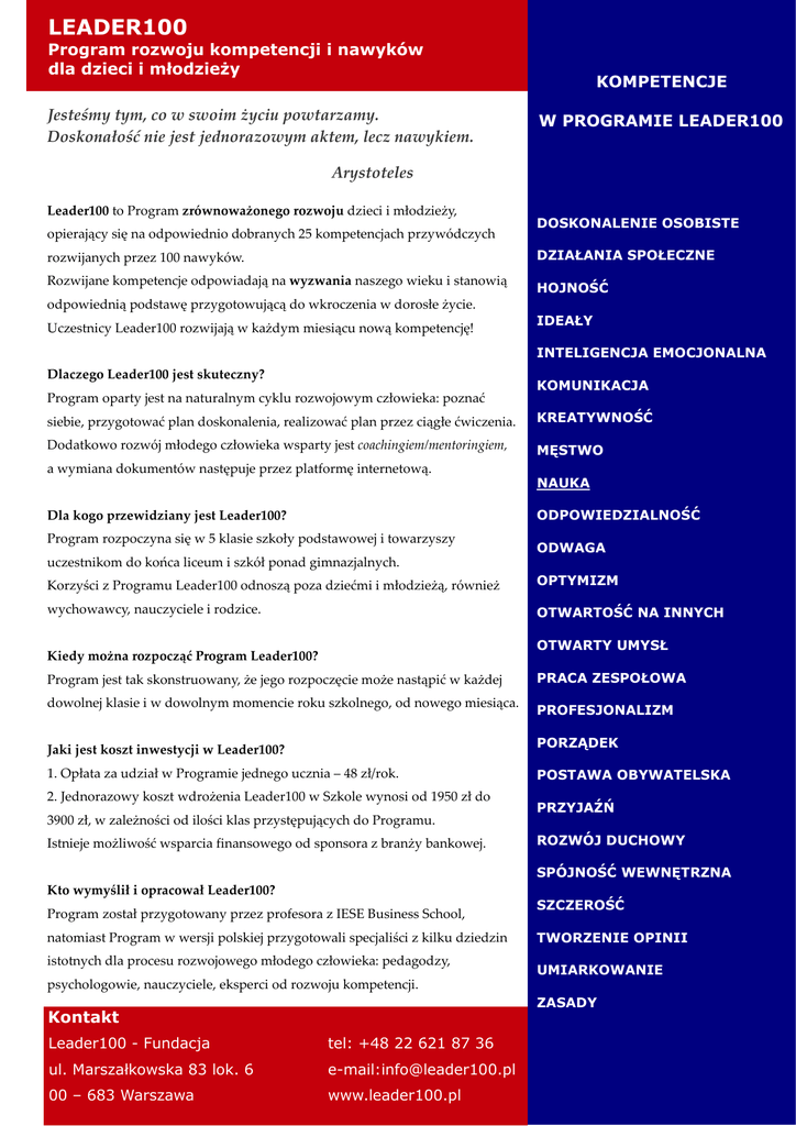 LEADER100 Program rozwoju kompetencji i nawyków dla dzieci i młodzieży Jesteśmy tym, co w swoim życiu powtarzamy. Doskonałość nie jest jednorazowym aktem, lecz nawykiem. KOMPETENCJE W PROGRAMIE LEADER100 Arystoteles Leader100 to Program zrównoważonego rozwoju dzieci i młodzieży, opierający się na odpowiednio dobranych 25 kompetencjach przywódczych DOSKONALENIE OSOBISTE rozwijanych przez 100 nawyków. DZIAŁANIA SPOŁECZNE Rozwijane kompetencje odpowiadają na wyzwania naszego wieku i stanowią HOJNOŚĆ odpowiednią podstawę przygotowującą do wkroczenia w dorosłe życie. Uczestnicy Leader100 rozwijają w każdym miesiącu nową kompetencję! IDEAŁY INTELIGENCJA EMOCJONALNA Dlaczego Leader100 jest skuteczny? Program oparty jest na naturalnym cyklu rozwojowym człowieka: poznać KOMUNIKACJA siebie, przygotować plan doskonalenia, realizować plan przez ciągłe ćwiczenia. KREATYWNOŚĆ Dodatkowo rozwój młodego człowieka wsparty jest coachingiem/mentoringiem, MĘSTWO a wymiana dokumentów następuje przez platformę internetową. NAUKA Dla kogo przewidziany jest Leader100? ODPOWIEDZIALNOŚĆ Program rozpoczyna się w 5 klasie szkoły podstawowej i towarzyszy ODWAGA uczestnikom do końca liceum i szkół ponad gimnazjalnych. Korzyści z Programu Leader100 odnoszą poza dziećmi i młodzieżą, również OPTYMIZM wychowawcy, nauczyciele i rodzice. OTWARTOŚĆ NA INNYCH OTWARTY UMYSŁ Kiedy można rozpocząć Program Leader100? Program jest tak skonstruowany, że jego rozpoczęcie może nastąpić w każdej dowolnej klasie i w dowolnym momencie roku szkolnego, od nowego miesiąca. PRACA ZESPOŁOWA PROFESJONALIZM PORZĄDEK Jaki jest koszt inwestycji w Leader100? 1. Opłata za udział w Programie jednego ucznia – 48 zł/rok. 2. Jednorazowy koszt wdrożenia Leader100 w Szkole wynosi od 1950 zł do 3900 zł, w zależności od ilości klas przystępujących do Programu. Istnieje możliwość wsparcia finansowego od sponsora z branży bankowej. POSTAWA OBYWATELSKA PRZYJAŹŃ ROZWÓJ DUCHOWY SPÓJNOŚĆ WEWNĘTRZNA Kto wymyślił i opracował Leader100? Program został przygotowany przez profesora z IESE Business School, natomiast Program w wersji polskiej przygotowali specjaliści z kilku dziedzin istotnych dla procesu rozwojowego młodego człowieka: pedagodzy, SZCZEROŚĆ TWORZENIE OPINII UMIARKOWANIE psychologowie, nauczyciele, eksperci od rozwoju kompetencji. ZASADY Kontakt Leader100 - Fundacja tel: +48 22 621 87 36 ul. Marszałkowska 83 lok. 6 e-mail:[email protected] 00 – 683 Warszawa www.leader100.pl