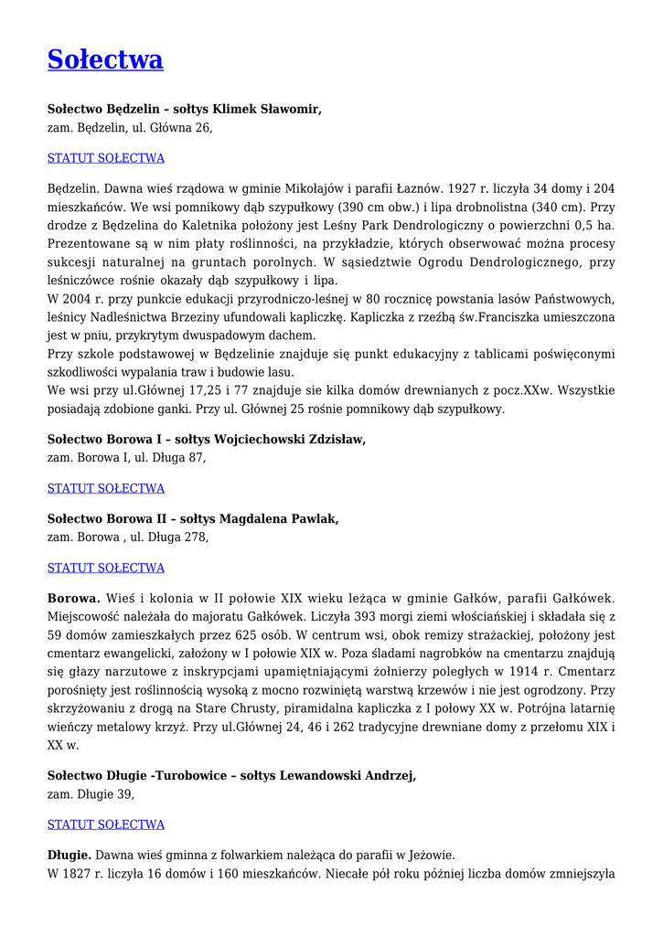 Sołectwa Sołectwo Będzelin – sołtys Klimek Sławomir, zam. Będzelin, ul. Główna 26, STATUT SOŁECTWA Będzelin. Dawna wieś rządowa w gminie Mikołajów i parafii Łaznów. 1927 r. liczyła 34 domy i 204 mieszkańców. We wsi pomnikowy dąb szypułkowy (390 cm obw.) i lipa drobnolistna (340 cm). Przy drodze z Będzelina do Kaletnika położony jest Leśny Park Dendrologiczny o powierzchni 0,5 ha. Prezentowane są w nim płaty roślinności, na przykładzie, których obserwować można procesy sukcesji naturalnej na gruntach porolnych. W sąsiedztwie Ogrodu Dendrologicznego, przy leśniczówce rośnie okazały dąb szypułkowy i lipa. W 2004 r. przy punkcie edukacji przyrodniczo-leśnej w 80 rocznicę powstania lasów Państwowych, leśnicy Nadleśnictwa Brzeziny ufundowali kapliczkę. Kapliczka z rzeźbą św.Franciszka umieszczona jest w pniu, przykrytym dwuspadowym dachem. Przy szkole podstawowej w Będzelinie znajduje się punkt edukacyjny z tablicami poświęconymi szkodliwości wypalania traw i budowie lasu. We wsi przy ul.Głównej 17,25 i 77 znajduje sie kilka domów drewnianych z pocz.XXw. Wszystkie posiadają zdobione ganki. Przy ul. Głównej 25 rośnie pomnikowy dąb szypułkowy. Sołectwo Borowa I – sołtys Wojciechowski Zdzisław, zam. Borowa I, ul. Długa 87, STATUT SOŁECTWA Sołectwo Borowa II – sołtys Magdalena Pawlak, zam. Borowa , ul. Długa 278, STATUT SOŁECTWA Borowa. Wieś i kolonia w II połowie XIX wieku leżąca w gminie Gałków, parafii Gałkówek. Miejscowość należała do majoratu Gałkówek. Liczyła 393 morgi ziemi włościańskiej i składała się z 59 domów zamieszkałych przez 625 osób. W centrum wsi, obok remizy strażackiej, położony jest cmentarz ewangelicki, założony w I połowie XIX w. Poza śladami nagrobków na cmentarzu znajdują się głazy narzutowe z inskrypcjami upamiętniającymi żołnierzy poległych w 1914 r. Cmentarz porośnięty jest roślinnością wysoką z mocno rozwiniętą warstwą krzewów i nie jest ogrodzony. Przy skrzyżowaniu z drogą na Stare Chrusty, piramidalna kapliczka z I połowy XX w. Potrójna latarnię wieńczy metalowy krzyż. Przy ul.Głównej 24, 46 i 262 tradycyjne drewniane domy z przełomu XIX i XX w. Sołectwo Długie -Turobowice – sołtys Lewandowski Andrzej, zam. Długie 39, STATUT SOŁECTWA Długie. Dawna wieś gminna z folwarkiem należąca do parafii w Jeżowie. W 1827 r. liczyła 16 domów i 160 mieszkańców. Niecałe pół roku póżniej liczba domów zmniejszyła się do 13. Urząd gminy znajdował sie w Katarzynowie. Dobra Długiego składały sie z folwarku i wsi: Długie, Katarzynów, Felicjanów, Stefanów, Słotwiny, Zygmuntów, Jeziorko, Lisowice i Kowalewszczyzna. Folwark obejmował 499 morg, niemal wyłącznie gruntów ornych i posiadał 10 budynków drewnianych. Wieś Długie miała 16 osad i 56 morg gruntów. Za wsią, przy drodze do Zygmuntowa znajduje się kapliczka typu słupowego z I połowy XXw. Sołectwo Lisowice-Erazmów – sołtys Lesiak Jan, zam. Erazmów 16, STATUT SOŁECTWA Erazmów. Wieś należąca dawniej do gminy Gałkówek i parafii Brzeziny. W 1827 r. składała sie z 10 domów zamieszkałych przez 47 osób. We wschodniej części wsi położony jest cmentarz ewangelicki z II ćw. XX w. Cmentarz ogrodzony jest kamienno – ceglanym murem. Pośród gęstych krzewów zachowały sie pozostałości kilku nagrobków. Sołectwo Felicjanów – sołtys Kmieciak Katarzyna, zam. Felicjanów 69, STATUT SOŁECTWA Felicjanów. Wieś Felicjanów należała do gminy Długie i parafii w Jeżowie. W 1827 r. liczyła 19 domów ze 125 mieszkańcami. W II połowie XIX w. posiadała 24 domy, 255 mieszkańców i 532 morgi ziemi włościańskiej. W centrum wsi, ufundowana przez jej mieszkańców w ubiegłym stuleciu kapliczka z witryną, kryjąca figurę Matki Boskiej. W sąsiedztwie wsi na niewielkim wzniesieniu znajduje sie XIX- wieczny cmentarz ewangelicki. Zachowały sie na nim pozostałości ponad 10 nagrobków z częściowo czytelnymi inskrypcjami oraz płyta pionowa upamiętniająca żołnierza niemieckiego poległego w 1914 r. Cmentarz nie jest ogrodzony. Porośnięty drzewami i krzewami. Sołectwo Gałków Duży – sołtys Fijołek Michał, zam. Gałków Duży, ul. Główna 81, STATUT SOŁECTWA Gałków Duży. Pierwsze wzmianki o Gałkowie pochodzą z 1348 r. Wówczas istniała osada Gałkówek ( obecnie Gałków Parcela) i Gałków ( dzisiejszy Gałków Duży). Dawniej wieś donacyjna, leżąca przy drodze bitej z Brzezin do Ujazdu. We wsi istniał, erygowany prawdopodobnie w 1633 r. przez Łukasza Kidalę, drewniany kościół parafialny. W 1827 Gałków liczył 40 domów i 267 mieszkańców. W II połowie XIX w. liczba domów wzrosła do 86, a mieszkańców do 785. Istniało 51 osad. Obszar ziemi włościańskiej wynosił 1296 morg, a kościelnej 8 morg. We wsi znajduje sie kościół p.w. Świętej Trójcy, wzniesiony w latach1873-79, w miejscu starszej, drewnianej świątyni. Jest to budowa jednonawowa, nawiązująca do stylu neoromańskiego. W kościele na uwagę zasługuje drewniany tryptyk, barokowy krzyż i monstrancja z XVIII w. Najbardziej znanych mieszkańców upamiętnia kilka XIX i XX –wiecznych tablic, znajdujących sie w kruchcie. W elewacji kościoła wmurowany jest niewybuch z 1914 r. W sąsiedztwie świątyni utworzono małe lapidarium z fragmentami nagrobków, pochodzącymi ze starego przykościelnego cmentarza. Obok kościoła stoi zabytkowa murowana plebania z 1879 r. i rosną dwie okazałe lipy szerokolistne (400 i 420 cm) oraz dąb szypułkowy. Na wschód od kościoła położony jest cmentarz rzymsko-katolicki, założony w 1856 r. Cmentarz otoczony jest otynkowanym murem i posiada 0,8 m powierzchni. Najstarsze nagrobki pochodzą z końca XIX w.Na cmentarzu znajduje sie m.in.: grób nieznanego żołnierza, nagrobek upamiętniający strażaków OSP z Borowej, Gałkowa Dużego i Gałkowa Kolonii oraz symboliczny grób por. H.Rózniecki
