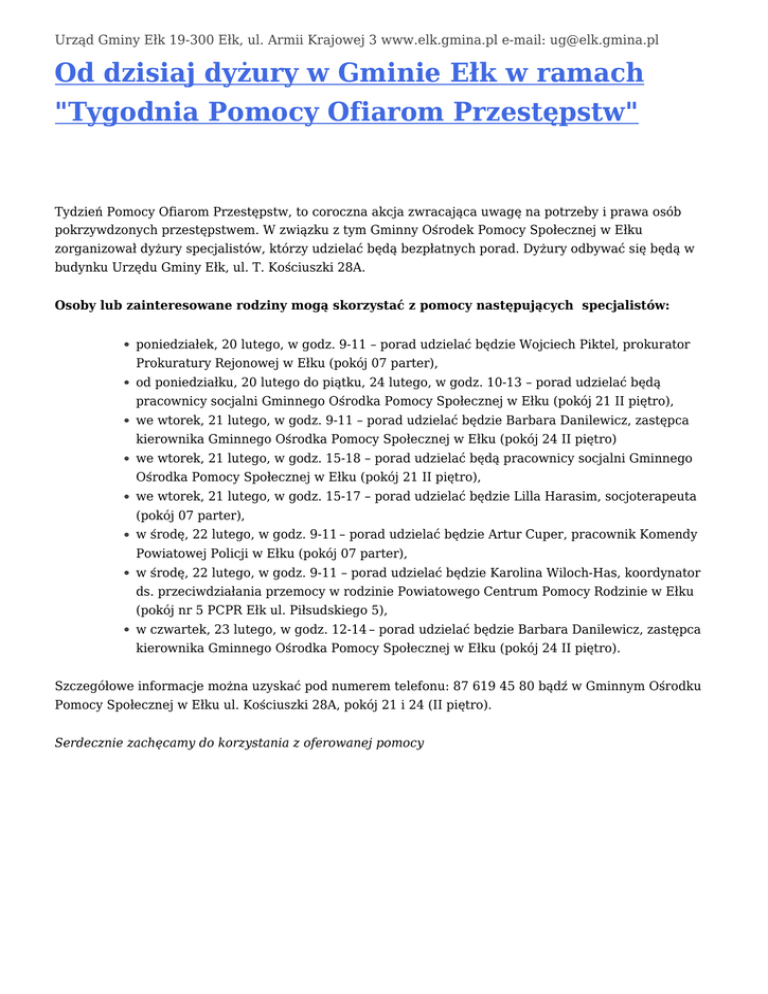 Urząd Gminy Ełk 19-300 Ełk, ul. Armii Krajowej 3 www.elk.gmina.pl e-mail: [email protected] Od dzisiaj dyżury w Gminie Ełk w ramach "Tygodnia Pomocy Ofiarom Przestępstw" Tydzień Pomocy Ofiarom Przestępstw, to coroczna akcja zwracająca uwagę na potrzeby i prawa osób pokrzywdzonych przestępstwem. W związku z tym Gminny Ośrodek Pomocy Społecznej w Ełku zorganizował dyżury specjalistów, którzy udzielać będą bezpłatnych porad. Dyżury odbywać się będą w budynku Urzędu Gminy Ełk, ul. T. Kościuszki 28A. Osoby lub zainteresowane rodziny mogą skorzystać z pomocy następujących specjalistów: poniedziałek, 20 lutego, w godz. 9-11 – porad udzielać będzie Wojciech Piktel, prokurator Prokuratury Rejonowej w Ełku (pokój 07 parter), od poniedziałku, 20 lutego do piątku, 24 lutego, w godz. 10-13 – porad udzielać będą pracownicy socjalni Gminnego Ośrodka Pomocy Społecznej w Ełku (pokój 21 II piętro), we wtorek, 21 lutego, w godz. 9-11 – porad udzielać będzie Barbara Danilewicz, zastępca kierownika Gminnego Ośrodka Pomocy Społecznej w Ełku (pokój 24 II piętro) we wtorek, 21 lutego, w godz. 15-18 – porad udzielać będą pracownicy socjalni Gminnego Ośrodka Pomocy Społecznej w Ełku (pokój 21 II piętro), we wtorek, 21 lutego, w godz. 15-17 – porad udzielać będzie Lilla Harasim, socjoterapeuta (pokój 07 parter), w środę, 22 lutego, w godz. 9-11 – porad udzielać będzie Artur Cuper, pracownik Komendy Powiatowej Policji w Ełku (pokój 07 parter), w środę, 22 lutego, w godz. 9-11 – porad udzielać będzie Karolina Wiloch-Has, koordynator ds. przeciwdziałania przemocy w rodzinie Powiatowego Centrum Pomocy Rodzinie w Ełku (pokój nr 5 PCPR Ełk ul. Piłsudskiego 5), w czwartek, 23 lutego, w godz. 12-14 – porad udzielać będzie Barbara Danilewicz, zastępca kierownika Gminnego Ośrodka Pomocy Społecznej w Ełku (pokój 24 II piętro). Szczegółowe informacje można uzyskać pod numerem telefonu: 87 619 45 80 bądź w Gminnym Ośrodku Pomocy Społecznej w Ełku ul. Kościuszki 28A, pokój 21 i 24 (II piętro). Serdecznie zachęcamy do korzystania z oferowanej pomocy
