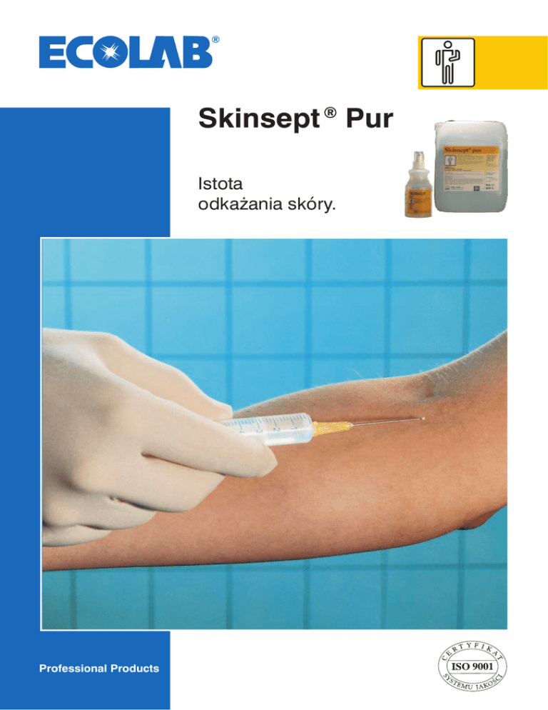 Skinsept Pur Istota odkażania skóry. Professional Products Skinsept Pur Podczas każdego zabiegu medycznego w trakcie którego zostaje naruszona skóra pacjenta, konieczne jest przeprowadzenie odkażania skóry. Właściwości Korzyści Obszar zastosowań Sposób postępowania Szeroki zakres działania wobec mikroorganizmów występujących na powierzchni skóry: bakterii (włącznie z prątkami gruźlicy i MRSA) oraz grzybów i wirusów (HBV, HIV, Herpes, Rota, Adeno). Pewne odkażanie skóry we wszystkich zakresach, przy wszystkich wskazaniach. Odkażanie skóry przed iniekcjami, pobraniem krwi, szczepieniami, akupunkturą. Szybkie unieszkodliwianie mikroorganizmów - krótki czas działania. Stosowanie oszczędzające czas i odpowiadające praktycznym potrzebom. Partię skóry spryskać przed wkłuciem i odczekać 15 sek. Celem poszerzenia spektrum działania o wirusy przedłużyć czas działania do 1 minuty. Przy zagrożeniu wirusem HBV przedłużyć czas działania do 2 minut powtórnie spryskując skórę. Odkażanie skóry przed operacjami i punkcjami. Nierozcieńczony roztwór preparatu nanieść przy pomocy sterylnego tamponu na skórę, rozprowadzić po powierzchni skóry, odczekać 1 minutę aż do wyschnięcia. Przy zagrożeniu wirusem HBV przedłużyć czas działania do 2 minut powtórnie nanosząc preparat na skórę. Czynność należy powtórzyć. Alkohole jako substancje czynne, tzn.: - skuteczne odkażanie o przedłużonym czasie działania - brak pozostałości na skórze - odtłuszczanie skóry - szybkie schnięcie preparatu - nie zawiera jodu Autosterylność - patent europejski Świadectwo re-rejestracji MZ 10728/M/96 - wysokie bezpieczeństwo, również w przypadku dłuższych operacji - bardzo dobra tolerancja przez skórę, niezakłócone gojenie się ran, zadowolenie pacjentów - oszczędność czasu pracy poprzez zastosowanie połączonej techniki "dwa w jednym" - jednoczesne odtłuszczanie i odkażanie - skraca czas przygotowania pola operacyjnego, bezpośrednie nakładanie sterylnych folii operacyjnych i ich dobre przyleganie - zastosowanie również w przypadku pacjentów uczulonych na działanie jodu, w położnictwie i ginekologii Możliwość przelewania z ekonomicznych dużych opakowań. Preparat spełnia wymogi odnośnie braku przetrwalników w środkach do odkażania skóry - także wtedy gdy jest przelewany do mniejszych pojemników. Przebadany klinicznie i dermatologicznie. Opakowania Jednostkowe Handlowe Symbol Butelka 100 ml Karton 50 x 100 ml ATP 50 Butelka 250 ml z atomizerem Karton 24 x 250 ml ATP 25 Butelka 350 ml z atomizerem Karton 24 x 350 ml ATP 35 Butelka 1000 ml Karton 12 x 1000 ml ATP 12 Kanister 5000 ml Kanister 5000 ml ATP 5 Środki ostrożności: Środek łatwopalny. Strumienia środka nie kierować w stronę źródła ognia. Chronić przed dziećmi. Nie stosować po upływie daty ważności. Przed włączeniem urządzeń elektrycznych, narzędzi elektrochirurgicznych odczekać aż do wyschnięcia preparatu. Należy przestrzegać sposobu stosowania oraz zasad bezpieczeństwa. Należy uważać na materiały wrażliwe na alkohol (np. plexi). Preparat nie wywołuje jakichkolwiek podrażnień nieskaleczonej skóry. Odporny na zmiany temperatur. Produkt stabilny w zakresie od – 10°C do + 25°C. Temperatura zapłonu (wg normy DIN 51755): 22°C Zastosowanie: Roztwór gotowy do użycia, przeznaczony do odkażania skóry przed operacjami, punkcjami, pobieraniem krwi, szczepieniami, iniekcjami i akupunkturą. Skład: alkohol etylowy (96%) – 46,0 g; alkohol izopropylowy – 27,0 g; alkohol benzylowy – 1,0 g; nadtlenek wodoru – 0,1 g; woda oczyszczona do 100 g. Przeciwwskazania: Preparatu nie stosować do odkażania błon śluzowych oraz w bezpośredniej bliskości oczu. Nie zaleca się odkażania ran. Działania uboczne: Nie są dotąd znane jakiekolwiek skutki uboczne. Centrala: Ecolab Inc. 370 Wabasha Street North St. Paul, Minnesota 55102 - USA tel.: +1-651-293-22 33; fax: +1-651-293-20 92 Europa: Ecolab GmbH Reisholzer Werftstraße 38-42 D-40554 Düsseldorf - Deutschland tel.: (0211) 9893-0; fax: (0211) 9893-384 www.ecolab.com Polska: Ecolab Sp. z o.o. ul. Kalwaryjska 69 30-504 Kraków - Polska tel.: 0-12 26 16 100; fax: 0-12 26 16 101 ATP/12_01 Oferujemy kompletną paletę produktów oraz systemy gwarantujące utrzymanie wysokiego standardu higieny instytucjonalnej, szpitalnej, tekstylnej i przemysłowej. Zachęcamy do zapoznania się z naszą ofertą i do współpracy. Ecolab - Państwa partner w dziedzinie higieny!
