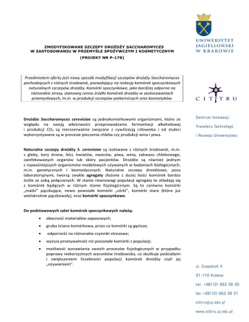 ZMODYFIKOWANE SZCZEPY DROŻDŻY SACCHAROMYCES W ZASTOSOWANIU W PRZEMYŚLE SPOŻYWCZYM I KOSMETYCZNYM (PROJEKT NR P-178) Przedmiotem oferty jest nowy sposób modyfikacji szczepów drożdży Saccharomyces pochodzących z różnych środowisk, pozwalający na izolację komórek spoczynkowych naturalnych szczepów drożdży. Komórki spoczynkowe, jako bardziej odporne na różnorakie stresy, stanowią cenne źródło komórek drożdży w zastosowaniach przemysłowych, m.in. w produkcji szczepów piekarniczych oraz kosmetyków. Drożdże Saccharomyces cerevisiae są jednokomórkowymi organizmami, które ze względu na swoją właściwości przeprowadzania fermentacji alkoholowej i produkcji CO2 są nierozerwalnie związane z cywilizacją człowieka i od stuleci wykorzystywane są w procesie pieczenia chleba czy produkcji wina i piwa. Naturalne szczepy drożdży S. cerevisiae są izolowane z różnych środowisk, m.in. z gleby, kory drzew, liści, kwiatów, owoców, piwa, wina, zakwasu chlebowego, zainfekowanych organów lub skóry pacjentów. Drożdże są również jednym z najważniejszych organizmów modelowych używanych w badaniach biologicznych, m.in. genetycznych i biomedycznych. Naturalne szczepy drożdżowe, poza laboratoryjnymi, tworzą zwykle agregaty złożone z dużej ilości komórek bardzo ściśle ze sobą połączonych. W stanie równowagi populacji agregaty te składają się z komórek będących w różnym stanie fizjologicznym. Są to zarówno komórki „matki” pączkujące, nowo powstałe komórki „córki”, komórki stare (które już wielokrotnie pączkowały), oraz komórki spoczynkowe. Do podstawowych zalet komórek spoczynkowych należą: obecność materiałów zapasowych; gruba ściana komórkowa, przez co komórki są gęstsze; odporność na różnorakie czynniki stresowe; wyższa przeżywalność niż pozostałe komórki z populacji; możliwość wznawiania swoich procesów fizjologicznych w przypadku poprawy niekorzystnych warunków środowiska, co skutkuje podziałami i zwiększeniem liczebności populacji komórek drożdży czyli jej „ożywieniem”. Przedmiotem oferty jest nowy sposób pozwalający na wyizolowanie jednorodnej frakcji komórek spoczynkowych z naturalnie agregujących szczepów drożdży Saccharomyces cerevisiae. Sposób izolacji komórek spoczynkowych drożdży według nowej metody polega na tym, że szczep naturalnie agregujący modyfikuje się genetycznie tak by nie tworzył agregatów, następnie doprowadza się do go stanu, w którym produkuje komórki spoczynkowe, a następnie oddziela się jednorodną warstwę zawierającą głównie komórki spoczynkowe z użyciem metody frakcjonowania w gradiencie gęstości. Komórki drożdży pozyskane nowym sposobem lepiej przeżywają długotrwałe warunki stresowe, w tym: wielokrotne rozmrażanie i przechowywanie w temperaturze ‐20o C; długotrwałe przetrzymywanie w 4o C tj. w temperaturze chłodziarek; długotrwałe przechowywanie w temperaturze 28o C; stres termiczny w temperaturze 38o C. Uzyskane nową metodą homogenne komórki drożdży o wyższej przeżywalności mogą mieć zastosowanie przy produkcji szczepów piekarniczych (drożdży świeżych i suszonych), probiotyków i kosmetyków wymagających „ożywienia” komórek drożdży po dłuższym okresie „uśpienia”. Oferowana metoda izolacji komórek drożdży stanowi przedmiot zgłoszenia patentowego. Dalsze prace nad jej rozwojem prowadzone są w Instytucie Nauk o Środowisku UJ, a Centrum Innowacji, Transferu Technologii i Rozwoju Uniwersytetu poszukuje podmiotów zainteresowanych komercyjnym wykorzystaniem wynalazku. Dalsze informacje: dr Klaudia Polakowska Specjalista ds. Transferu Technologii CITTRU, Uniwersytet Jagielloński www.cittru.uj.edu.pl tel. 12 663 3832, fax: 12 663 3831 e-mail: [email protected]