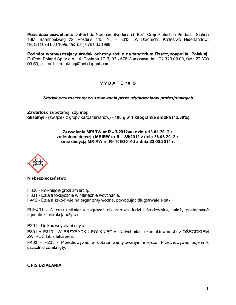Posiadacz zezwolenia: DuPont de Nemours (Nederland) B.V., Crop Protection Products, Station 18M, Baanhoekweg 22, Postbus 145, NL – 3313 LA Dordrecht, Królestwo Niderlandów, tel. (31) 078 630 1099, fax. (31) 078 630 1998. Podmiot wprowadzający środek ochrony roślin na terytorium Rzeczypospolitej Polskiej: DuPont Poland Sp. z o.o., ul. Postępu 17 B, 02 - 676 Warszawa, tel.: 22 320 09 00, fax.: 22 320 09 50, e - mail: [email protected] V Y D A T E 10 G Środek przeznaczony do stosowania przez użytkowników profesjonalnych Zawartość substancji czynnej: oksamyl - (związek z grupy karbaminianów) - 100 g w 1 kilogramie środka (13,89%). Zezwolenie MRiRW nr R - 3/2012wu z dnia 13.01.2012 r. zmienione decyzją MRiRW nr R – 85/2012 z dnia 26.03.2012 r. oraz decyzją MRiRW nr R- 168/2014d z dnia 23.05.2014 r. toksyczny Niebezpieczeństwo H300 - Połknięcie grozi śmiercią. H331 - Działa toksycznie w następnie wdychania. H412 - Działa szkodliwie na organizmy wodne, powodując długotrwałe skutki. EUH401 - W celu uniknięcia zagrożeń dla zdrowia ludzi i środowiska, należy postępować zgodnie z instrukcją użycia. P261 - Unikać wdychania pyłu. P301 + P310 - W PRZYPADKU POŁKNIĘCIA: Natychmiast skontaktować się z OŚRODKIEM ZATRUĆ lub z lekarzem. P403 + P233 - Przechowywać w dobrze wentylowanym miejscu. Przechowywać pojemnik szczelnie zamknięty. OPIS DZIAŁANIA 1 Vydate 10 G jest środkiem działającym układowo w formie granul do bezpośredniego stosowania, posiadającym właściwości zwalczające owady i nicienie. Środek do stosowania doglebowego, skąd pobierany jest przez korzenie, w roślinie działa układowo. Stosować tylko za pomocą aplikatorów do granulowanych środków ochrony roślin. STOSOWANIE ŚRODKA 1. Ziemniak nicienie a) stosowanie rzędowe Środek stosować rzędowo do redliny w czasie sadzenia ziemniaków stosując aplikator do granulowanych środków ochrony roślin połączony z sadzarką. Dodatkowo, dzięki zastosowaniu środka Vydate 10 G wzmacnia się początkowy rozwój roślin, co później – podczas okresu wzrostu – wzmacnia ich odporność. Ten sposób stosowania środka Vydate 10 G pozwala w dużej mierze zapobiec stratom w ilości jak i jakości zbiorów wywołanych przez nicienie. Maksymalna dawka środka dla jednorazowego zastosowania: 10 kg/ha. Zalecana dawka środka dla jednorazowego zastosowania: 10 kg/ha. Liczba zabiegów: 1. b) równomierny wysiew na powierzchni pola Środek należy rozsiewać na całym polu przed lub w czasie uprawy gleby przed sadzeniem ziemniaków. Środek rozsiewać równomiernie na powierzchni gleby przy użyciu aplikatorów do granulowanych środków ochrony roślin i natychmiast wymieszać z glebą na głębokość 10 - 15 cm. Maksymalna dawka środka dla jednorazowego zastosowania: 40 kg/ha. Zalecana dawka środka dla jednorazowego zastosowania: 40 kg/ha. Liczba zabiegów: 1. Maksymalna liczba zabiegów w sezonie wegetacyjnym: 1. 2. Burak cukrowy drobnica burakowa, skoczogonki, nicienie Środek stosować podczas siewu buraków doglebowo, przy użyciu podłączonego do siewnika aplikatora do granulowanych środków ochrony roślin. Dzięki temu zapobiega się szkodom wywołanym przez nicienie przede wszystkim w początkowym wzroście roślin. mątwik burakowy Maksymalna dawka środka dla jednorazowego zastosowania: 25 kg/ha. Zalecana dawka środka dla jednorazowego zastosowania: 25 kg/ha. Liczba zabiegów: 1. guzaki korzeniowe Maksymalna dawka środka dla jednorazowego zastosowania: 15 kg/ha. Zalecana dawka środka dla jednorazowego zastosowania: 15 kg/ha. Liczba zabiegów: 1. 2 nicienie wolnożyjące Maksymalna dawka środka dla jednorazowego zastosowania: 10 kg/ha. Zalecana dawka środka dla jednorazowego zastosowania: 10 kg/ha. Liczba zabiegów: 1. drobnica burakowa, skoczogonki Maksymalna dawka środka dla jednorazowego zastosowania: 7,5 kg/ha. Zalecana dawka środka dla jednorazowego zastosowania: 7,5 kg/ha. Liczba zabiegów: 1. Maksymalna liczba zabiegów w sezonie wegetacyjnym: 1. 3. Truskawki (produkcja sadzonek) nicienie Maksymalna dawka środka dla jednorazowego zastosowania: 40 kg/ha. Zalecana dawka środka dla jednorazowego zastosowania: 40 kg/ha. Maksymalna liczba zabiegów w sezonie wegetacyjnym: 1. Środek rozsiać tuż przed sadzeniem truskawki równomiernie na całym polu przy użyciu aplikatorów do granulowanych środków ochrony roślin i wymieszać na głębokość ok. 10 - 15 cm, najlepiej przy użyciu glebogryzarki. 4. Marchew nicienie migrujące, korzeniaki szkodliwe, guzaki korzeniowe Vydate 10 G może być stosowany w rzędach podczas siewu nasion marchwi przy założeniu odstępu między redlinami o szerokości co najmniej 50 cm oraz na całym polu tuż przed siewem lub podczas siewu nasion marchwi. a) stosowanie rzędowe Maksymalna dawka środka dla jednorazowego zastosowania: 10 kg/ha. Zalecana dawka środka dla jednorazowego zastosowania: 10 kg/ha. Liczba zabiegów: 1. Środek można stosować podczas siewu marchwi przy użyciu podłączonego do siewnika aplikatora do granulowanych środków ochrony roślin. b) równomierny wysiew na powierzchni pola Środek należy rozsiewać na całym polu tuż przed przygotowaniem lub podczas przygotowania gleby do siewu nasion marchwi. Środek rozsiewać jak najbardziej równomiernie na powierzchni przy użyciu aplikatorów do granulowanych środków ochrony roślin i natychmiast wymieszać z glebą do głębokości 10 - 15 cm. Maksymalna dawka środka dla jednorazowego zastosowania: 40 kg/ha. Zalecana dawka środka dla jednorazowego zastosowania: 40 kg/ha. Liczba zabiegów: 1. Maksymalna liczba zabiegów w sezonie wegetacyjnym: 1. ŚRODKI OSTROŻNOŚCI I ZALECENIA ZWIĄZANE Z DOBRĄ PRAKTYKĄ ROLNICZĄ 3 1. Stosować tylko za pomocą aplikatorów do granulowanych środków ochrony roślin. 2. Środek działa najskuteczniej w temperaturze powyżej 150 C. 3. W celu ochrony ptaków i wolnożyjących ssaków produkt powinien zostać 