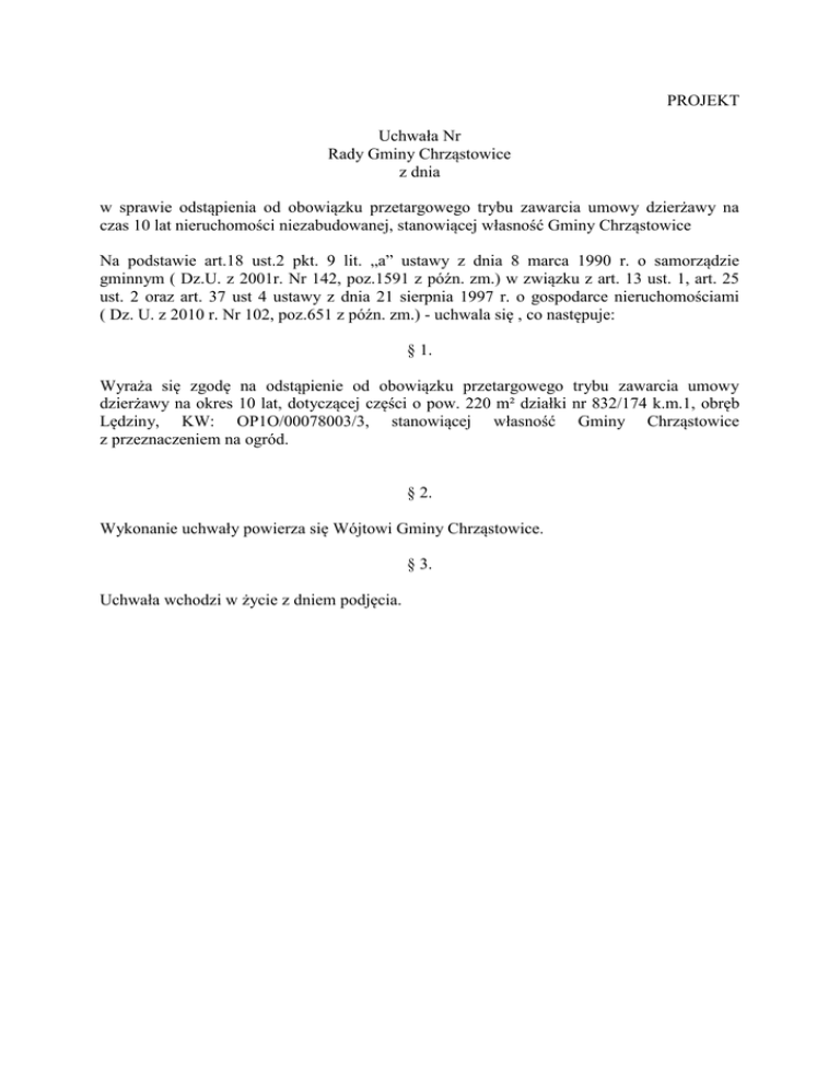 PROJEKT Uchwała Nr Rady Gminy Chrząstowice z dnia w sprawie odstąpienia od obowiązku przetargowego trybu zawarcia umowy dzierżawy na czas 10 lat nieruchomości niezabudowanej, stanowiącej własność Gminy Chrząstowice Na podstawie art.18 ust.2 pkt. 9 lit. „a” ustawy z dnia 8 marca 1990 r. o samorządzie gminnym ( Dz.U. z 2001r. Nr 142, poz.1591 z późn. zm.) w związku z art. 13 ust. 1, art. 25 ust. 2 oraz art. 37 ust 4 ustawy z dnia 21 sierpnia 1997 r. o gospodarce nieruchomościami ( Dz. U. z 2010 r. Nr 102, poz.651 z późn. zm.) - uchwala się , co następuje: § 1. Wyraża się zgodę na odstąpienie od obowiązku przetargowego trybu zawarcia umowy dzierżawy na okres 10 lat, dotyczącej części o pow. 220 m² działki nr 832/174 k.m.1, obręb Lędziny, KW: OP1O/00078003/3, stanowiącej własność Gminy Chrząstowice z przeznaczeniem na ogród. § 2. Wykonanie uchwały powierza się Wójtowi Gminy Chrząstowice. § 3. Uchwała wchodzi w życie z dniem podjęcia. Uzasadnienie do Uchwały Rady Gminy Chrząstowice w sprawie odstąpienia od obowiązku przetargowego trybu zawarcia umowy dzierżawy na czas 10 lat nieruchomości niezabudowanej, stanowiącej własność Gminy Chrząstowice. Zgodnie z art. 18 ust 2 pkt 9 lit a ustawy o samorządzie gminnym do wyłącznej właściwości rady gminy należy podejmowanie uchwał w sprawach majątkowych gminy, przekraczających zakres zwykłego zarządu, dotyczących określania zasad nabywania, zbywania i obciążania nieruchomości oraz ich wydzierżawiania lub wynajmowania na czas oznaczony dłuższy niż 3 lata lub na czas nieoznaczony, o ile ustawy szczególne nie stanowią inaczej. Wójt może dokonywać ww. czynności wyłącznie za zgodą rady gminy. Możliwość oddania nieruchomości w dzierżawę daje art. 13 ust 1 ustawy z dnia 21 sierpnia 1997 r. o gospodarce nieruchomościami. Zgodnie z art. 37 ust 1 ustawy o gospodarce nieruchomościami z zastrzeżeniem ust 2 i 3, nieruchomości są sprzedawane lub oddawane w użytkowanie wieczyste w drodze przetargu. Do przepisu tego odsyła art. 37 ust 4 ustawy, który stanowi, że przepis ust 1 stosuje się odpowiednio do zawierania umów użytkowania, najmu lub dzierżawy na czas oznaczony dłuższy niż 3 lata lub na czas nieoznaczony. Jeżeli zatem wolą właściwego organu jednostki samorządowego (w tej sytuacji Rady Gminy Chrząstowice) jest wyrażenie takiej indywidualnej zgody na odstąpienie od trybu przetargowego w stosunku do konkretnego dzierżawcy, to ma do tego pełne prawo na zasadach określonych w art. 37 ust. 4 u.g.n. Odstąpienie od obowiązku przetargowego trybu zawarcia umowy dzierżawy na okres 10 lat, dotyczy części o pow. 220 m² z działki nr 832/174 k.m.1, obręb Lędziny, KW: OP1O/00078003/3, stanowiącej własność Gminy Chrząstowice. Dzierżawa następuje na wniosek strony z przeznaczeniem na ogród.