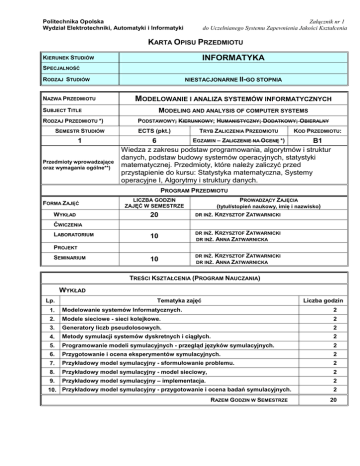 Politechnika Opolska Wydział Elektrotechniki, Automatyki i Informatyki Załącznik nr 1 do Uczelnianego Systemu Zapewnienia Jakości Kształcenia KARTA OPISU PRZEDMIOTU INFORMATYKA KIERUNEK STUDIÓW SPECJALNOŚĆ NIESTACJONARNE II-GO STOPNIA RODZAJ STUDIÓW NAZWA PRZEDMIOTU MODELOWANIE I ANALIZA SYSTEMÓW INFORMATYCZNYCH MODELING AND ANALYSIS OF COMPUTER SYSTEMS SUBJECT TITLE RODZAJ PRZEDMIOTU *) SEMESTR STUDIÓW 1 Przedmioty wprowadzające oraz wymagania ogólne**) PODSTAWOWY; KIERUNKOWY; HUMANISTYCZNY; DODATKOWY; OBIERALNY ECTS (pkt.) TRYB ZALICZENIA PRZEDMIOTU KOD PRZEDMIOTU: EGZAMIN – ZALICZENIE NA OCENĘ *) 6 B1 Wiedza z zakresu podstaw programowania, algorytmów i struktur danych, podstaw budowy systemów operacyjnych, statystyki matematycznej. Przedmioty, które naleŜy zaliczyć przed przystąpienie do kursu: Statystyka matematyczna, Systemy operacyjne I, Algorytmy i struktury danych. PROGRAM PRZEDMIOTU FORMA ZAJĘĆ WYKŁAD PROWADZĄCY ZAJĘCIA (tytuł/stopień naukowy, imię i nazwisko) LICZBA GODZIN ZAJĘĆ W SEMESTRZE 20 DR INś. 10 DR INś. KRZYSZTOF ZATWARNICKI DR INś. ANNA ZATWARNICKA 10 DR INś. KRZYSZTOF ZATWARNICKI DR INś. ANNA ZATWARNICKA KRZYSZTOF ZATWARNICKI ĆWICZENIA LABORATORIUM PROJEKT SEMINARIUM TREŚCI KSZTAŁCENIA (PROGRAM NAUCZANIA) WYKŁAD Lp. Tematyka zajęć Liczba godzin 1. Modelowanie systemów Informatycznych. 2 2. Modele sieciowe - sieci kolejkowe. 2 3. Generatory liczb pseudolosowych. 2 4. Metody symulacji systemów dyskretnych i ciągłych. 2 5. Programowanie modeli symulacyjnych - przegląd języków symulacyjnych. 2 6. Przygotowanie i ocena eksperymentów symulacyjnych. 2 7. Przykładowy model symulacyjny - sformułowanie problemu. 2 8. Przykładowy model symulacyjny - model sieciowy, 2 9. Przykładowy model symulacyjny – implementacja. 2 10. Przykładowy model symulacyjny - przygotowanie i ocena badań symulacyjnych. RAZEM GODZIN W SEMESTRZE 2 20 Nazwa przedmiotu ĆWICZENIA Lp. Tematyka zajęć Liczba godzin 1. 2. RAZEM GODZIN W SEMESTRZE LABORATORIUM Lp. Tematyka zajęć Liczba godzin 1. Omówienie zagadnień programowania z wykorzystaniem środowiska OMNET++ 1 2. Język topologii NED 3 3. Tworzenie i uruchamianie prostej symulacji 2 4. Statystyki – narzędzia Plove oraz Scalar 1 5. Wektory bram i wektory modułów 1 6. Funkcje handleMessage() i initialize(), konstruktor i destruktor 2 RAZEM GODZIN W SEMESTRZE 10 ĆWICZENIA PROJEKTOWE Lp. Tematyka zajęć Liczba godzin 1. 2. RAZEM GODZIN W SEMESTRZE SEMINARIUM Lp. Liczba godzin Tematyka zajęć 1. Analiza własności strumieni Poissona. 1 2. Analiza przełącznika sieciowego. 2 3. Analiza parametrów-miar wydajności systemów M/M/1 i M/M/c ze stratą. 1 4. Analiza systemu M/M/1 z kolejką. 1 5. Obliczanie miar wydajności systemu typu M/M/1/N (zamkniętego). 1 6. Analiza systemu z blokadą całego źródła. 1 7. Obliczanie podstawowych charakterystyk systemów typu M/G/1. 1 8. Drzewa. 2 RAZEM GODZIN W SEMESTRZE 10 ZAŁOśENIA I CELE PRZEDMIOTU: Opanowanie przez studenta umiejętności analizy i oceny jakości systemu, zaplanowania oraz wykonania symulacji systemu komputerowego. Opanowanie umiejętności oceny otrzymanych w wyniku symulacji danych. METODY DYDAKTYCZNE: Wykład: wykład informacyjny, wykład problemowy FORMA I WARUNKI ZALICZENIA PRZEDMIOTU: Wykład – egzamin pisemny, Laboratorium – na podstawie ocen cząstkowych z wykonanych ćwiczeń, Seminarium – na postawie oceny przeprowadzonego seminarium. LITERATURA PODSTAWOWA: [1] Czachórski T., Modele kolejkowe w ocenie efektywności sieci i systemów komputerowych, Wydawnictwo Pracowni Komputerowej Jacka Skalmierskiego, Gliwice 1999. 2 Nazwa przedmiotu [2] Kołodziński E.: Symulacyjne metody badania systemów.Wydawnictwo Naukowe PWN, ISBN: 83-01-13657-X, Warszawa 2002 [3] Menasce D.A., Almeida V.A.F., Capacity planning for Web performance. Metrics, models, and methods. Prentice Hall PTR, New Jersey, 2002 LITERATURA UZUPEŁNIAJĄCA: [1] Gniedenko B.W., Kowalenko I.N., Wstęp do teorii obsługi masowej, PWN, Warszawa 1987. [2] BłaŜewicz J., Cellary W., Słowiński R., Węglarz J., Badania operacyjne dla informatyków, Wydawnictwo Politechniki Poznańskiej, Poznań, 1982. *) niewłaściwe przekreślić – zgodnie z arkuszem planu studiów, **) podać wybrane nazwy przedmiotów stanowiących wprowadzenie/uzupełnienie do przedmiotu opisywanego, oraz zakres wiadomości/umiejętności/kompetencji jakie powinien posiadać student przed rozpoczęciem nauki tego przedmiotu; ............................................................................. ................................................. (Kierownik jednostki organizacyjnej/bezpośredni przełoŜony: pieczęć/podpis) (Dziekan Wydziału …………………: pieczęć/podpis) 3