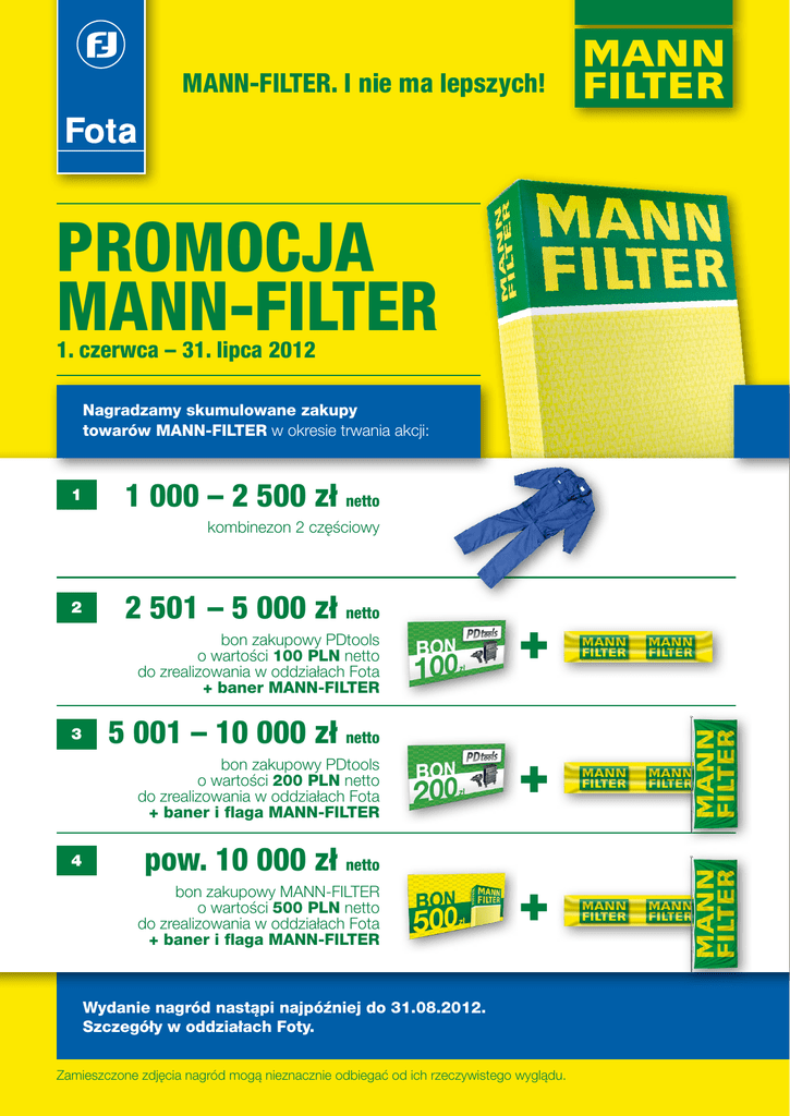 MANN-FILTER. I nie ma lepszych! PROMOCJA MANN-FILTER 1. czerwca – 31. lipca 2012 Nagradzamy skumulowane zakupy towarów MANN-FILTER w okresie trwania akcji: 1 1 000 – 2 500 zł netto kombinezon 2 częściowy 2 2 501 – 5 000 zł netto bon zakupowy PDtools o wartości 100 PLN netto do zrealizowania w oddziałach Fota + baner MANN-FILTER 3 5 001 – 10 000 zł netto bon zakupowy PDtools o wartości 200 PLN netto do zrealizowania w oddziałach Fota + baner i flaga MANN-FILTER 4 pow. 10 000 zł netto bon zakupowy MANN-FILTER o wartości 500 PLN netto do zrealizowania w oddziałach Fota + baner i flaga MANN-FILTER Wydanie nagród nastąpi najpóźniej do 31.08.2012. Szczegóły w oddziałach Foty. Zamieszczone zdjęcia nagród mogą nieznacznie odbiegać od ich rzeczywistego wyglądu.