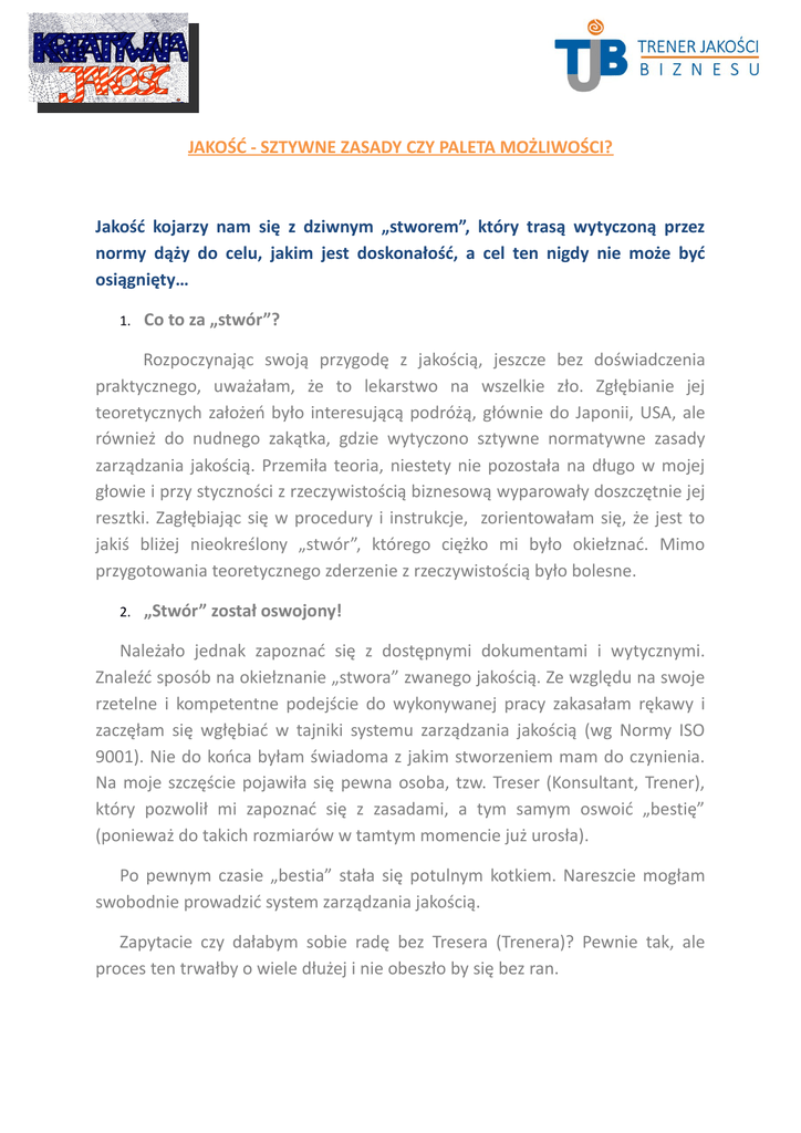 JAKOŚĆ - SZTYWNE ZASADY CZY PALETA MOŻLIWOŚCI? Jakość kojarzy nam się z dziwnym „stworem”, który trasą wytyczoną przez normy dąży do celu, jakim jest doskonałość, a cel ten nigdy nie może być osiągnięty… 1. Co to za „stwór”? Rozpoczynając swoją przygodę z jakością, jeszcze bez doświadczenia praktycznego, uważałam, że to lekarstwo na wszelkie zło. Zgłębianie jej teoretycznych założeń było interesującą podróżą, głównie do Japonii, USA, ale również do nudnego zakątka, gdzie wytyczono sztywne normatywne zasady zarządzania jakością. Przemiła teoria, niestety nie pozostała na długo w mojej głowie i przy styczności z rzeczywistością biznesową wyparowały doszczętnie jej resztki. Zagłębiając się w procedury i instrukcje, zorientowałam się, że jest to jakiś bliżej nieokreślony „stwór”, którego ciężko mi było okiełznać. Mimo przygotowania teoretycznego zderzenie z rzeczywistością było bolesne. 2. „Stwór” został oswojony! Należało jednak zapoznać się z dostępnymi dokumentami i wytycznymi. Znaleźć sposób na okiełznanie „stwora” zwanego jakością. Ze względu na swoje rzetelne i kompetentne podejście do wykonywanej pracy zakasałam rękawy i zaczęłam się wgłębiać w tajniki systemu zarządzania jakością (wg Normy ISO 9001). Nie do końca byłam świadoma z jakim stworzeniem mam do czynienia. Na moje szczęście pojawiła się pewna osoba, tzw. Treser (Konsultant, Trener), który pozwolił mi zapoznać się z zasadami, a tym samym oswoić „bestię” (ponieważ do takich rozmiarów w tamtym momencie już urosła). Po pewnym czasie „bestia” stała się potulnym kotkiem. Nareszcie mogłam swobodnie prowadzić system zarządzania jakością. Zapytacie czy dałabym sobie radę bez Tresera (Trenera)? Pewnie tak, ale proces ten trwałby o wiele dłużej i nie obeszło by się bez ran. 3. Sztywne zasady odstraszają ludzi Przekonałam się na własnej skórze ile trzeba włożyć wysiłku, żeby ustalić czym jest, do czego służy i jak wykorzystywać jakość w środowisku pracy. Gdy pierwszy etap miałam już za sobą i wiedziałam jak tym narzędziem do doskonalenia operować, zapragnęłam je pokazać innym. Opisywanie współpracownikom znanych, ale trudno przyswajalnych zasad w bardziej zrozumiały sposób, wdrażanie metod jakościowych pomagających np. w organizacji pracy na produkcji i tym podobne działania szły jednak bardzo opornie. Prowadzone przeze mnie „szkolenia”, spotkania, moje przemowy i próby przekonania kolegów z firmy o potrzebie stosowania powyższych zasad w końcu zaowocowały, ale bez poparcia przełożonego o pozytywnych wynikach nie mogło być mowy. Wciąż jednak efekt mnie nie zadowalał. Komunikacja związana z jakością pełna była określeń: „jakoś to będzie”, „jakość – bylejakość”. Pracownicy nie utożsamiali się z jakością. Intensywnie myślałam nad tym, w jaki sposób można by było przekonać pracowników firmy do wykorzystywania metod jakościowych. Potrzebowałam narzędzi do przekazywania wiedzy, którą posiadałam. Zapragnęłam zostać Treserem. Zostać Treserem (Trenerem) Zostać Treserem - jak to zrobić? Jak przekazać innym to co mam w głowie, to, czego się dowiedziałam lub nauczyłam, w taki sposób, żeby po pierwsze: chcieli słuchać i po drugie: umieli wykorzystać zdobytą wiedzę w swojej pracy. 4. Potrzebowałam ekwipunku treserskiego… Tak zaczęła się moja wielka przygoda z trenerstwem, wcześniej nazywanym przeze mnie treserstwem. Chciałam uczyć nie dlatego, by tresować ludzi; głowiłam się jak oswajać jakość innym, dla których ona nadal była „stworem”, a może nawet „bestią”. Zdobyłam narzędzia trenerskie, wiedzę i inspiracje. Mogłam teraz zająć się oswajaniem jakości, oswajaniem dla innych (ja już rozumiałam, że daje ona możliwości ulepszania swojego życia). Doświadczeni Trenerzy zainspirowali mnie do działania i do doskonalenia swoich umiejętności nie tylko w dziedzinie jakości. Dzięki temu wewnętrzna motywacja została obudzona z zimowego snu. 5. Stworzyć paletę możliwości – KREATYWNA JAKOŚĆ Mogę teraz realizować swój cel: oswajać jakość, dzięki innowatorskim szkoleniom i warsztatom z serii „Kreatywna Jakość”. Przekazywanie wiedzy dotyczącej jakości w sposób przyjazny, kreatywny i przystępny dla odbiorców stało się moją misją. Widzę w tym prawdziwy potencjał wykraczający poza sferę zawodową - metody jakościowe np. „Metodę rybiej ości - Diagram Ishikawy”, czy „Metodę kart Kanban” można przecież zastosować do usprawniania naszych codziennych czynności, z którymi często musimy się borykać z dużym wysiłkiem. Stosowane podczas moich szkoleń połączenie jakości z kreatywnością, daje szeroką paletę rozwiązań. Korzystanie z koncepcji Dawida E. Kolba („Cykl Kolba”) mówiącej o uczeniu się przez doświadczanie jest jednym z najlepszych sposobów na przekazanie konkretnych rozwiązań problemów. W efekcie przynosi niespodziewane rezultaty, ponieważ ludzie nie lubią być nauczani wysłuchując suchych wywodów teoretycznych, wolą uczyć się sami, za pomocą odkrywania, czy eksperymentowania. Co więcej, chęć niesienia pomocy w zrozumieniu sztywnych zasad norm jakości, przeobraża się u mnie w chęć pomocy innym w odnalezieniu swojej drogi zawodowej. Tak powstaje kolejna koncepcja… Ale to już inna historia. Autor: Maria Wira-Wawrzyniak TJB - Trener Jakości Biznesu Kontakt: [email protected] tel . +48 694 298 483
