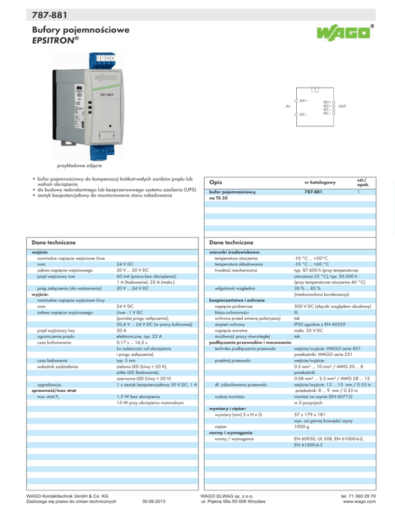 787-881 4 Bufory pojemnościowe EPSITRON® 335 DC+ IN DC– DC+ DC+ DC– DC– OUT przykładowe zdjęcie • bufor pojemnościowy do kompensacji krótkotrwałych zaników prądu lub wahań obciążenia • do budowy redundantnego lub bezprzerwowego systemu zasilania (UPS) • zestyk bezpotencjałowy do monitorowania stanu naładowania Opis nr katalogowy szt./ opak. bufor pojemnościowy, na TS 35 787-881 1 Dane techniczne Dane techniczne wejście: nominalne napięcie wejściowe Uwe nom zakres napięcia wejściowego prąd wejściowy Iwe warunki środowiskowe: temperatura otoczenia temperatura składowania trwałość mechaniczna próg załączenia (do nastawiania) wyjście: nominalne napięcie wyjściowe Uwy nom zakres napięcia wyjściowego prąd wyjściowy Iwy ograniczenie prądu czas buforowania czas ładowania wskaźnik zadziałania sygnalizacja sprawność/moc strat moc strat PV 24 V DC 20 V ... 30 V DC 60 mA (praca bez obciążenia); 1 A (ładowanie); 22 A (maks.) 20 V ... 24 V DC 24 V DC Uwe - 1 V DC (poniżej progu załączenia); 20,4 V ... 24 V DC (w pracy buforowej) 20 A elektroniczne, typ. 22 A 0,17 s ... 16,5 s (w zależności od obciążenia i progu załączenia) typ. 5 min zielona LED (Uwy > 20 V), żółta LED (ładowanie), czerwona LED (Uwy < 20 V) 1 x zestyk bezpotencjałowy 30 V DC, 1 A 1,5 W bez obciążenia 15 W przy obciążeniu nominalnym wilgotność względna bezpieczeństwo i ochrona napięcie probiercze klasa ochronności ochrona przed zmianą polaryzacji stopień ochrony napięcie zwrotne możliwość pracy równoległej podłączanie przewodów i mocowanie: technika podłączania przewodu przekrój przewodu dł. odizolowania przewodu rodzaj montażu wymiary i ciężar: wymiary (mm) S x H x G ciężar normy i wymagania normy / wymagania :$*2.RQWDNWWHFKQLN*PE+&R.* :$*2(/:$*VS]RR =DVWU]HJDVLĊSUDZRGR]PLDQWHFKQLF]Q\FK XO3LĊNQDD:URFáDZ 4 -10 °C ... +50°C -10 °C ... +60 °C typ. 87.600 h (przy temperaturze otoczenia 25 °C); typ. 30.500 h (przy temperaturze otoczenia 40 °C) 30 % ... 85 % (niedozwolona kondensacja) 500 V DC (złączki względem obudowy) III tak IP20 zgodnie z EN 60529 maks. 35 V DC tak wejście/wyjście: WAGO seria 831 przekaźniki: WAGO seria 231 wejście/wyjście: 0.5 mm² ... 10 mm² / AWG 20 ... 8 przekaźnik: 0.08 mm² ... 2.5 mm² / AWG 28 ... 12 wejście/wyjście: 13 ... 15 mm / 0.55 in przekaźnik: 8 ... 9 mm / 0.33 in montaż na szynie (EN 60715) w 2 pozycjach 57 x 179 x 181 wys. od górnej krawędzi szyny 1000 g EN 60950, UL 508, EN 61000-6-2, EN 61000-6-3 WHO ZZZZDJRFRP