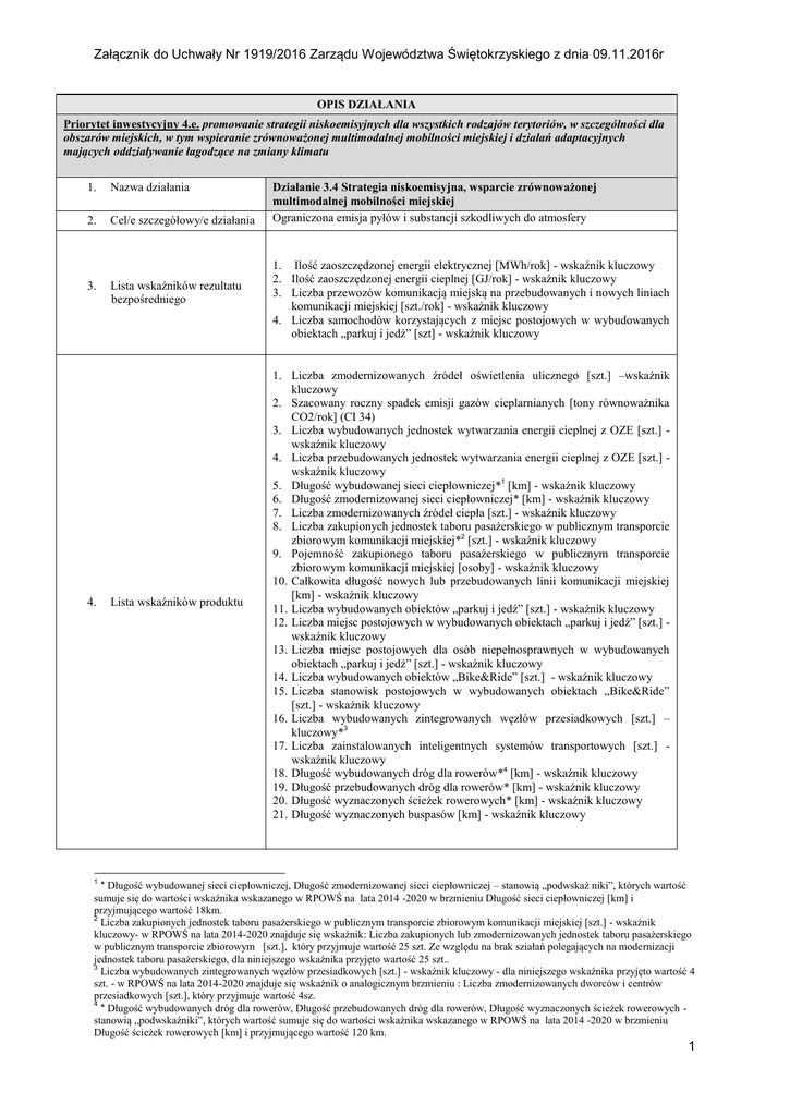 Załącznik do Uchwały Nr 1919/2016 Zarządu Województwa Świętokrzyskiego z dnia 09.11.2016r OPIS DZIAŁANIA Priorytet inwestycyjny 4.e. promowanie strategii niskoemisyjnych dla wszystkich rodzajów terytoriów, w szczególności dla obszarów miejskich, w tym wspieranie zrównoważonej multimodalnej mobilności miejskiej i działań adaptacyjnych mających oddziaływanie łagodzące na zmiany klimatu 1. Nazwa działania 2. Cel/e szczegółowy/e działania 3. 4. Lista wskaźników rezultatu bezpośredniego Lista wskaźników produktu Działanie 3.4 Strategia niskoemisyjna, wsparcie zrównoważonej multimodalnej mobilności miejskiej Ograniczona emisja pyłów i substancji szkodliwych do atmosfery 1. Ilość zaoszczędzonej energii elektrycznej [MWh/rok] - wskaźnik kluczowy 2. Ilość zaoszczędzonej energii cieplnej [GJ/rok] - wskaźnik kluczowy 3. Liczba przewozów komunikacją miejską na przebudowanych i nowych liniach komunikacji miejskiej [szt./rok] - wskaźnik kluczowy 4. Liczba samochodów korzystających z miejsc postojowych w wybudowanych obiektach „parkuj i jedź” [szt] - wskaźnik kluczowy 1. Liczba zmodernizowanych źródeł oświetlenia ulicznego [szt.] –wskaźnik kluczowy 2. Szacowany roczny spadek emisji gazów cieplarnianych [tony równoważnika CO2/rok] (CI 34) 3. Liczba wybudowanych jednostek wytwarzania energii cieplnej z OZE [szt.] wskaźnik kluczowy 4. Liczba przebudowanych jednostek wytwarzania energii cieplnej z OZE [szt.] wskaźnik kluczowy 5. Długość wybudowanej sieci ciepłowniczej*1 [km] - wskaźnik kluczowy 6. Długość zmodernizowanej sieci ciepłowniczej* [km] - wskaźnik kluczowy 7. Liczba zmodernizowanych źródeł ciepła [szt.] - wskaźnik kluczowy 8. Liczba zakupionych jednostek taboru pasażerskiego w publicznym transporcie zbiorowym komunikacji miejskiej*2 [szt.] - wskaźnik kluczowy 9. Pojemność zakupionego taboru pasażerskiego w publicznym transporcie zbiorowym komunikacji miejskiej [osoby] - wskaźnik kluczowy 10. Całkowita długość nowych lub przebudowanych linii komunikacji miejskiej [km] - wskaźnik kluczowy 11. Liczba wybudowanych obiektów „parkuj i jedź” [szt.] - wskaźnik kluczowy 12. Liczba miejsc postojowych w wybudowanych obiektach „parkuj i jedź” [szt.] wskaźnik kluczowy 13. Liczba miejsc postojowych dla osób niepełnosprawnych w wybudowanych obiektach „parkuj i jedź” [szt.] - wskaźnik kluczowy 14. Liczba wybudowanych obiektów „Bike&Ride” [szt.] - wskaźnik kluczowy 15. Liczba stanowisk postojowych w wybudowanych obiektach „Bike&Ride” [szt.] - wskaźnik kluczowy 16. Liczba wybudowanych zintegrowanych węzłów przesiadkowych [szt.] – kluczowy*3 17. Liczba zainstalowanych inteligentnych systemów transportowych [szt.] wskaźnik kluczowy 18. Długość wybudowanych dróg dla rowerów*4 [km] - wskaźnik kluczowy 19. Długość przebudowanych dróg dla rowerów* [km] - wskaźnik kluczowy 20. Długość wyznaczonych ścieżek rowerowych* [km] - wskaźnik kluczowy 21. Długość wyznaczonych buspasów [km] - wskaźnik kluczowy 1 * Długość wybudowanej sieci ciepłowniczej, Długość zmodernizowanej sieci ciepłowniczej – stanowią „podwskaź niki”, których wartość sumuje się do wartości wskaźnika wskazanego w RPOWŚ na lata 2014 -2020 w brzmieniu Długość sieci ciepłowniczej [km] i przyjmującego wartość 18km. 2 Liczba zakupionych jednostek taboru pasażerskiego w publicznym transporcie zbiorowym komunikacji miejskiej [szt.] - wskaźnik kluczowy- w RPOWŚ na lata 2014-2020 znajduje się wskaźnik: Liczba zakupionych lub zmodernizowanych jednostek taboru pasażerskiego w publicznym transporcie zbiorowym [szt.], który przyjmuje wartość 25 szt. Ze względu na brak sziałań polegających na modernizacji jednostek taboru pasażerskiego, dla niniejszego wskaźnika przyjęto wartość 25 szt.. 3 Liczba wybudowanych zintegrowanych węzłów przesiadkowych [szt.] - wskaźnik kluczowy - dla niniejszego wskaźnika przyjęto wartość 4 szt. - w RPOWŚ na lata 2014-2020 znajduje się wskaźnik o analogicznym brzmieniu : Liczba zmodernizowanych dworców i centrów przesiadkowych [szt.], który przyjmuje wartość 4sz. 4 * Długość wybudowanych dróg dla rowerów, Długość przebudowanych dróg dla rowerów, Długość wyznaczonych ścieżek rowerowych stanowią „podwskaźniki”, których wartość sumuje się do wartości wskaźnika wskazanego w RPOWŚ na lata 2014 -2020 w brzmieniu Długość ścieżek rowerowych [km] i przyjmującego wartość 120 km. 1 Załącznik do Uchwały Nr 1919/2016 Zarządu Województwa Świętokrzyskiego z dnia 09.11.2016r Wsparcie mogą uzyskać inwestycje wynikające z planów gospodarki niskoemisyjnych lub planów mobilności miejskiej dla poszczególnych typów obszarów np.: 1. modernizacja oświetlenia ulicznego (ulic placów, terenów publicznych) na energooszczędne, W uzasadnionych przypadkach i w ograniczonym zakresie możliwe jest, zakwalifikowanie częściowej rozbudowy istniejących linii oświetlenia, rozumianej jako jej uzupełnienie, bądź zagęszczenie pod warunkiem spełnienia normy PN EN 13201. Warunkiem dopuszczenia projektu do wsparcia będzie sporządzenie audytu oświetleniowego ex-ante. Ponadto w okresie 12 miesięcy od zakończenia projektu wymaganym będzie przeprowadzenie audytu oświetleniowego ex-post. W związku z czym konieczne jest złożenie deklaracji o przeprowadzeniu tego audytu w okresie, o którym mowa powyżej. Nie jest natomiast możliwe zakwalifikowanie do dofinansowania budowy nowych odcinków oświetlenia. 2. budowa lub modernizacja sieci ciepłowniczej, Dofinansowanie będą mogły uzyskać inwestycje w zakresie modernizacji i budowy scentralizowanych systemów ciepłowniczych oraz przedsięwzięcia polegające na wymianie bądź modernizacji źródeł ciepła z uwzględnieniem standardów ekologicznych. Wzmocnieniu efektów realizowanych projektów będą służyć inteligentne systemy zarządzania energi