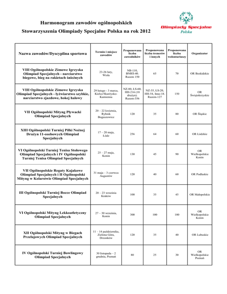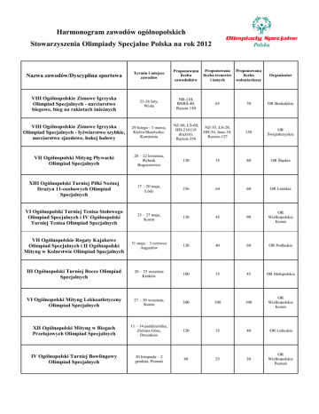 Harmonogram zawodów ogólnopolskich Stowarzyszenia Olimpiady Specjalne Polska na rok 2012 Proponowana Proponowana liczba liczba trenerów wolontariuszy i innych Nazwa zawodów/Dyscyplina sportowa Termin i miejsce zawodów Proponowana liczba zawodników VIII Ogólnopolskie Zimowe Igrzyska Olimpiad Specjalnych - narciarstwo biegowe, bieg na rakietach śnieżnych 23-26 luty, Wisła NB-110, BNRŚ-40. Razem 150 65 70 OR Beskidzkie VIII Ogólnopolskie Zimowe Igrzyska Olimpiad Specjalnych - łyżwiarstwo szybkie, narciarstwo zjazdowe, hokej halowy 29 lutego - 3 marca, Kielce/SkarżyskoKamienna NZ-80, ŁS-60, HH-216 (18 drużyn). Razem-356 NZ-35, ŁS-20, HH-54, Inne-18. Razem-127 150 OR Świętokrzyskie VII Ogólnopolski Mityng Pływacki Olimpiad Specjalnych 20 – 22 kwietnia, Rybnik Boguszowice 120 35 80 OR Śląskie XIII Ogólnopolski Turniej Piłki Nożnej Drużyn 11-osobowych Olimpiad Specjalnych 17 – 20 maja, Łódz 256 64 60 OR Łódzkie VI Ogólnopolski Turniej Tenisa Stołowego Olimpiad Specjalnych i IV Ogólnopolski Turniej Tenisa Olimpiad Specjalnych 25 – 27 maja, Konin 130 45 90 OR Wielkopolskie Konin VII Ogólnopolskie Regaty Kajakowe Olimpiad Specjalnych i II Ogólnopolski Mityng w Kolarstwie Olimpiad Specjalnych 31 maja – 3 czerwca Augustów 120 40 60 OR Podlaskie III Ogólnopolski Turniej Bocce Olimpiad Specjalnych 20 – 23 września Kraków 100 35 45 OR Małopolskie VI Ogólnopolski Mityng Lekkoatletyczny Olimpiad Specjalnych 27 – 30 września, Konin 300 100 100 OR Wielkopolskie Konin XII Ogólnopolski Mityng w Biegach Przełajowych Olimpiad Specjalnych 11 – 14 października, Zielona Góra, Drzonków 120 35 40 OR Lubuskie IV Ogólnopolski Turniej Bowlingowy Olimpiad Specjalnych 30 listopada – 2 grudnia, Poznań 80 25 30 OR Wielkopolskie Poznań Organizator