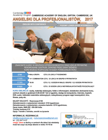 CAMBRIDGE ACADEMY OF ENGLISH, GIRTON / CAMBRIDGE, UK ENGLISH WITH CONFIDENCE POZIOMY LOWER-UPPER INTERMEDIATE ZNAKOMITE KURSY W GRUPACH CZTEROOSOBOWYCH ORAZ LEKCJE PRYWATNE. RENOMOWANE CENTRUM, CENIONE PRZEZ ŚWIAT BIZNESU KURS MOŻESZ ROZPOCZĄĆ W KAŻDY PONIEDZIAŁEK ROKU £795 MAŁA GRUPA £1095 5+1 COMBINATION CZYLI 25 LEKCJI W GRUPIE+5 PRYWATNYCH £1395 50:50 CZYLI 12, 5 GODZIN W MAŁEJ GRUPIE I 12,5 GODZIN PRYWATNYCH £1825 1:1 CZYLI 25 GODZIN LEKCJI INDYWIDUALNYCH/TAKŻE POCZĄTKUJĄCY CZYLI 25 LEKCJI TYGODNIOWO KURS OBEJMUJE: naukę, materiały edukacyjne, folder z informacjami, świadectwo ukończenia kursu, centrum otwarte w godzinach 8.00-22.00 7 dni w tygodniu, dostęp do komputerów, Internetu, kopiarki, DVD, audio i biblioteki materiałów edukacyjnych, subsydiowany program zajęć towarzyskich, kino, fitness, puby etc. NALEŻY DOLICZYĆ : Rezerwacja:£100 Zakwaterowanie z wyżywieniem standard £153 tygodniowo Zakwaterowanie z wyżywieniem, prywatna łazienka £210 tygodniowo, Opcje hotele, B&B £65, £95-200 doba Transfer bankowy £15 Opcja: Transfer z lotniska, cenniki na życzenie INFORMACJE, REZERWACJE: [email protected] ; [email protected] tel : (22) 84714 87 uwaga: latem w okolicy w centrach dla dzieci lub młodzieży może też uczyć się twoje dziecko w wieku 10-16 lat