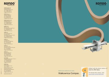 RONDO Burgdorf AG Heimiswilstrasse 42 3400 Burgdorf/Switzerland Tel. +41 (0)34 420 81 11 Fax +41 (0)34 420 81 99 [email protected] RONDO Schio s.r.l. Via Lago di Albano, 86 36015 Schio (VI)/Italy Tel. +39 0445 575 429 Fax +39 0445 575 317 [email protected] RONDO GmbH & Co. KG Hoorwaldstrasse 44 57299 Burbach/Germany Tel. +49 (0)2736 203-0 Fax +49 (0)2736 203130 [email protected] RONDO S.à.r.l. PAE «Les Pins» 67319 Wasselonne cedex/France Tel. +33 (0)3 88 59 11 88 Fax +33 (0)3 88 59 11 77 [email protected] RONDO Ltd. Unit 7, Chessington Park Lion Park Avenue Chessington, Surrey KT9 1ST/UK Tel. +44 (0)20 8391 1377 Fax +44 (0)20 8391 5878 [email protected] RONDO Inc. 51 Joseph Street Moonachie, N.J. 07074/USA Tel. +1 201 229 97 00 Fax +1 201 229 00 18 [email protected] RONDO Inc. 267 Canarctic Drive Downsview, Ont. M3J 2N7/Canada Tel. +1 416 650 0220 Fax +1 416 650 9540 [email protected] RONDO S.r.l. Via Lago di Albano, 86 36015 Schio (VI)/Italy Tel. +39 0445 576 635 Fax +39 0445 576 641 [email protected] 213.en/D1-30 OOO RONDO Varschavskoge Chaussée, D 17, Str. 3 117105 Moscow/Russia Tel. +7 (495) 786 39 06 Fax +7 (495) 788 98 20 [email protected] RONDO Asia Regional Office No. 14–1 Mezzanine Floor Jalan 11/116B Kuchai Entrepreneurs Park Off Jalan Kuchai Lama 58200 Kuala Lumpur/Malaysia Tel. +60 3 7984 55 20 Fax +60 3 7984 55 95 [email protected] www.rondo-online.com Elektroniczna wałkownica do ciasta : Wałkownica Compas . `Ìi`ÊÜÌ ÊÌ iÊ`iÊÛiÀÃÊvÊ vÝÊ*ÀÊ*Ê`ÌÀÊ /ÊÀiÛiÊÌ ÃÊÌVi]ÊÛÃÌ\Ê ÜÜܰVi°VÉÕV° Ì Compas 3 W jaki sposób można produkować ciasto wysokiej jakości ? Za pomocą elastycznej i niezawodnej wałkownicy. Oszczędzanie jest proste Wałkownica Compas będzie przetwarzać twoje ciasto w sposób regularny i konsekwentny. Jakiekolwie błędy czy wahania są praktycznie niemożliwe. Zaoszczędzisz czas i pieniądze. Na kolorowym ekranie dotykowym poruszasz się za pomocą łatwych do zrozumienia symboli, niezależnie od języka Każdego dnia produkujesz duże ilości wywałkowanych bloków ciasta do wyrobu swoich produktów. To co jest dla Ciebie ważne to stała jakość, szybka produkcja oraz uniwersalność. Wałkowanica Compas jest partnerem dla Ciebie. Stworzona do dużej masowej produkcji, bardzo wytrzymała, prosta w obsłudze. Compas może przetworzyć wszystkie rodzaje ciast na bloki, oraz regularne wstęgi ciasta - niezawodnie, delikatnie i szybko. Cztery najważniejsze korzyści 1. Perfekcyjne wałkowanie wszystkich rodzajów ciast Z Compasem możesz wywałkować każdy rodzaj ciasta • Regulowana prędkość wałkowania • Róźna prędkość nawijania • Stały nacisk dzięki specjalnemu systemowi zgarniaczy• Dokładna kontrola gwarantuje minimalne zużycie mąki w posypywaczu 3. Solidna konstrukcja Compas jest przystosowany do długoterminowej pracy. • Solidna i mocna podstawa • Stal nierdzewna • Stały profil • Mobilny, zamontowane kółka 2. Nowoczesna i łatwa w obsłudze Twoi pracownicy będą pracować intuicyjnie na Compasie 4. Higieniczny design Czyszczenie można przeprowadzić w bardzo krótkim czasie • Gładka powierzchnia ze stali nierdzewnej • Składane stoły • Automatyczne czyszczenie fotokomórek • Minimalny kontakt z pyłem mąki dzięki pokrywie ochronnej z minimalnym wysiłkiem • Kolorowy ekran dotykowy z dużymi, łatwymi do zrozumienia symbolami • Bezpośrednia nawigacja z menu • Codzienne regulacje mogą być dokonywane łatwo i szybko • Przechowywanie programów na USB Twoi pracownicy będą zachwyceni łatwością z jaką można pracować na Compasie, dzięki zaprogramowaniej liście i dużych symbolach. Delikatne nawijanie Wstęgi ciasta są nawijane delikatnie i automatycznie. Prędkość nawijania może być optymalnie regulowana w zależności od rodzaju i charakterystyki ciasta. Automatyczna i ręczna obsługa może być stale obserwowana. Dane techniczne Compas 3000 SFA6127H.A1 Konstrukcja ze stali nierdzewnej Mobilna, stabilna podstawa Szerokość taśmy transportującej 640 mm Szerokość stołu 650 mm Ogólna długość stołu 3505 mm Długość wałka 660 mm otwarcie kraty zabezpiecz. 90 mm Szczelina wałka 0.2 – 45 mm Prędkość taśmy 50 – 96 cm/sec. Moc znamionowa 2.0 kVA/1.2 kW Zasilanie 3 x 200-460 V, 50/60 Wymagana przestrzeń (mm) • w pozycji pracy • w pozycji odpoczynku 1260 × 3820 mm 1260 × 3505 mm Waga 420 kg Prawo do wprowadzania zmian technicznych zastrzeżone. `Ìi`ÊÜÌ ÊÌ iÊ`iÊÛiÀÃÊvÊ vÝÊ*ÀÊ*Ê`ÌÀÊ /ÊÀiÛiÊÌ ÃÊÌVi]ÊÛÃÌ\Ê ÜÜܰVi°VÉÕV° Ì