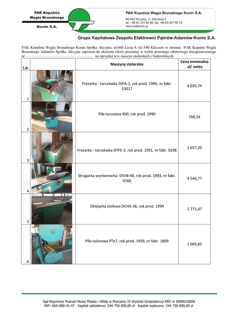 PAK Kopalnia Węgla Brunatnego Konin Spółka Akcyjna, ul.600 Lecia 9, 62-540 Kleczew w imieniu PAK Kopalni Węgla Brunatnego Adamów Spółka Akcyjna zaprasza do złożenia oferty pisemnej w trybie przetargu ofertowego nieograniczonego nr …………………………………………….. na sprzedaż n/w maszyn stolarskich i budowlanych L.p. Maszyny stolarskie Cena minimalna zł/ netto Frezarko - tarczówka DJFA-2, rok prod. 1990, nr fabr. 53017 4 035,74 1 Piła tarczowa 400, rok prod. 1990 768,54 2 Frezarko - tarczówka DYFE-2, rok prod. 1991, nr fabr. 9298 2 657,20 3 Strugarka wyrówniarka DSVB-40, rok prod. 1993, nr fabr. 0166 4 546,77 4 Oklejarka stołowa DCHA-36, rok prod. 1994 1 771,47 5 Piła taśmowa PTe7, rok prod. 1959, nr fabr. 1809 1 003,83 6 Sąd Rejonowy Poznań-Nowe Miasto i Wilda w Poznaniu IX Wydział Gospodarczy KRS nr 0000010058 NIP: 665-000-31-47 Kapitał zakładowy: 244 750 000,00 zł Kapitał wpłacony: 244 750 000,00 zł Oklejarka DCGA-II, rok prod. 2002, nr fabr. 0283 3 129,58 Frezarka do obrzeży z zespołem obcinającym DFOA-II, rok prod. 2002, nr fabr. 0221034 2 657,20 Instalacja odwirowania OF - 523, WPT - 31 RDO, rok prod. 1998, nr fabr. 1027 4 192,48 7 8 9 Trak rok prod. 1985 856,21 10 Szlifierka NPA 140 rok prod. 1985, nr fabr. 9100078 88,58 11 Stół stolarski rok prod. 1985, nr fabr. 9050216 27,56 12 Sąd Rejonowy Poznań-Nowe Miasto i Wilda w Poznaniu IX Wydział Gospodarczy KRS nr 0000010058 NIP: 665-000-31-47 Kapitał zakładowy: 244 750 000,00 zł Kapitał wpłacony: 244 750 000,00 zł Maszyny budowlane/ inne L.p. Betoniarka BWE 350, rok prod. 1991, nr fabr. 20 Cena minimalna zł/ netto 472,40 1 Betoniarka MU - 50, rok prod. 1997, nr fabr. 344 118,10 2 Betoniarka BWE 150, rok prod. 1985,nr fabr. 9290696 196,83 3 Betoniarka BWE 250, rok prod. 1985, nr fabr. 9290764 238,00 4 Betoniarka BWE 250, rok prod. 1985, nr fabr. 9290436 5 6 Brak zdjęcia 7 Brak zdjęcia Nożyce mechaniczne rok prod. 1985, nr fabr. 9150027 Giętarka mechaniczna rok prod. 1985, nr fabr. 9150024 238,00 413,34 472,39 Oferty: 1.Oferty będą przyjmowane: do 25.10.2016 r. do godz. 10:00. 2.Oferty należy składać z wykorzystaniem Internetowej Platformy Zakupowej Logintrade lub w zaklejonych kopertach w sekretariacie Działu Zakupów EZ w Kazimierzu Biskupim, pokój nr 15 „z nazwą obrabiarki na kopercie i pozycji”. 3.Oferta będzie wiążąca 30 dni od zakończenia zbierania ofert określonego w niniejszym zaproszeniu. 4.Oferta musi zawierać: - pełne dane Oferenta składającego ofertę, - cenę jednostkową netto w PLN za poszczególny środek trwały, - polecenie przelewu wpłaconego wadium (kopia), - aktualny odpis z właściwego rejestru KRS, bądź wydruk z Centralnej Informacji Krajowego Rejestru Sądowego albo aktualne zaświadczenie o wpisie do ewidencji działalności gospodarczej, bądź wydruk z Centralnej Ewidencji i Informacji o Działalności Gospodarczej, wystawione nie wcześniej niż 6 miesięcy przed upływem terminu składania oferty (dotyczy podmiotów gospodarczych), - zaświadczenie o nadaniu numeru Identyfikacji Podatkowej NIP (dotyczy podmiotów gospodarczych), - zaświadczenie o nadaniu numeru identyfikacyjnego REGON (dotyczy podmiotów gospodarczych), - polecenie przelewu wpłaconego wadium (kopia), - wypełnione „Oświadczenie” wg wzoru w załączniku (poniższy formularz do pobrania w intranecie oraz w Dziale Zakupów EZ pokój nr 17), - podpis Oferenta. Sąd Rejonowy Poznań-Nowe Miasto i Wilda w Poznaniu IX Wydział Gospodarczy KRS nr 0000010058 NIP: 665-000-31-47 Kapitał zakładowy: 244 750 000,00 zł Kapitał wpłacony: 244 750 000,00 zł 5.W przypadku chęci uczestnictwa w przetargu na kilka środków trwałych Oferent jest zobowiązany do złożenia każdej oferty w osobnej kopercie. 6.Otwarcie ofert nastąpi bez obecności Oferentów. O wynikach przetargu PAK KWB Konin S.A poinformuje wszystkich oferentów drogą elektroniczną. 7.Kryterium wyboru oferty: najkorzystniejsza dla PAK KWB Konin S.A. Za najkorzystniejszą ofertę uznana zostanie oferta, w której zaoferowano najwyższą cenę jednostkową netto zakupu za środek trwały. Warunkiem uczestnictwa w przetargu jest wpłacenie wadium w wysokości 10% ceny minimalnej wystawionego do przetargu środka trwałego. Wadium należy wpłacać na konto PAK Kopalnia Węgla Brunatnego Adamów S.A.: BZ WBK S.A. I Oddział w Turku nr 36 1090 1229 0000 0000 2201 3588. 1.Wadium złożone przez Oferentów, których oferty nie zostały przyjęte, podlega zwrotowi po dokonaniu wyboru oferty, a Oferentowi, którego oferta została przyjęta będzie zarachowane na poczet ceny. 2.W razie ustalenia, że kilku Oferentów zaoferowało tę samą najwyższą cenę prowadzący przetarg będzie kontynuował niezwłocznie przetarg w formie licytacji ustnej miedzy tymi Oferentami, przyjmując jako cenę wywoławczą kwotę zgłoszoną w ofertach. Postąpienie w licytacji ustnej nie może być niższe niż 1% ceny wywoławczej. Podstawa odrzucenia oferty: 1.Niezgodność oferty z kryteriami sprzedaży zawartymi w specyfikacji warunków odbioru środków trwałych. 2.Brak kompletności oferty i załączonych dokumentów. 3.Oferty z zaproponowanymi cenami niższymi od ceny minimalnej. 4.Wadium przepada na rzecz Spółki jeżeli: - Oferent, którego oferta zostanie przyjęta nie uiści ceny nabycia w terminie nie dłuższym niż 14 dni od dnia przetargu, Oferent ten traci również prawo do zakupu środka trwałego. Wystawione do sprzedaży obrabiarki można oglądać w Dziale AG (62-700 Turek, Warenka 23 ) w dniach 21-24.10.2016r. w godz. od 630 do 1330 Informacje: 1.W sprawach formalnych: a) formalnych - Paweł Radzik Dział EZ – Kazimierz Biskupi tel. 63/247 53 95, e-mail: [email protected], b) technicznych : - Józef Cajdler Oddział AG – Warenka 23 tel. 63 278 7692, e-mail: [email protected] 2.Komunikacja z Oferentami w trakcie procesu sprzedaży środków trwałych będzie prowadzona pocztą elektronic