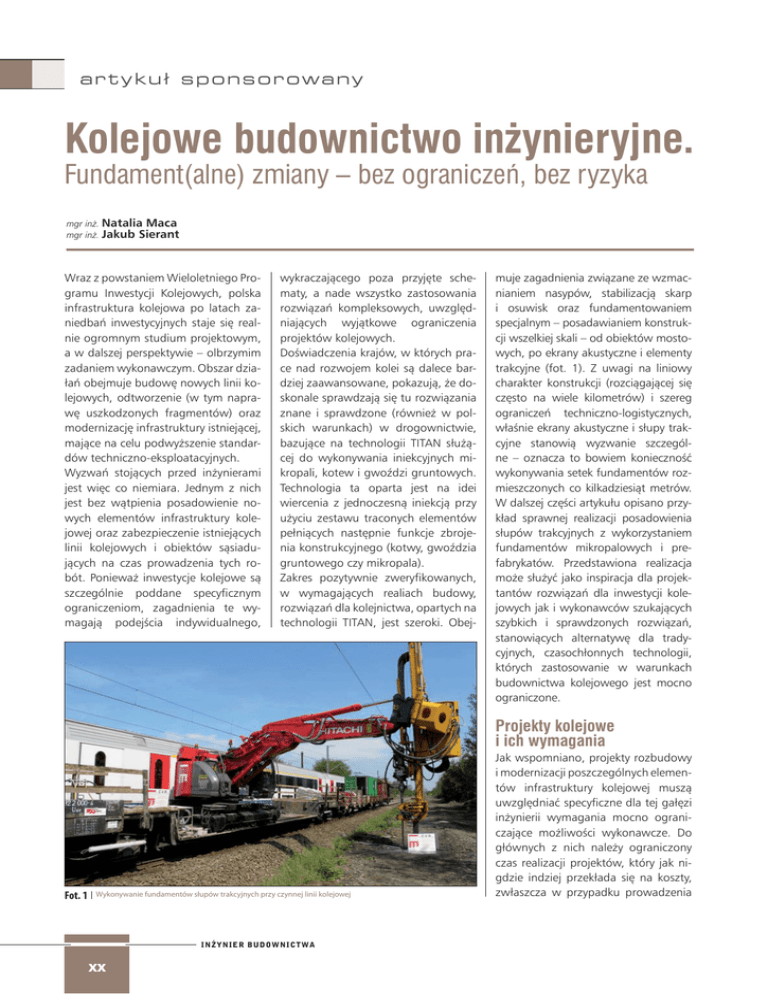 ar t y k u ł sp onsor o w an y Kolejowe budownictwo inżynieryjne. Fundament(alne) zmiany – bez ograniczeń, bez ryzyka mgr inż. Natalia Maca mgr inż. Jakub Sierant Wraz z powstaniem Wieloletniego Programu Inwestycji Kolejowych, polska infrastruktura kolejowa po latach zaniedbań inwestycyjnych staje się realnie ogromnym studium projektowym, a w dalszej perspektywie – olbrzymim zadaniem wykonawczym. Obszar działań obejmuje budowę nowych linii kolejowych, odtworzenie (w tym naprawę uszkodzonych fragmentów) oraz modernizację infrastruktury istniejącej, mające na celu podwyższenie standardów techniczno-eksploatacyjnych. Wyzwań stojących przed inżynierami jest więc co niemiara. Jednym z nich jest bez wątpienia posadowienie nowych elementów infrastruktury kolejowej oraz zabezpieczenie istniejących linii kolejowych i obiektów sąsiadujących na czas prowadzenia tych robót. Ponieważ inwestycje kolejowe są szczególnie poddane specyficznym ograniczeniom, zagadnienia te wymagają podejścia indywidualnego, wykraczającego poza przyjęte schematy, a nade wszystko zastosowania rozwiązań kompleksowych, uwzględniających wyjątkowe ograniczenia projektów kolejowych. Doświadczenia krajów, w których prace nad rozwojem kolei są dalece bardziej zaawansowane, pokazują, że doskonale sprawdzają się tu rozwiązania znane i sprawdzone (również w polskich warunkach) w drogownictwie, bazujące na technologii TITAN służącej do wykonywania iniekcyjnych mikropali, kotew i gwoździ gruntowych. Technologia ta oparta jest na idei wiercenia z jednoczesną iniekcją przy użyciu zestawu traconych elementów pełniących następnie funkcje zbrojenia konstrukcyjnego (kotwy, gwoździa gruntowego czy mikropala). Zakres pozytywnie zweryfikowanych, w wymagających realiach budowy, rozwiązań dla kolejnictwa, opartych na technologii TITAN, jest szeroki. Obej- muje zagadnienia związane ze wzmacnianiem nasypów, stabilizacją skarp i osuwisk oraz fundamentowaniem specjalnym – posadawianiem konstrukcji wszelkiej skali – od obiektów mostowych, po ekrany akustyczne i elementy trakcyjne (fot. 1). Z uwagi na liniowy charakter konstrukcji (rozciągającej się często na wiele kilometrów) i szereg ograniczeń techniczno-logistycznych, właśnie ekrany akustyczne i słupy trakcyjne stanowią wyzwanie szczególne – oznacza to bowiem konieczność wykonywania setek fundamentów rozmieszczonych co kilkadziesiąt metrów. W dalszej części artykułu opisano przykład sprawnej realizacji posadowienia słupów trakcyjnych z wykorzystaniem fundamentów mikropalowych i prefabrykatów. Przedstawiona realizacja może służyć jako inspiracja dla projektantów rozwiązań dla inwestycji kolejowych jak i wykonawców szukających szybkich i sprawdzonych rozwiązań, stanowiących alternatywę dla tradycyjnych, czasochłonnych technologii, których zastosowanie w warunkach budownictwa kolejowego jest mocno ograniczone. Projekty kolejowe i ich wymagania Fot. 1 Wykonywanie fundamentów słupów trakcyjnych przy czynnej linii kolejowej INŻYNIER BUDOWNICTWA 66 xx Jak wspomniano, projekty rozbudowy i modernizacji poszczególnych elementów infrastruktury kolejowej muszą uwzględniać specyficzne dla tej gałęzi inżynierii wymagania mocno ograniczające możliwości wykonawcze. Do głównych z nich należy ograniczony czas realizacji projektów, który jak nigdzie indziej przekłada się na koszty, zwłaszcza w przypadku prowadzenia ar t y k u ł sp onsor o w an y prac budowlanych kosztem czasowego zamknięcia działającego połączenia – tu nie ma czasu na błędy. Znacząco ograniczony jest również teren inwestycji, co wyklucza rozwiązania wymagające użycia ciężkiego sprzętu, szerokiego zakresu prac ziemnych i dużego zaplecza budowy czy dróg technologicznych. W warunkach rosnących wymagań użytkowników linii kolejowych, priorytetem zarządcy infrastruktury Rys. 1 Lokalizacja linii 162 w Belgii trasowej staje się czas realizacji i możliwość zachowania ciąZastosowane rozwiązania muszą zagłości ruchu podczas prowadzenia tem zapewnić bezawaryjną pracę poinwestycji. Wymaganie te praktycznie ciągów, a jednocześnie bezpieczeńeliminują z zastosowania technologie stwo ekip budowlanych, co wiąże się przestarzałe, czasochłonne, oparte na z minimalną ingerencją w istniejącą technikach tradycyjnych (jak choćby konstrukcję i zabezpieczeniem przed rozbiórka i formowanie na nowo naoddziaływaniami dynamicznymi. sypu). Projekty te są po prostu zbyt drogie, szczególnie po uwzględnieniu Modernizacja linii kolejowej całości kosztów i tzw. utraconych ko162 w Belgii rzyści. Ponadto linie kolejowe często Wszystkie powyżej opisane trudności przebiegają przez obszary ochrony i wyzwania stanęły przed inżynierami flory i fauny, gdzie roboty ziemne infirmy TUC Rail, która była odpowiegerujące w krajobraz są wykluczone ze dzialna za wykonanie projektu, kierowzględu na warunki środowiskowe. wanie pracami i nadzór nad nimi w ramach reelektryfikacji linii kolejowej 162 Praca przy liniach kolejowych rozsiaw Belgii. Linia ta łączy Namur z graninych na terenie całego kraju, często cą Luksemburga w Arlon. Ukończona będących jedynymi drogami komuniw 1859 roku obejmuje ok. 150 km kacyjnymi na ubogich infrastrukturali wraz z linią kolejową 161 oraz luknie terenach, stanowi także nie lada semburską linią 50 zapewnia połączewyzwanie logistyczne. Zapewnienie nie kolejowe Brukseli i Luksemburga dostępu dla sprzętu, doprowadzenie (rys. 1). W 1960 roku linia została niezbędnych mediów do quasi-stacjow całości zelektryfikowana. narnych, szybko przemieszczających W ramach dużego programu prac się wraz z frontem robót placów bumodernizacyjnych belgijskich linii kodowy, jest trudne i kosztowne, a nielejowych, mających na celu znaczące jednokrotnie wręcz niemożliwe. Rozskrócenie czasu podróży, w 2009 roku sądne jest więc uniezależnienie si