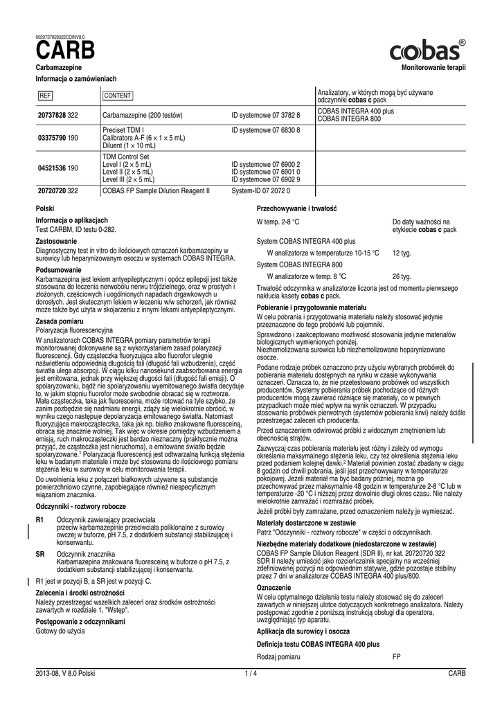 0020737828322COINV8.0 CARB Carbamazepine Monitorowanie terapii Informacja o zamówieniach REF CONTENT 20737828 322 Carbamazepine (200 testów) ID systemowe 07 3782 8 Preciset TDM I Calibrators A-F (6 × 1 × 5 mL) Diluent (1 × 10 mL) TDM Control Set Level I (2 × 5 mL) Level II (2 × 5 mL) Level III (2 × 5 mL) COBAS FP Sample Dilution Reagent II ID systemowe 07 6830 8 03375790 190 04521536 190 20720720 322 Analizatory, w których mogą być używane odczynniki cobas c pack COBAS INTEGRA 400 plus COBAS INTEGRA 800 ID systemowe 07 6900 2 ID systemowe 07 6901 0 ID systemowe 07 6902 9 System-ID 07 2072 0 Polski Przechowywanie i trwałość Informacja o aplikacjach Test CARBM, ID testu 0‑282. W temp. 2‑8 °C Zastosowanie Diagnostyczny test in vitro do ilościowych oznaczeń karbamazepiny w surowicy lub heparynizowanym osoczu w systemach COBAS INTEGRA. System COBAS INTEGRA 400 plus Podsumowanie Karbamazepina jest lekiem antyepileptycznym i opócz epilepsji jest także stosowana do leczenia nerwobólu nerwu trójdzielnego, oraz w prostych i złożonych, częściowych i uogólnionych napadach drgawkowych u dorosłych. Jest skutecznym lekiem w leczeniu w/w schorzeń, jak również może także być użyta w skojarzeniu z innymi lekami antyepileptycznymi. Zasada pomiaru Polaryzacja fluorescencyjna W analizatorach COBAS INTEGRA pomiary parametrów terapii monitorowanej dokonywane są z wykorzystaniem zasad polaryzacji fluorescencji. Gdy cząsteczka fluoryzująca albo fluorofor ulegnie naświetleniu odpowiednią długością fali (długość fali wzbudzenia), część światła ulega absorpcji. W ciągu kilku nanosekund zaabsorbowana energia jest emitowana, jednak przy większej długości fali (długość fali emisji). O spolaryzowaniu, bądź nie spolaryzowaniu wyemitowanego światła decyduje to, w jakim stopniu fluorofor może swobodnie obracać się w roztworze. Mała cząsteczka, taka jak fluoresceina, może rotować na tyle szybko, że zanim pozbędzie się nadmiaru energii, zdąży się wielokrotnie obrócić, w wyniku czego następuje depolaryzacja emitowanego światła. Natomiast fluoryzująca makrocząsteczka, taka jak np. białko znakowane fluoresceiną, obraca się znacznie wolniej. Tak więc w okresie pomiędzy wzbudzeniem a emisją, ruch makrocząsteczki jest bardzo nieznaczny (praktycznie można przyjąć, że cząsteczka jest nieruchoma), a emitowane światło będzie spolaryzowane.1 Polaryzacja fluorescencji jest odtwarzalną funkcją stężenia leku w badanym materiale i może być stosowana do ilościowego pomiaru stężenia leku w surowicy w celu monitorowania terapii. Do uwolnienia leku z połączeń białkowych używane są substancje powierzchniowo czynne, zapobiegające również niespecyficznym wiązaniom znacznika. Odczynniki - roztwory robocze R1 Odczynnik zawierający przeciwciała przeciw karbamazepinie przeciwciała poliklonalne z surowicy owczej w buforze, pH 7.5, z dodatkiem substancji stabilizującej i konserwantu. SR Odczynnik znacznika Karbamazepina znakowana fluoresceiną w buforze o pH 7.5, z dodatkiem substancji stabilizującej i konserwantu. R1 jest w pozycji B, a SR jest w pozycji C. Zalecenia i środki ostrożności Należy przestrzegać wszelkich zaleceń oraz środków ostrożności zawartych w rozdziale 1, "Wstęp". Postępowanie z odczynnikami Gotowy do użycia W analizatorze w temperaturze 10‑15 °C Do daty ważności na etykiecie cobas c pack 12 tyg. System COBAS INTEGRA 800 W analizatorze w temp. 8 ℃ 26 tyg. Trwałość odczynnika w analizatorze liczona jest od momentu pierwszego nakłucia kasety cobas c pack. Pobieranie i przygotowanie materiału W celu pobrania i przygotowania materiału należy stosować jedynie przeznaczone do tego probówki lub pojemniki. Sprawdzono i zaakceptowano możliwość stosowania jedynie materiałów biologicznych wymienionych poniżej. Niezhemolizowana surowica lub niezhemolizowane heparynizowane osocze. Podane rodzaje próbek oznaczono przy użyciu wybranych probówek do pobierania materiału dostępnych na rynku w czasie wykonywania oznaczeń. Oznacza to, że nie przetestowano probówek od wszystkich producentów. Systemy pobierania próbek pochodzące od różnych producentów mogą zawierać różniące się materiały, co w pewnych przypadkach może mieć wpływ na wynik oznaczeń. W przypadku stosowania probówek pierwotnych (systemów pobierania krwi) należy ściśle przestrzegać zaleceń ich producenta. Przed oznaczeniem odwirować próbki z widocznym zmętnieniem lub obecnością strątów. Zazwyczaj czas pobierania materiału jest różny i zależy od wymogu określania maksymalnego stężenia leku, czy też określenia stężenia leku przed podaniem kolejnej dawki.2 Materiał powinien zostać zbadany w ciągu 8 godzin od chwili pobrania, jeśli jest przechowywany w temperaturze pokojowej. Jeżeli materiał ma być badany później, można go przechowywać przez maksymalnie 48 godzin w temperaturze 2‑8 °C lub w temperaturze ‑20 °C i niższej przez dowolnie długi okres czasu. Nie należy wielokrotnie zamrażać i rozmrażać próbek. Jeżeli próbki były zamrażane, przed oznaczeniem należy je wymieszać. Materiały dostarczone w zestawie Patrz "Odczynniki - roztwory robocze" w części o odczynnikach. Niezbędne materiały dodatkowe (niedostarczone w zestawie) COBAS FP Sample Dilution Reagent (SDR II), nr kat. 20720720 322 SDR II należy umieścić jako rozcieńczalnik specjalny na wcześniej zdefiniowanej pozycji na odpowiednim statywie, gdzie pozostaje stabilny przez 7 dni w analizatorze COBAS INTEGRA 400 plus/800. Oznaczenie W celu optymalnego działania testu należy stosować się do zaleceń zawartych w niniejszej ulotce dotyczących konkretnego analizatora. Należy postępować zgodnie z poniższą instrukcją obsługi dla operatora, uwzględniając typ aparatu. Aplikacja dla surowicy i osocza Definicja testu COBAS INTEGRA 400 plus Rodzaj pomiaru 2013-08, V 8.0 Polski 1/4 FP CARB 00