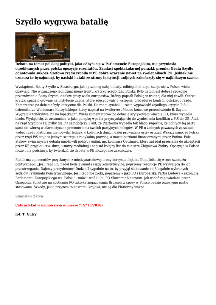 Szydło wygrywa batalię Debata na temat polskiej polityki, jaka odbyła się w Parlamencie Europejskim, nie przyniosła oczekiwanych przez polską opozycję rezultatów. Zamiast spektakularnej porażki, premier Beata Szydło odnotowała sukces. Szefowa rządu zrobiła w PE dobre wrażenie nawet na zwolennikach PO. Jednak nie oznacza to bynajmniej, by naciski i ataki ze strony instytucji unijnych zakończyły się w najbliższym czasie. Wystąpienia Beaty Szydło w Strasburgu, jak i przebieg całej debaty, odbiegał od tego, czego się w Polsce wielu obawiało. Nie wyznaczono jednoznacznego frontu krytykującego rząd Polski. Było natomiast dobre i spokojne przemówienie Beaty Szydło, a także głosy wielu europosłów, którzy poparli Polskę w trudnej dla niej chwili. Ostrze krytyki spadało głównie na instytucje unijne, które zdecydowały o wstępnej procedurze kontroli polskiego rządu. Komentarze po debacie były korzystne dla Polski. Do rangi symbolu urasta wypowiedź zajadłego krytyka PiS-u, dziennikarza Waldemara Kuczyńskiego, który napisał na twitterze: „Mocne końcowe przemówienie B. Szydlo. Wygrała a tchórzliwa PO na łopatkach”. Wielu komentatorów po debacie krytykowało właśnie PO, która wypadła blado. Wydaje się, że zrozumiała w jaką pułapkę wpadła przyczyniając się do wyniesienia konfliktu z PiS do UE. Atak na rząd Szydło w PE byłby dla PO samobójczy. Fakt, że Platforma wypadła tak blado sugeruje, że politycy tej partii sami nie wierzą w alarmistyczne przemówienia swoich partyjnych kolegów. W PE o żadnych poważnych zarzutach wobec rządu Platforma nie mówiła. Jednak w kolejnych dniach dalej prowadziła ostry ostrzał. Wskazywano, że Polska przez rząd PiS staje w jednym szeregu z radykalną prawicą, a nawet partiami finansowanymi przez Putina. Falę ataków związanych z debatą umożliwili politycy unijni, np. komisarz Oettinger, który zażądał przesłania do akceptacji przez KE projektu tzw. dużej ustawy medialnej i napisał kolejny list do ministra Zbigniewa Ziobry. Opozycja w Polsce może i ma podstawy, by twierdzić, że debata w PE niczego nie zakończyła. Platforma z prezentów przysłanych z międzynarodowej areny korzysta chętnie. Dopuściła się wręcz szantażu politycznego: „Jeśli rząd PiS nadal będzie łamał zasady konstytucyjne, poprzemy rezolucję PE wzywającą do ich przestrzegania. Dajemy prezydentowi Dudzie 2 tygodnie na to, by przyjął ślubowanie od 3 legalnie wybranych sędziów Trybunału Konstytucyjnego. Jeśli tego nie zrobi, poprzemy – jako PO i Europejska Partia Ludowa – rezolucję Parlamentu Europejskiego ws. Polski” - mówił szef klubu PO Sławomir Neumann. Jak widać zapowiadana przez Grzegorza Schetynę na spotkaniu PO taktyka angażowania Brukseli w spory w Polsce będzie przez jego partię stosowana. Szkody, jakie przynosi to naszemu krajowi, nie są dla Platformy ważne. Stanisław Żaryn Cały artykuł w najnowszym numerze "TS" (5/2016) fot. T. Gutry