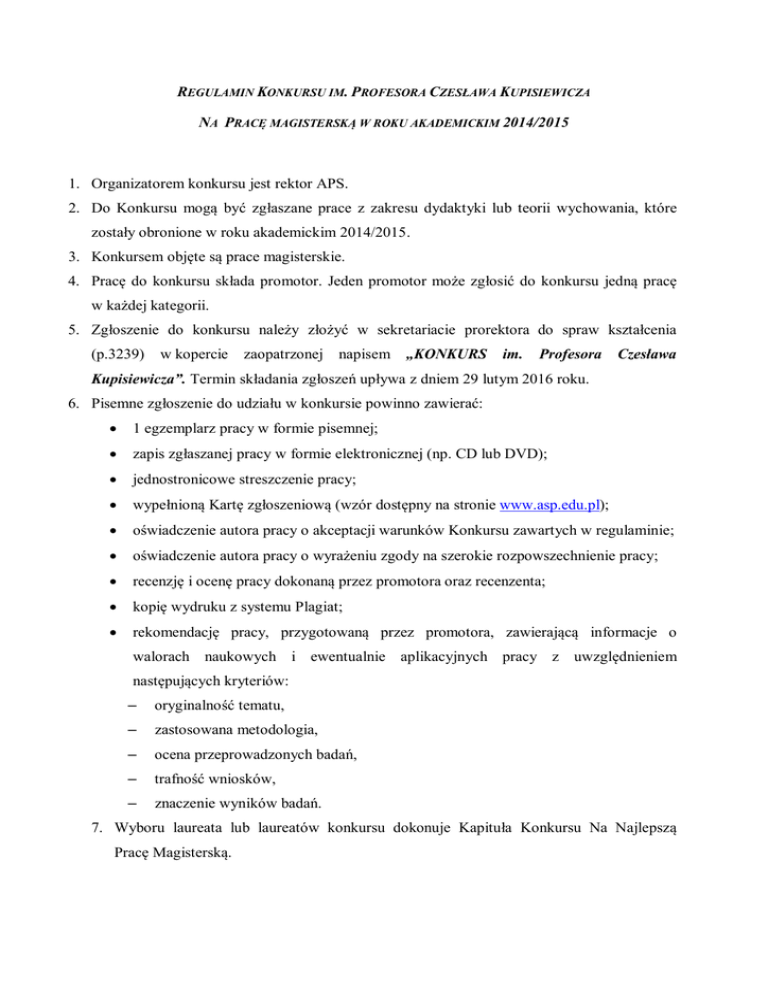 REGULAMIN KONKURSU IM. PROFESORA CZESŁAWA KUPISIEWICZA NA PRACĘ MAGISTERSKĄ W ROKU AKADEMICKIM 2014/2015 1. Organizatorem konkursu jest rektor APS. 2. Do Konkursu mogą być zgłaszane prace z zakresu dydaktyki lub teorii wychowania, które zostały obronione w roku akademickim 2014/2015. 3. Konkursem objęte są prace magisterskie. 4. Pracę do konkursu składa promotor. Jeden promotor może zgłosić do konkursu jedną pracę w każdej kategorii. 5. Zgłoszenie do konkursu należy złożyć w sekretariacie prorektora do spraw kształcenia (p.3239) w kopercie zaopatrzonej napisem „KONKURS im. Profesora Czesława Kupisiewicza”. Termin składania zgłoszeń upływa z dniem 29 lutym 2016 roku. 6. Pisemne zgłoszenie do udziału w konkursie powinno zawierać: 1 egzemplarz pracy w formie pisemnej; zapis zgłaszanej pracy w formie elektronicznej (np. CD lub DVD); jednostronicowe streszczenie pracy; wypełnioną Kartę zgłoszeniową (wzór dostępny na stronie www.asp.edu.pl); oświadczenie autora pracy o akceptacji warunków Konkursu zawartych w regulaminie; oświadczenie autora pracy o wyrażeniu zgody na szerokie rozpowszechnienie pracy; recenzję i ocenę pracy dokonaną przez promotora oraz recenzenta; kopię wydruku z systemu Plagiat; rekomendację pracy, przygotowaną przez promotora, zawierającą informacje o walorach naukowych i ewentualnie aplikacyjnych pracy z uwzględnieniem następujących kryteriów: – oryginalność tematu, – zastosowana metodologia, – ocena przeprowadzonych badań, – trafność wniosków, – znaczenie wyników badań. 7. Wyboru laureata lub laureatów konkursu dokonuje Kapituła Konkursu Na Najlepszą Pracę Magisterską. 8. W konkursie zostaną przyznane nagrody w łącznej wysokości 3300 zł (trzy tysiące trzysta). Kwota ta równa jest wysokości odprawy pośmiertnej prof. Cz. Kupisiewicza przekazanej na rzecz konkursu przez córkę Profesora Panią Jadwigę Frelek. 9. Kategorie i wysokość nagród ustali Kapituła Konkursu po rozpatrzeniu złożonych wniosków. 10. Rozstrzygnięcie konkursu nastąpi do 15 kwietnia 2016 r., a jego wyniki ogłoszone na stronie internetowej APS. 11. W przypadku niewykorzystania przeznaczonej na konkurs kwoty rektor APS ogłosi nowy konkurs na zasadach określonych w niniejszym regulaminie. 12. Uroczyste wręczenie nagród nastąpi w dniu Święta Uczelni w maju 2016 r.