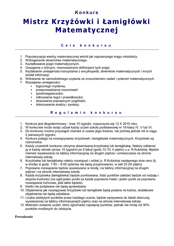 Konkurs M is tr z K r zy ż ówk i i Łam i gł ówk i M a tema ty c znej C e l e k o n k u r s u Popularyzacja wiedzy matematycznej wśród jak najszerszego kręgu młodzieży. Wzbogacenie słownictwa matematycznego. Kształtowanie pojęć matematycznych. Oswajanie z różnymi, równoważnymi definicjami tych pojęć. Kształcenie umiejętności korzystania z encyklopedii, słowników matematycznych i innych źródeł informacji. 6. Wdrażanie do samodzielnego czytania ze zrozumieniem zadań i poleceń matematycznych. 7. Rozwijanie umiejętności: logicznego myślenia, przeprowadzania rozumowań spostrzegawczości, odkrywania reguł i prawidłowości, stosowania poprawnych uogólnień, dokonywania analizy i syntezy. 1. 2. 3. 4. 5. R e g u l a m i n k o n k u r s u 1. Konkurs jest długoterminowy - trwa 10 tygodni, rozpoczyna się 13 X 2015 roku. 2. W konkursie może wziąć udział każdy uczeń szkoły podstawowej nr 19 klasy IV, V lub VI. 3. Do konkursu można przystąpić również w czasie jego trwania, nie później jednak niż w ciągu 2 pierwszych tygodni. 4. Konkurs polega na rozwiązywaniu krzyżówek i łamigłówek matematycznych. Krzyżówki są różnorodne. 5. Każdy uczestnik konkursu otrzyma skserowaną krzyżówkę lub łamigłówkę. Należy odbierać ją w każdy wtorek (przez 10 tygodni) po 5 lekcji (godz.12:10; II piętro) u p. R.Kubickiej. Będzie również wywieszana na tablicy informacyjnej na drugim piętrze i umieszczana na stronie internetowej szkoły. 6. Krzyżówkę lub łamigłówkę należy rozwiązać i oddać p. R.Kubickiej następnego dnia rano (tj. w środę) w godz. 7:45 – 8:50 (później nie będą przyjmowane), w sali 23 (III piętro). 7. Poprawne rozwiązanie będzie wywieszane w środę, na tablicy informacyjnej na drugim piętrze i na stronie internetowej szkoły. 8. Każda krzyżówka (łamigłówka) będzie punktowana. Ilość punktów zależeć będzie od rodzaju i stopnia trudności (na ogół jeden punkt za każde poprawne hasło i jeden punkt za poprawne rozwiązanie końcowe, jeśli takie będzie). 9. Kartki nie podpisane nie będą sprawdzane. 10. Objaśnienia jak rozwiązywać krzyżówki lub łamigłówki będą podane na kartce, dodatkowe objaśnienia nie będą udzielane. 11. Liczba zdobytych punktów przez każdego ucznia, będzie wpisywana do tabeli zbiorczej, wywieszonej na tablicy informacyjnej(II piętro) oraz na stronie internetowej szkoły. 12. Mistrzem zostanie uczeń, który zgromadzi najwięcej punktów, jednak nie mniej niż 90% punktów możliwych do zdobycia. Powodzenia