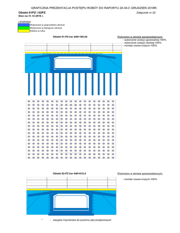 GRAFICZNA PREZENTACJA POSTĘPU ROBÓT DO RAPORTU ZA M-C GRUDZIEŃ 2016R. Obiekt 01PZ i 02PZ Załącznik nr 22 Stan na 31.12.2016 r. LEGENDA Wykonano w poprzednim okresie Wykonano w bieżącym okresie Roboty w toku Obiekt 01-PZ km 449+185,54 Wykonano w okresie sprawozdawczym: - wykonanie izolacji zgrzewalnej-100% - wykonanie izolacji cienkiej-100% - montaŜ rowów krytych-100% Obiekt 02-PZ km 449+615,4 Wykonano w okresie sprawozdawczym: - montaŜ rowów krytych-100% * - zasypka inŜynierska do poziomu płyt przejściowych GRAFICZNA PREZENTACJA POSTĘPU ROBÓT DO RAPORTU ZA M-C GRUDZIEŃ 2016R. Obiekt 03PZ i 04PG Załącznik nr 22 Stan na 31.12.2016 r. LEGENDA Wykonano w poprzednim okresie Wykonano w bieżącym okresie Roboty w toku Obiekt 03PZ km 450+553.76 Wykonano w okresie sprawozdawczym: - Obiekt 04PG km 450+568,93 budowa ścian z gruntu zbrojonego-40% wykonanie płyt przejściowych-100% wykonanie izolacji zgrzewalnej-100% wykonanie betonu ochronnego izolacji-100% Wykonano w okresie sprawozdawczym: - budowa ścian z gruntu zbrojonego-60% - wykonanie płyt przejściowych-100% - wykonanie izolacji zgrzewalnej-100% * - zasypka inŜynierska do poziomu płyt przejściowych GRAFICZNA PREZENTACJA POSTĘPU ROBÓT DO RAPORTU ZA M-C GRUDZIEŃ 2016R. Obiekt 05WD Załącznik nr 22 Stan na 31.12.2016 r. LEGENDA Wykonano w poprzednim okresie Wykonano w bieżącym okresie Roboty w toku Obiekt 05-WD km 451+025.03 Wykonano w okresie sprawozdawczym: - wykonanie przeciwspadku nawierzchni-100% - podwaliny pod umocnienie stoŜków-50% P1 * P2 - zasypka inŜynierska do poziomu płyt przejściowych GRAFICZNA PREZENTACJA POSTĘPU ROBÓT DO RAPORTU ZA M-C GRUDZIEŃ 2016R. Obiekt 06PZ i 06APZ Załącznik nr 22 Stan na 31.12.2016 r. LEGENDA Wykonano w poprzednim okresie Wykonano w bieżącym okresie Roboty w toku Obiekt 06PZ km 451+372.9 Wykonano w okresie sprawozdawczym: - zasypka inŜynierska-100% - rowy kryte-100% kontur obejmujący rozmieszczenie kolumn Ŝwirowych Obiekt 06APZ km 0+371.86 Wykonano w okresie sprawozdawczym: kontur obejmujący rozmieszczenie kolumn Ŝwirowych GRAFICZNA PREZENTACJA POSTĘPU ROBÓT DO RAPORTU ZA M-C GRUDZIEŃ 2016R. Obiekt 7APZ i 7PZ Załącznik nr 22 Stan na 31.12.2016 r. LEGENDA Wykonano w poprzednim okresie Wykonano w bieżącym okresie Roboty w toku Obiekt 07APZ km 0+499,29 Wykonano w okresie sprawozdawczym: - umocnienie cieku-100% - izolacja zgrzewalna-100% Wykonano w okresie sprawozdawczym: Obiekt 07PZ km 451+514,9 - umocnienie cieku-100% izolacja zgrzewalna-100% montaŜ rowów krytych-100% montaŜ zbrojenia kap chodnikowych-100% montaŜ krawęŜnika-100% GRAFICZNA PREZENTACJA POSTĘPU ROBÓT DO RAPORTU ZA M-C GRUDZIEŃ 2016R. Obiekt 08WG Stan na 31.12.2016 r. LEGENDA Wykonano w poprzednim okresie Wykonano w bieżącym okresie Roboty w toku Obiekt 08-WG km 452+388.57 Wykonano w okresie sprawozdawczym: - próbne obciąŜenie obiektu-100% P1 * P2 - zasypka inŜynierska do poziomu płyt przejściowych P3 GRAFICZNA PREZENTACJA POSTĘPU ROBÓT DO RAPORTU ZA M-C GRUDZIEŃ 2016R. Obiekt 09PZ i 10PZ Załącznik nr 22 Stan na 31.12.2016 r. LEGENDA Wykonano w poprzednim okresie Wykonano w bieżącym okresie Roboty w toku Obiekt 09-PZ km 452+689 Wykonano w okresie sprawozdawczym: - montaŜ desek gzymsowych-100% - montaŜ zbrojenia kap chodnikowych-100% - betonowanie kap chodnikowych-100% Obiekt 10PZ km 452+978,13 Wykonano w okresie sprawozdawczym: - w-wa ochronna z asfaltu lanego-100% * - zasypka inŜynierska do poziomu płyt przejściowych GRAFICZNA PREZENTACJA POSTĘPU ROBÓT DO RAPORTU ZA M-C GRUDZIEŃ 2016R. Obiekt 11PZ i 12PG Załącznik nr 22 Stan na 31.12.2016 r. LEGENDA Wykonano w poprzednim okresie Wykonano w bieżącym okresie Roboty w toku Obiekt 11-PZ km 454+262 Wykonano w okresie sprawozdawczym: - budowa ścian z gruntu zbrojonego-30% wykonanie płyt przejściowych-100% wykonanie izolacji zgrzewalnej-100% wykonanie w-wy ochronnej na izolacji zgrzewalnej-100% Obiekt 12-PG km 454+415,34 Wykonano w okresie sprawozdawczym: - budowa ścian z gruntu zbrojonego-70% - wykonanie płyt przejściowych-100% * - zasypka inŜynierska do poziomu płyt przejściowych GRAFICZNA PREZENTACJA POSTĘPU ROBÓT DO RAPORTU ZA M-C GRUDZIEŃ 2016R. Obiekt 13WG i 14WD Załącznik nr 22 Stan na 31.12.2016 r. LEGENDA Wykonano w poprzednim okresie Wykonano w bieżącym okresie Roboty w toku Obiekt 13-WG km 455+351.4 Wykonano w okresie sprawozdawczym: - P1 P2 skrzydełka z gruntu zbrojonego-20% montaŜ kolektora-100% ścianki zapleczne-100% izolacja ścianek zaplecznych-100% P3 Obiekt 14 WD km 455+815 Wykonano w okresie sprawozdawczym: - montaŜ desek gzymsowych na skrzydełkach-100% P1 P2 * P3 P4 P5 P6 - zasypka inŜynierska do poziomu płyt przejściowych Uwaga: na widoku z góry pokazano wykonanie poszczególnych pali, natomiast na widoku z boku zaawansowanie prac w poszczególnym rzędzie. Do momentu wykonania wszystkich pali w danym rzędzie uznaje się, Ŝe są to roboty w toku. GRAFICZNA PREZENTACJA POSTĘPU ROBÓT DO RAPORTU ZA M-C GRUDZIEŃ 2016R. Obiekt 15 PZ Załącznik nr 22 Stan na 31.12.2016 r. LEGENDA Wykonano w poprzednim okresie Wykonano w bieżącym okresie Roboty w toku Obiekt 15PZ km 457+204 Wykonano w okresie sprawozdawczym: - wykonanie wylotów rowów krytych-100% - ścieki naskarpowe-100% * - zasypka inŜynierska do poziomu płyt przejściowych GRAFICZNA PREZENTACJA POSTĘPU ROBÓT DO RAPORTU ZA M-C GRUDZIEŃ 2016R. Obiekt 16A PZ i 16PZ Załącznik nr 22 Stan na 31.12.2016 r. LEGENDA Wykonano w poprzednim okresie Wykonano w bieżącym okresie Roboty w toku Obiekt 16APZ km 458+065,23 Wykonano w okresie sprawozdawczym: - Obiekt 16-PZ km 458+361 wykopy fundamentowe-100% w-wa wyrównawcza z chudego betonu-100% zbrojenie i deskowanie ławy fund.-100% betonowanie ławy fund.-100% zbrojenie i deskowanie ramy-100% betonowanie ramy-100% Wykonano w okresie sprawozdawczym: - ustawienie barier energochłonnych-100% - wykonanie w-wy ścieralnej nawierzchni-100% GRAFICZNA PREZENTACJA POSTĘP