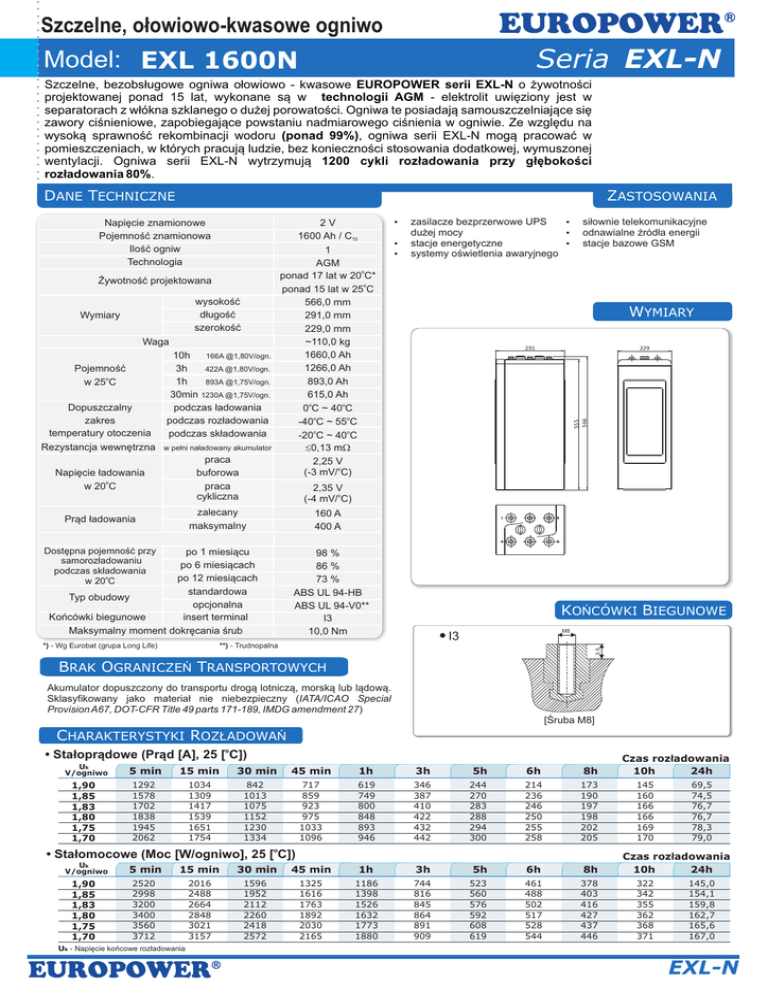 Szczelne, ołowiowo-kwasowe ogniwo Seria EXL-N Model: EXL 1600N Szczelne, bezobsługowe ogniwa ołowiowo - kwasowe EUROPOWER serii EXL-N o żywotności projektowanej ponad 15 lat, wykonane są w technologii AGM - elektrolit uwięziony jest w separatorach z włókna szklanego o dużej porowatości. Ogniwa te posiadają samouszczelniające się zawory ciśnieniowe, zapobiegające powstaniu nadmiarowego ciśnienia w ogniwie. Ze względu na wysoką sprawność rekombinacji wodoru (ponad 99%), ogniwa serii EXL-N mogą pracować w pomieszczeniach, w których pracują ludzie, bez konieczności stosowania dodatkowej, wymuszonej wentylacji. Ogniwa serii EXL-N wytrzymują 1200 cykli rozładowania przy głębokości rozładowania 80%. DANE TECHNICZNE ZASTOSOWANIA 2V 1600 Ah / C10 1 AGM o ponad 17 lat w 20 C* o ponad 15 lat w 25 C 566,0 mm 291,0 mm 229,0 mm ~110,0 kg 1660,0 Ah 1266,0 Ah 893,0 Ah 615,0 Ah o o 0 C ~ 40 C o o -40 C ~ 55 C o o -20 C ~ 40 C £0,13 mW 2,25 V o (-3 mV/ C) Żywotność projektowana wysokość długość szerokość Wymiary Waga Dopuszczalny zakres temperatury otoczenia Rezystancja wewnętrzna w pełni naładowany akumulator Napięcie ładowania o w 20 C praca buforowa praca cykliczna Prąd ładowania zalecany maksymalny siłownie telekomunikacyjne odnawialne źródła energii stacje bazowe GSM WYMIARY 291 229 2,35 V o (-4 mV/ C) 160 A 400 A Dostępna pojemność przy samorozładowaniu podczas składowania o w 20 C po 1 miesiącu po 6 miesiącach po 12 miesiącach standardowa Typ obudowy opcjonalna Końcówki biegunowe insert terminal Maksymalny moment dokręcania śrub *) - Wg Eurobat (grupa Long Life) zasilacze bezprzerwowe UPS dużej mocy stacje energetyczne systemy oświetlenia awaryjnego 98 % 86 % 73 % ABS UL 94-HB ABS UL 94-V0** I3 10,0 Nm KOŃCÓWKI BIEGUNOWE M8 I3 **) - Trudnopalna 3.5 Pojemność o w 25 C 166A @1,80V/ogn. 10h 422A @1,80V/ogn. 3h 893A @1,75V/ogn. 1h 30min 1230A @1,75V/ogn. podczas ładowania podczas rozładowania podczas składowania 555 566 Napięcie znamionowe Pojemność znamionowa Ilość ogniw Technologia BRAK OGRANICZEŃ TRANSPORTOWYCH Akumulator dopuszczony do transportu drogą lotniczą, morską lub lądową. Sklasyfikowany jako materiał nie niebezpieczny (IATA/ICAO Special Provision A67, DOT-CFR Title 49 parts 171-189, IMDG amendment 27) [Śruba M8] CHARAKTERYSTYKI ROZŁADOWAŃ o • Stałoprądowe (Prąd [A], 25 [ C]) Uk V/ogniwo 1,90 1,85 1,83 1,80 1,75 1,70 5 min 15 min 30 min 45 min 1h 3h 5h 6h 8h 1292 1578 1702 1838 1945 2062 1034 1309 1417 1539 1651 1754 842 1013 1075 1152 1230 1334 717 859 923 975 1033 1096 619 749 800 848 893 946 346 387 410 422 432 442 244 270 283 288 294 300 214 236 246 250 255 258 173 190 197 198 202 205 o • Stałomocowe (Moc [W/ogniwo], 25 [ C]) Uk V/ogniwo 1,90 1,85 1,83 1,80 1,75 1,70 5 min 15 min 30 min 45 min 1h 3h 5h 6h 8h 2520 2998 3200 3400 3560 3712 2016 2488 2664 2848 3021 3157 1596 1952 2112 2260 2418 2572 1325 1616 1763 1892 2030 2165 1186 1398 1526 1632 1773 1880 744 816 845 864 891 909 523 560 576 592 608 619 461 488 502 517 528 544 378 403 416 427 437 446 Czas rozładowania 10h 24h 145 160 166 166 169 170 69,5 74,5 76,7 76,7 78,3 79,0 Czas rozładowania 10h 24h 322 342 355 362 368 371 145,0 154,1 159,8 162,7 165,6 167,0 Uk - Napięcie końcowe rozładowania EXL-N EXL 1600N Żywotność ogniwa przy pracy buforowej Żywotność ogniwa przy pracy cyklicznej 20 Projektowana żywotność [lata] 120 Napięcie ładowania 2.25 V/ogniwo 15 Temperatura: o 20[ C] 100 10 Pojemność [%] 8 6 5 4 80 60 głębokość głębokość rozładowania rozładowania 100[%] 80[%] 40 3 głębokość rozładowania 50[%] głębokość rozładowania 30[%] 20 2 0 1.4 20 30 40 50 0 600 1200 1800 2400 3000 3600 Liczba cykli o Temperatura pracy [ C] Charakterystyki rozładowania ogniwa Charakterystyki samorozładowania ogniwa 100 Zachowana pojemność [%] Temperatura: 25[oC] 2.1 Napięcie [V] 2.0 1.9 0.05C[A] 0.3C[A] 0.2C[A] 0.4C[A] 0.5C[A] 0.6C[A] 0.7C[A] 0.8C[A] 0.9C[A] 1.0C[A] 1.8 0.014C[A] 0.1C[A] 1.7 80 10[oC] 60 20[oC] 30[oC] 40[oC] 40 1.6 0.01 0.1 1 5 10 20 50 100 Czas rozładowania [h] 0 3 6 9 12 15 18 21 24 27 30 Okres składowania [miesiące] 2.35 0.15 0.12 0.09 0.06 Napięcie ładowania [V] Prąd ładowania [CxA] Poziom nałado 2.25 0.21 2.50 120 0.18 2.35 0.15 2.25 wania Napięcie ładowania 2.15 100 80 Rozładowanie 100% (0.05C[A] x 20[h]) 50% (0.05C[A] x 10[h]) Ładowanie stałonapięciowe: 2.25[V/ogniwo] stałoprądowe: 0.1C[A] Temperatura: 25[oC] 2.05 1.95 60 40 0.03 20 0 0 4 8 12 16 Czas ładowania [h] 0 20 0.09 0.06 140 Napięcie ładowania Poziom na ładowania 2.15 120 100 80 Rozładowanie 100% (0.05C[A] x 20[h]) 50% (0.05C[A] x 10[h]) Ładowanie stałonapięciowe: 2.35[V/ogniwo] stałoprądowe: 0.1C[A] o Temperatura: 25[ C] 2.05 1.95 0.03 60 40 20 Prąd ładowania Prąd ładowania 0 0.12 Napięcie ładowania [V] 0.18 140 Prąd ładowania [CxA] 2.50 Poziom naładowania ogniwa [%] 0.21 Charakterystyki ładowania przy pracy cyklicznej Poziom naładowania ogniwa [%] Charakterystyki ładowania przy pracy buforowej 0 0 0 4 8 12 16 Czas ładowania [h] 20 0 Dopuszczalne końcowe napięcia rozładowania ogniwa Prąd rozładowania [A] Końcowe napięcie rozładowania [V/ogniwo] 0.2C > I 0.2C £ I < 0.5C 0.5C £ I < 1.0C 1.0C £ I 1.85 1.83 1.75 1.70 Pb *) C - pojemność ogniwa data wydania: 03.04.2009; numer zmiany: 2; data zmiany: 19.05.2015 EXL-N