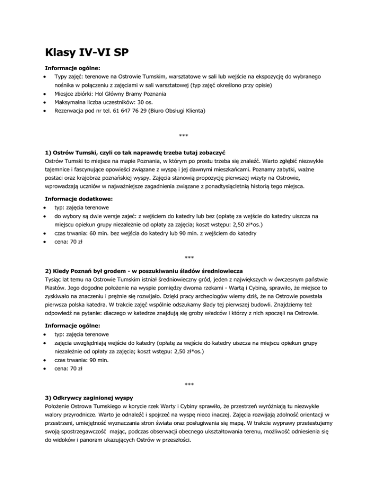 Klasy IV-VI SP Informacje ogólne: Typy zajęć: terenowe na Ostrowie Tumskim, warsztatowe w sali lub wejście na ekspozycję do wybranego nośnika w połączeniu z zajęciami w sali warsztatowej (typ zajęć określono przy opisie) Miesjce zbiórki: Hol Główny Bramy Poznania Maksymalna liczba uczestników: 30 os. Rezerwacja pod nr tel. 61 647 76 29 (Biuro Obsługi Klienta) *** 1) Ostrów Tumski, czyli co tak naprawdę trzeba tutaj zobaczyć Ostrów Tumski to miejsce na mapie Poznania, w którym po prostu trzeba się znaleźć. Warto zgłębić niezwykłe tajemnice i fascynujące opowieści związane z wyspą i jej dawnymi mieszkańcami. Poznamy zabytki, ważne postaci oraz krajobraz poznańskiej wyspy. Zajęcia stanowią propozycję pierwszej wizyty na Ostrowie, wprowadzają uczniów w najważniejsze zagadnienia związane z ponadtysiącletnią historią tego miejsca. Informacje dodatkowe: typ: zajęcia terenowe do wybory są dwie wersje zajeć: z wejściem do katedry lub bez (opłatę za wejście do katedry uiszcza na miejscu opiekun grupy niezależnie od opłaty za zajęcia; koszt wstępu: 2,50 zł*os.) czas trwania: 60 min. bez wejścia do katedry lub 90 min. z wejściem do katedry cena: 70 zł *** 2) Kiedy Poznań był grodem - w poszukiwaniu śladów średniowiecza Tysiąc lat temu na Ostrowie Tumskim istniał średniowieczny gród, jeden z największych w ówczesnym państwie Piastów. Jego dogodne położenie na wyspie pomiędzy dwoma rzekami - Wartą i Cybiną, sprawiło, że miejsce to zyskiwało na znaczeniu i prężnie się rozwijało. Dzięki pracy archeologów wiemy dziś, że na Ostrowie powstała pierwsza polska katedra. W trakcie zajęć wspólnie odszukamy ślady tej pierwszej budowli. Znajdziemy też odpowiedź na pytanie: dlaczego w katedrze znajdują się groby władców i którzy z nich spoczęli na Ostrowie. Informacje ogólne: typ: zajęcia terenowe zajęcia uwzględniają wejście do katedry (opłatę za wejście do katedry uiszcza na miejscu opiekun grupy niezależnie od opłaty za zajęcia; koszt wstępu: 2,50 zł*os.) czas trwania: 90 min. cena: 70 zł *** 3) Odkrywcy zaginionej wyspy Położenie Ostrowa Tumskiego w korycie rzek Warty i Cybiny sprawiło, że przestrzeń wyróżniają tu niezwykłe walory przyrodnicze. Warto je odnaleźć i spojrzeć na wyspę nieco inaczej. Zajęcia rozwijają zdolność orientacji w przestrzeni, umiejętność wyznaczania stron świata oraz posługiwania się mapą. W trakcie wyprawy przetestujemy swoją spostrzegawczość mając, podczas obserwacji obecnego ukształtowania terenu, możliwość odniesienia się do widoków i panoram ukazujących Ostrów w przeszłości. Informacje dodatkowe: typ: zajęcia terenowe cas trwania: 90 min. cena: 70 zł *** 4) Historia niezwykłego pomnika Kaplica Królów Polskich w poznańskiej katedrze zachwyca swym pięknem, jednakże dopiero gdy poznamy jej historię nabiera ona pełnego blasku... Skąd wziął się pomysł, by pierwszych władców Polski upamiętnić właśnie na Ostrowie Tumskim? Jaką rolę odegrał w tym hrabia Edward Raczyński? Jak to możliwe, że kaplica jest jednocześnie pomnikiem? Na te i inne pytania znajdziemy odpowiedzi dzięki pracy zespołowej. Zajęcia rozwijają także umiejętność komunikacji przez formy plastyczne oraz formułowania wypowiedzi na temat sztuki. Informacje dodatkowe: typ: zajęcia na ekspozycji i w sali warsztatowej czas trwania: 75 min. cena: 90 zł *** 5) Dawno temu w grodzie Zapraszamy w podróż do tętniącego życiem grodu na Ostrowie Tumskim. Przebywa tu zarówno księżna, jak i duchowni, wojowie oraz zwykli mieszkańcy. Dzięki specjalnej makiecie podpatrzymy ich codzienne życie: czym się zajmowali, jakie obowiązki wypełniali oraz jak wyglądał gród z ich perspektywy. Spróbujemy również wczuć się w role wybranych mieszkańców, sprawdzając swoje umiejętności aktorskie. Zajęcia rozwijają zmysł obserwacji oraz uczą współdziałania w zespole. Informacje dodatkowe: typ: zajęcia na ekspozycji i w sali warsztatowej czas trwania: 75 min. cena: 90 zł ****