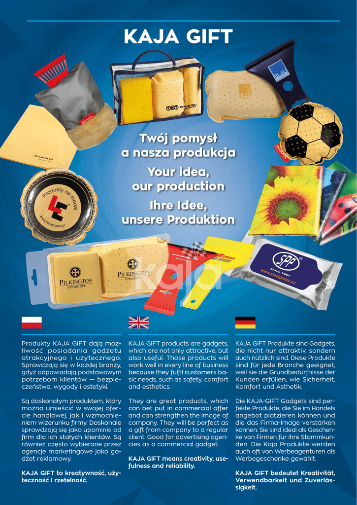 KAJA GIFT Twój pomysł a nasza produkcja Your idea, our production Ihre Idee, unsere Produktion Produkty KAJA GIFT dają możliwość posiadania gadżetu atrakcyjnego i użytecznego. Sprawdzają się w każdej branży, gdyż odpowiadają podstawowym potrzebom klientów — bezpieczeństwa, wygody i estetyki. KAJA GIFT products are gadgets, which are not only attractive, but also useful. Those products will work well in every line of business sic needs, such as safety, comfort and esthetics. KAJA GIFT Produkte sind Gadgets, die nicht nur attraktiv, sondern auch nützlich sind. Diese Produkte sind für jede Branche geeignet, weil sie die Grundbedürfnisse der Kunden erfüllen, wie Sicherheit, Komfort und Ästhetik. Są doskonałym produktem, który można umieścić w swojej ofercie handlowej, jak i wzmocnie- They are great products, which Die KAJA-GIFT Gadgets sind perfekte Produkte, die Sie im Handels angebot platzieren können und die das Firma-Image verstärken können. Sie sind ideal als Geschenke von Firmen für ihre Stammkunden. Die Kaja Produkte werden auch oft von Werbeagenturen als Werbegeschenke gewählt. sprawdzają się jako upominki od również często wybierane przez agencje marketingowe jako gadżet reklamowy. KAJA GIFT to kreatywność, użyteczność i rzetelność. and can strengthen the image of company. They will be perfect as a gift from company to a regular client. Good for advertising agencies as a commercial gadget. KAJA GIFT means creativity, usefulness and reliability. KAJA GIFT bedeutet Kreativität, Verwendbarkeit und Zuverlässigkeit. www.kaja.szczecin.pl 33