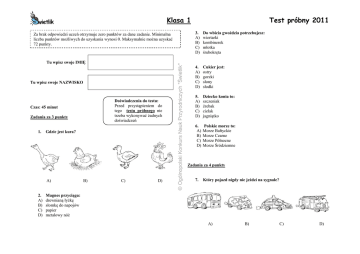 Klasa 1 Tu wpisz swoje IMIĘ Tu wpisz swoje NAZWISKO Doświadczenia do testu: Przed przystąpieniem do tego testu próbnego nie trzeba wykonywać żadnych doświadczeń Czas: 45 minut Zadania za 3 punkty 1. Gdzie jest kura? A) 2. A) B) C) D) B) C) D) © Ogólnopolski Konkurs Nauk Przyrodniczych "Świetlik" Za brak odpowiedzi uczeń otrzymuje zero punktów za dane zadanie. Minimalna liczba punktów możliwych do uzyskania wynosi 0. Maksymalnie można uzyskać 72 punkty. Test próbny 2011 3. A) B) C) D) Do wbicia gwoździa potrzebujesz: wiertarki kombinerek młotka śrubokręta 4. A) B) C) D) Cukier jest: ostry gorzki słony słodki 5. A) B) C) D) Dziecko konia to: szczeniak źrebak cielak jagniątko 6. A) B) C) D) Polskie morze to: Morze Bałtyckie Morze Czarne Morze Północne Morze Śródziemne Zadania za 4 punkty 7. Który pojazd nigdy nie jeździ na sygnale? Magnes przyciąga: drewnianą łyżkę słomkę do napojów papier metalowy nóż A) B) C) D) 8. A) B) C) D) Dzień Babci obchodzimy: na wiosnę w lecie jesienią w zimie 9. A) B) C) D) Szczoteczki do zębów używamy: codziennie rano i wieczorem tylko raz w tygodniu tylko raz w miesiącu tylko raz w roku 10. Ile jabłek jest w koszyku? A) B) C) D) 2 3 4 5 11. A) B) C) D) Największą rzeką w Polsce jest: Odra Wisła Bug Warta © Ogólnopolski Konkurs Nauk Przyrodniczych "Świetlik" Klasa 1 Test próbny 2011 12. Obrany ze skórki burak ćwikłowy jest: A) żółty B) pomarańczowy C) bordowy D) zielony Zadania za 5 punktów 13. Uzupełnij miejsce kropek w zdaniu: „Kiedy kroję …………………. to łzy płyną mi z oczu” A) B) C) D) marchewkę cytrynę kapustę cebulę 14. Wielki Wóz i Mały Wóz możesz znaleźć: A) w dzień na ulicy B) w dzień na trawniku C) w nocy na niebie D) w nocy w zajezdni 15. Który znak drogowy stoi przy przejściu dla pieszych z „zebrą”? A) B) C) D) Klasa 1 17. Piotrek usłyszał w radiu: „Za trzy godziny, wraz z nadejściem zmierzchu napłynie do nas chłodne i wilgotne powietrze. Nad ranem spodziewamy się opadów deszczu.” Odgadnij, o jakiej porze dnia Piotrek wysłuchał tych słów. A) rano B) w południe C) po południu D) późnym wieczorem 18. A) B) C) D) Które zdanie jest prawdziwe? Wróbel jest większy od orła. Gołąb jest mniejszy od wróbla. Sroka jest większa od wróbla. Orzeł jest mniejszy od gołębia. © Ogólnopolski Konkurs Nauk Przyrodniczych "Świetlik" 16. Pod który numer telefonu zadzwonisz, jeśli ktoś z twoich rodziców zasłabnie? A) 100 B) 112 C) 331 D) 777 Test próbny 2011