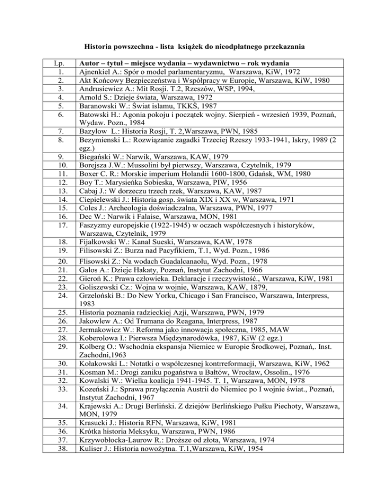 Historia powszechna - lista ksiąŜek do nieodpłatnego przekazania Lp. 1. 2. 3. 4. 5. 6. 7. 8. 9. 10. 11. 12. 13. 14. 15. 16. 17. 18. 19. 20. 21. 22. 23. 24. 25. 26. 27. 28. 29. 30. 31. 32. 33. 34. 35. 36. 37. 38. Autor – tytuł – miejsce wydania – wydawnictwo – rok wydania Ajnenkiel A.: Spór o model parlamentaryzmu, Warszawa, KiW, 1972 Akt Końcowy Bezpieczeństwa i Współpracy w Europie, Warszawa, KiW, 1980 Andrusiewicz A.: Mit Rosji. T.2, Rzeszów, WSP, 1994, Arnold S.: Dzieje świata, Warszawa, 1972 Baranowski W.: Świat islamu, TKKŚ, 1987 Batowski H.: Agonia pokoju i początek wojny. Sierpień - wrzesień 1939, Poznań, Wydaw. Pozn., 1984 Bazylow L.: Historia Rosji, T. 2,Warszawa, PWN, 1985 Bezymienski L.: Rozwiązanie zagadki Trzeciej Rzeszy 1933-1941, Iskry, 1989 (2 egz.) Biegański W.: Narwik, Warszawa, KAW, 1979 Borejsza J.W.: Mussolini był pierwszy, Warszawa, Czytelnik, 1979 Boxer C. R.: Morskie imperium Holandii 1600-1800, Gdańsk, WM, 1980 Boy T.: Marysieńka Sobieska, Warszawa, PIW, 1956 Cabaj J.: W dorzeczu trzech rzek, Warszawa, KAW, 1987 Ciepielewski J.: Historia gosp. świata XIX i XX w, Warszawa, 1971 Coles J.: Archeologia doświadczalna, Warszawa, PWN, 1977 Dec W.: Narwik i Falaise, Warszawa, MON, 1981 Faszyzmy europejskie (1922-1945) w oczach współczesnych i historyków, Warszawa, Czytelnik, 1979 Fijałkowski W.: Kanał Sueski, Warszawa, KAW, 1978 Filisowski Z.: Burza nad Pacyfikiem, T.1, Wyd. Pozn., 1986 Flisowski Z.: Na wodach Guadalcanaolu, Wyd. Pozn., 1978 Galos A.: Dzieje Hakaty, Poznań, Instytut Zachodni, 1966 Gieroń K.: Prawa człowieka. Deklaracje i rzeczywistość., Warszawa, KiW, 1981 Goliszewski Cz.: Wojna w wojnie, Warszawa, KAW, 1879, Grzeloński B.: Do New Yorku, Chicago i San Francisco, Warszawa, Interpress, 1983 Historia poznania radzieckiej Azji, Warszawa, PWN, 1979 Jakowlew A.: Od Trumana do Reagana, Interpress, 1987 Jermakowicz W.: Reforma jako innowacja społeczna, 1985, MAW Koberolowa I.: Pierwsza Międzynarodówka, 1987, KiW (2 egz.) Kolberg O.: Wschodnia ekspansja Niemiec w Europie Środkowej, Poznań,. Inst. Zachodni,1963 Kołakowski L.: Notatki o współczesnej kontrreformacji, Warszawa, KiW, 1962 Kosman M.: Drogi zaniku pogaństwa u Bałtów, Wrocław, Ossolin., 1976 Kowalski W.: Wielka koalicja 1941-1945. T. 1, Warszawa, MON, 1978 Kozeński J.: Sprawa przyłączenia Austrii do Niemiec po I wojnie świat., Poznań, Instytut Zachodni, 1967 Krajewski A.: Drugi Berliński. Z dziejów Berlińskiego Pułku Piechoty, Warszawa, MON, 1979 Krasucki J.: Historia RFN, Warszawa, KiW, 1981 Krótka historia Meksyku, Warszawa, PWN, 1986 Krzywobłocka-Laurow R.: DroŜsze od złota, Warszawa, 1974 Kuliser J.: Historia nowoŜytna. T.1,Warszawa, KiW, 1954 39. 40. 41. 42. 43. 44. 45. 46. 47. 48. 49. 50. 51. 52. 53. 54. 55. 56. 57. 58. 59. 60. 61. 62. 63. 64. 65. 66. 67. 68. 69. 70. 71. 72. 73. 74. 75. 76. 77. Kuliser J.: Powszechna historia gospodarcza średniowiecza i czasów nowoŜytnych. T. 1, Warszawa, KIW, 1961 (2 egz.) Kuliser J.: Powszechna historia gospodarcza średniowiecza i czasów nowoŜytnych. T.2, Warszawa, KiW, 1961 Kurpisowa G.: Nim wybuchła Wielka Rewolucja Październikowa, Warszawa, Wydaw. TPPR, 1987 Leśnodorski B.: Rozmowy z przeszłością, Warszawa, WP, 1970 Ładyński A.: Anna Jarosławna - królowa Francji, Łódź, WL, 1978 Łojek J.: Wokół sporów i polemik, Lublin, Wydaw. Lub., 1979 Łopianowski N.: Rozmowy z NKWD, Warszawa, PAX, 1990 Micewski A.: Polityka staje się historią, Warszawa,Czytelnik, 1986 Moszczeńska W.: Metodologii historii zarys krytyczny, Warszawa, PWN, 1977 Niezielski T.: Bergen-Belsen 1943-1945, Warszawa, Sport i Turystyka, 1971 Nowak Z.: Koncepcja integracji Europy Zach. na tle procesów rozwoju ekonomicznego, Poznań, Instytut Zachodni, 1965 Ochmański J.: Dzieje Rosji do roku 1861, Warszawa, PWN, 1986 Ochmański J.: Dzieje Rosji do roku 1861, Warszawa, PWN, 1980 Pajewski J.: Historia Powszechna (1871-1918), Warszawa, PWN, 1967 Płochocki Z.: Rozwój poglądów na naturę świata, Warszawa, PZWS, 1966 Procacci G.: Historia Włochów, Warszawa, PWN, 1983 Prokopczuk J.: Historia Afryki w zarysie, Warszawa, PZWS, 1964 Prutkow K.: Puch i pierze, Warszawa, Iskry, 1962 Przybylski T.: Henryk Wieniawski (1835-1880), Wrocław, Ossolin., 1979 Rajecki R.: Stolica Apostolska wobec rozbrojenia, Warszawa, Ośrodek Dokumentacji i Studiów Spolecznych, 1989 Rawski T.: Wojna na Bałkanach 1941. Agresja hitlerowska na Jugosławię i Grecję., Warszawa, MON, 1981 Rusiński w.: Zarys historii gospodarczej powszechnej, Warszawa, KiW, 1970 Schreiner A.: Polityka zagraniczna Niemiec 1871-1945, Warszawa, PWN, 1955 Sorel A.: Kwestia wschodnia w XVIII w.: pierwszy podział Polski., Warszawa, PIW, 1981 Strumph-Wojtkiewicz S.: Gra wojenna, Warszawa, PIW, 1970 Topolski J.: Prawda i model w historiografii, Warszawa, PIW, 1990 Trease G.: Dwanaście miesięcy czyli historia Anglii, Warszawa, NK, 1981 Urbański E. S.: Hispanoameryka i jej cywilizacje, Warszawa, PWN, 1981 Wacławik M.: Poszukiwania i manowce, Warszawa, KAW, 1980 Walicki A.: Rosyjska filozofia i myśl społeczna od oświecenia do marksizmu, Warszawa,WP, 1973 Wielopolska S.: Araguaney. Szkice z Wenzueli, Wrocław, Ossol.,1980 Wolski K.: Pakistan: dzieje ziemi i państwa., Warszawa, PWN, 1978 Wyczański A.: Historia powszechna: wiek XVI, Wraszawa, WSiP, 1887 Wyszczelski L.: Bohaterowie stu bitew, Warszawa, KAW, 1986 Z czarnego kraju. Górny Śląsk w reportaŜu międzywojennym, Katowice,” Śląsk”, 1981 Zakrzewski J.: Ameryka z pasją, Warszawa, KiW, 1981 śmuda A.F.: Legenda klanu Kennedych, Warszawa, KAW, 1985 śółkiewski S.: Cetno i licho. Szkice 1839-1980, Warszawa, KiW, 1983 śywczyński M.: Historia powszechna 1789-1870, Warszawa, PWN, 1977