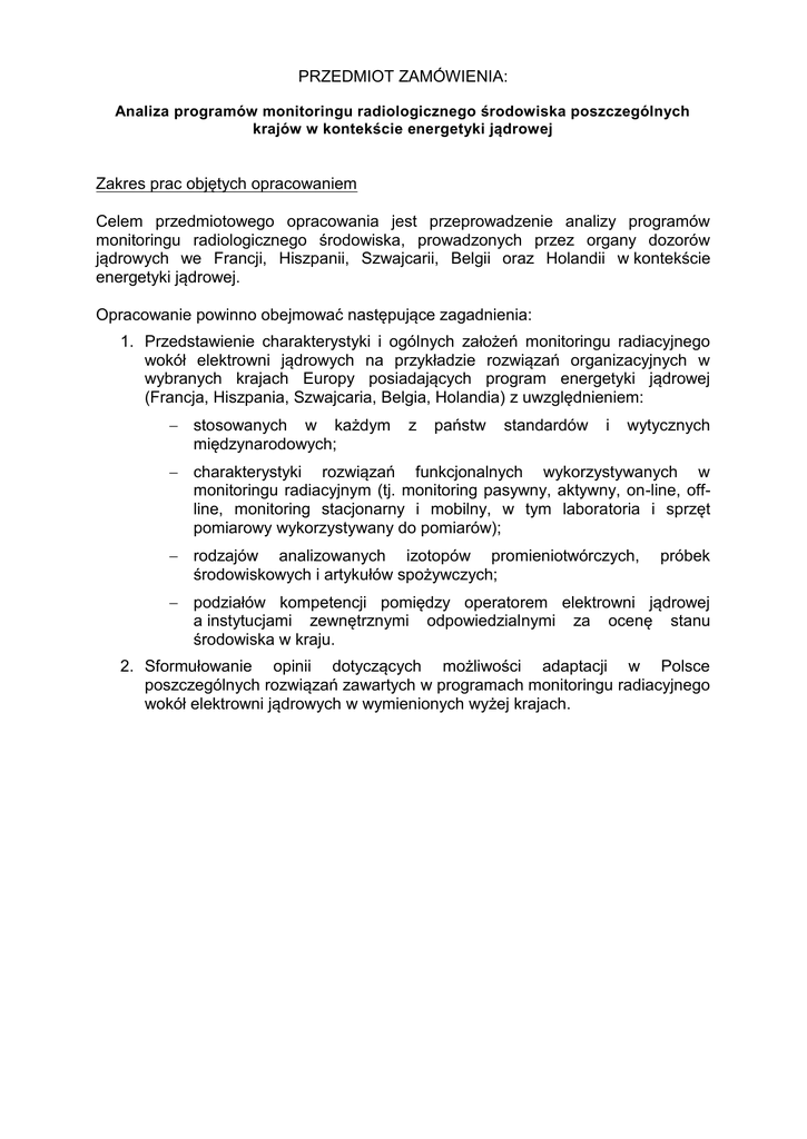 PRZEDMIOT ZAMÓWIENIA: Analiza programów monitoringu radiologicznego środowiska poszczególnych krajów w kontekście energetyki jądrowej Zakres prac objętych opracowaniem Celem przedmiotowego opracowania jest przeprowadzenie analizy programów monitoringu radiologicznego środowiska, prowadzonych przez organy dozorów jądrowych we Francji, Hiszpanii, Szwajcarii, Belgii oraz Holandii w kontekście energetyki jądrowej. Opracowanie powinno obejmować następujące zagadnienia: 1. Przedstawienie charakterystyki i ogólnych założeń monitoringu radiacyjnego wokół elektrowni jądrowych na przykładzie rozwiązań organizacyjnych w wybranych krajach Europy posiadających program energetyki jądrowej (Francja, Hiszpania, Szwajcaria, Belgia, Holandia) z uwzględnieniem: stosowanych w każdym międzynarodowych; z państw standardów i wytycznych charakterystyki rozwiązań funkcjonalnych wykorzystywanych w monitoringu radiacyjnym (tj. monitoring pasywny, aktywny, on-line, offline, monitoring stacjonarny i mobilny, w tym laboratoria i sprzęt pomiarowy wykorzystywany do pomiarów); rodzajów analizowanych izotopów promieniotwórczych, środowiskowych i artykułów spożywczych; próbek podziałów kompetencji pomiędzy operatorem elektrowni jądrowej a instytucjami zewnętrznymi odpowiedzialnymi za ocenę stanu środowiska w kraju. 2. Sformułowanie opinii dotyczących możliwości adaptacji w Polsce poszczególnych rozwiązań zawartych w programach monitoringu radiacyjnego wokół elektrowni jądrowych w wymienionych wyżej krajach.