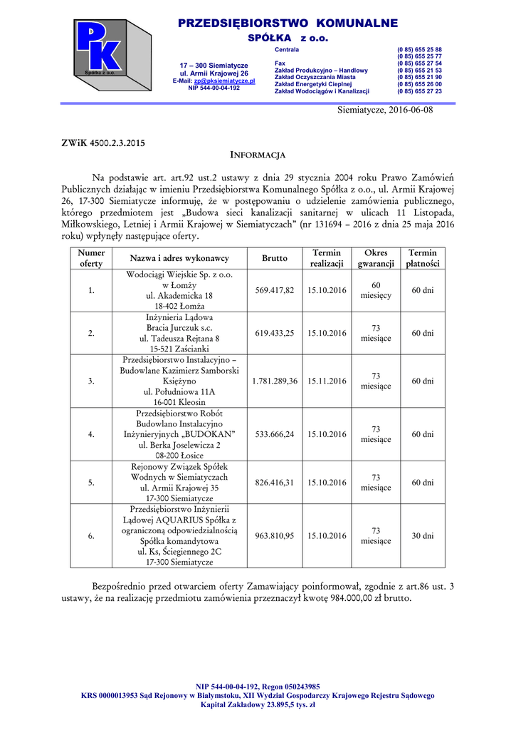 PRZEDSIĘBIORSTWO KOMUNALNE SPÓŁKA z o.o. Centrala 17 – 300 Siemiatycze ul. Armii Krajowej 26 E-Mail: [email protected] NIP 544-00-04-192 Fax Zakład Produkcyjno – Handlowy Zakład Oczyszczania Miasta Zakład Energetyki Cieplnej Zakład Wodociągów i Kanalizacji (0 85) 655 25 88 (0 85) 655 25 77 (0 85) 655 27 54 (0 85) 655 21 53 (0 85) 655 21 90 (0 85) 655 26 00 (0 85) 655 27 23 Siemiatycze, 2016-06-08 ZWiK 4500.2.3.2015 INFORMACJA Na podstawie art. art.92 ust.2 ustawy z dnia 29 stycznia 2004 roku Prawo Zamówień Publicznych działając w imieniu Przedsiębiorstwa Komunalnego Spółka z o.o., ul. Armii Krajowej 26, 17-300 Siemiatycze informuję, że w postępowaniu o udzielenie zamówienia publicznego, którego przedmiotem jest „Budowa sieci kanalizacji sanitarnej w ulicach 11 Listopada, Miłkowskiego, Letniej i Armii Krajowej w Siemiatyczach” (nr 131694 – 2016 z dnia 25 maja 2016 roku) wpłynęły następujące oferty. Numer oferty 1. 2. 3. 4. 5. 6. Nazwa i adres wykonawcy Wodociągi Wiejskie Sp. z o.o. w Łomży ul. Akademicka 18 18-402 Łomża Inżynieria Lądowa Bracia Jurczuk s.c. ul. Tadeusza Rejtana 8 15-521 Zaścianki Przedsiębiorstwo Instalacyjno – Budowlane Kazimierz Samborski Księżyno ul. Południowa 11A 16-001 Kleosin Przedsiębiorstwo Robót Budowlano Instalacyjno Inżynieryjnych „BUDOKAN” ul. Berka Joselewicza 2 08-200 Łosice Rejonowy Związek Spółek Wodnych w Siemiatyczach ul. Armii Krajowej 35 17-300 Siemiatycze Przedsiębiorstwo Inżynierii Lądowej AQUARIUS Spółka z ograniczoną odpowiedzialnością Spółka komandytowa ul. Ks, Ściegiennego 2C 17-300 Siemiatycze Brutto Termin realizacji Okres gwarancji Termin płatności 569.417,82 15.10.2016 60 miesięcy 60 dni 619.433,25 15.10.2016 73 miesiące 60 dni 1.781.289,36 15.11.2016 73 miesiące 60 dni 533.666,24 15.10.2016 73 miesiące 60 dni 826.416,31 15.10.2016 73 miesiące 60 dni 963.810,95 15.10.2016 73 miesiące 30 dni Bezpośrednio przed otwarciem oferty Zamawiający poinformował, zgodnie z art.86 ust. 3 ustawy, że na realizację przedmiotu zamówienia przeznaczył kwotę 984.000,00 zł brutto. NIP 544-00-04-192, Regon 050243985 KRS 0000013953 Sąd Rejonowy w Białymstoku, XII Wydział Gospodarczy Krajowego Rejestru Sądowego Kapitał Zakładowy 23.895,5 tys. zł