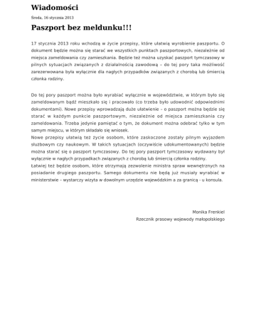 Wiadomości Środa, 16 stycznia 2013 Paszport bez meldunku!!! 17 stycznia 2013 roku wchodzą w życie przepisy, które ułatwią wyrobienie paszportu. O dokument będzie można się starać we wszystkich punktach paszportowych, niezależnie od miejsca zameldowania czy zamieszkania. Będzie też można uzyskać paszport tymczasowy w pilnych sytuacjach związanych z działalnością zawodową – do tej pory taka możliwość zarezerwowana była wyłącznie dla nagłych przypadków związanych z chorobą lub śmiercią członka rodziny. Do tej pory paszport można było wyrabiać wyłącznie w województwie, w którym było się zameldowanym bądź mieszkało się i pracowało (co trzeba było udowodnić odpowiednimi dokumentami). Nowe przepisy wprowadzają duże ułatwienie – o paszport można będzie się starać w każdym punkcie paszportowym, niezależnie od miejsca zamieszkania czy zameldowania. Trzeba jedynie pamiętać o tym, że dokument można odebrać tylko w tym samym miejscu, w którym składało się wniosek. Nowe przepisy ułatwią też życie osobom, które zaskoczone zostały pilnym wyjazdem służbowym czy naukowym. W takich sytuacjach (oczywiście udokumentowanych) będzie można starać się o paszport tymczasowy. Do tej pory paszport tymczasowy wydawany był wyłącznie w nagłych przypadkach związanych z chorobą lub śmiercią członka rodziny. Łatwiej też będzie osobom, które otrzymają zezwolenie ministra spraw wewnętrznych na posiadanie drugiego paszportu. Samego dokumentu nie będą już musiały wyrabiać w ministerstwie – wystarczy wizyta w dowolnym urzędzie wojewódzkim a za granicą - u konsula. Monika Frenkiel Rzecznik prasowy wojewody małopolskiego