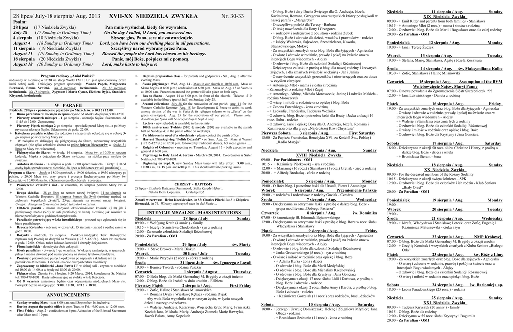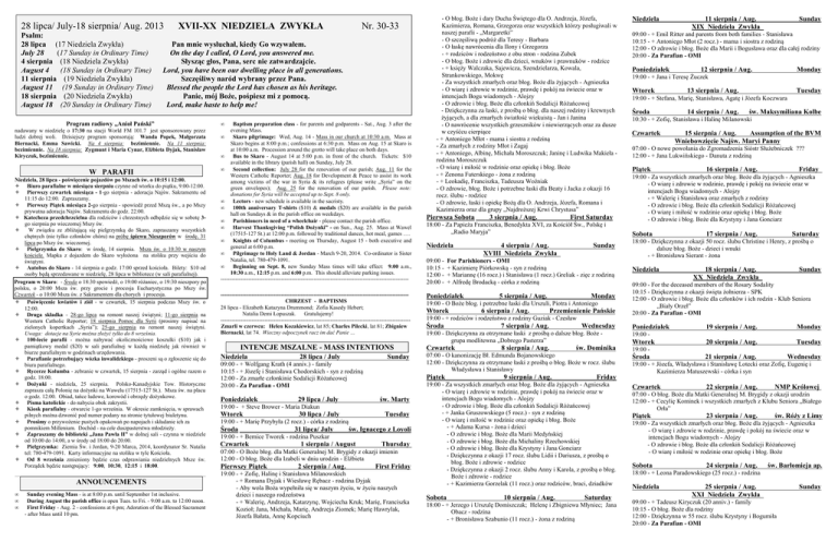 28 lipca/ July-18 sierpnia/ Aug. 2013 Psalm: 28 lipca (17 Niedziela Zwykła) July 28 (17 Sunday in Ordinary Time) 4 sierpnia (18 Niedziela Zwykła) August 4 (18 Sunday in Ordinary Time) 11 sierpnia (19 Niedziela Zwykła) August 11 (19 Sunday in Ordinary Time) 18 sierpnia (20 Niedziela Zwykła) August 18 (20 Sunday in Ordinary Time) XVII-XX NIEDZIELA ZWYKŁA Pan mnie wysłuchał, kiedy Go wzywałem. On the day I called, O Lord, you answered me. Słysząc głos, Pana, serc nie zatwardzajcie. Lord, you have been our dwelling place in all generations. Szczęśliwy naród wybrany przez Pana. Blessed the people the Lord has chosen as his heritage. Panie, mój Boże, pośpiesz mi z pomocą. Lord, make haste to help me! Program radiowy „Anioł Pański” nadawany w niedzielę o 17:30 na stacji World FM 101.7 jest sponsorowany przez ludzi dobrej woli. Dzisiejszy program sponsorują: Wanda Popek, Małgorzata Biernacki, Emma Sawicki. Na 4 sierpnia: bezimiennie. Na 11 sierpnia: bezimiennie. Na 18 sierpnia: Zygmunt i Maria Cynar, Elżbieta Dyjak, Stanisław Kiryczuk, bezimiennie. W PARAFII Niedziela, 28 lipca - poświęcenie pojazdów po Mszach św. o 10:15 i 12:00. Biuro parafialne w miesiącu sierpniu czynne od wtorku do piątku, 9:00-12:00. Pierwszy czwartek miesiąca - 1-go sierpnia - adoracja Najśw. Sakramentu od 11:15 do 12:00. Zapraszamy. Pierwszy Piątek miesiąca 2-go sierpnia - spowiedź przed Mszą św., a po Mszy prywatna adoracja Najśw. Sakramentu do godz. 22:00. Katecheza przedchrzcielna dla rodziców i chrzestnych odbędzie się w sobotę 3go sierpnia po wieczornej Mszy św. W związku ze zbliżającą się pielgrzymką do Skaro, zapraszamy wszystkich chętnych (nie tylko członków chóru) na próbę śpiewu Nieszporów w środę, 31 lipca po Mszy św. wieczornej. Pielgrzymka do Skaro: w środę, 14 sierpnia. Msza św. o 10:30 w naszym kościele. Mapka z dojazdem do Skaro wyłożona na stoliku przy wejściu do świątyni. Autobus do Skaro - 14 sierpnia o godz. 17:00 sprzed kościoła. Bilety: $10 od osoby będą sprzedawane w niedzielę, 28 lipca w bibliotece (w sali parafialnej). Program w Skaro: - Środa o 18:30 spowiedź, o 19:00 różaniec, o 19:30 nieszpory po polsku, o 20:00 Msza św. przy grocie i procesja Eucharystyczna po Mszy św. Czwartek - o 10:00 Msza św. z Sakramentem dla chorych i procesja. Poświęcenie kwiatów i ziół - w czwartek, 15 sierpnia podczas Mszy św. o 12:00. Druga składka - 28-go lipca na remont naszej świątyni; 11-go sierpnia na Western Catholic Reporter; 18 sierpnia Pomoc dla Syrii (prosimy napisać na zielonych kopertkach „Syria”); 25-go sierpnia na remont naszej świątyni. Uwaga: dotacje na Syrie można złożyć tylko do 8 września. 100-lecie parafii - można nabywać okolicznościowe koszulki ($10) jak i pamiątkowy medal ($20) w sali parafialnej w każdą niedzielę jak również w biurze parafialnym w godzinach urzędowania. Parafianie potrzebujący wózka inwalidzkiego - proszeni są o zgłoszenie się do biura parafialnego. Rycerze Kolumba - zebranie w czwartek, 15 sierpnia - zarząd i ogólne razem o godz. 18:00. Dożynki - niedziela, 25 sierpnia. Polsko-Kanadyjskie Tow. Historyczne zaprasza całą Polonię na dożynki na Wawelu (17515-127 St.). Msza św. na placu o godz. 12:00. Obiad, tańce ludowe, korowód i obrzędy dożynkowe. Pisma katolickie - do nabycia obok zakrystii. Kiosk parafialny - otwarcie 1-go września. W okresie zamknięcia, w sprawach pilnych można dzwonić pod numer podany na stronie tytułowej biuletynu. Prosimy o przywożenie pustych opakowań po napojach i składanie ich za pomnikiem Millenium. Dochód - na cele duszpasterstwa młodzieży. Zapraszamy do biblioteki „Jana Pawła II” w dolnej sali - czynna w niedziele od 10:00 do 14:00, a w środy od 18:00 do 20:00. Pielgrzymka: Ziemia Św. i Jordan, 9-20 Marca, 2014, koordynator Sr. Natalia tel: 780-479-1091. Karty informacyjne na stoliku w tyle Kościoła. Od 8 września zmieniony będzie czas odprawiania niedzielnych Msze św. Porządek będzie następujący: 9:00, 10:30, 12:15 i 18:00. ANNOUNCEMENTS • • • Nr. 30-33 Sunday evening Mass - is at 8:00 p.m. until September 1st inclusive. During August the parish office is open Tues. to Fri. - 9:00 a.m. to 12:00 noon. First Friday - Aug. 2 - confessions at 6 pm; Adoration of the Blessed Sacrament - after Mass until 10 pm. • Baptism preparation class - for parents and godparents - Sat., Aug. 3 after the evening Mass. • Skaro pilgrimage: Wed, Aug. 14 - Mass in our church at 10:30 a.m. Mass at Skaro begins at 8:00 p.m.; confessions at 6:30 p.m. Mass on Aug. 15 at Skaro is at 10:00 a.m. Procession around the grotto will take place on both days. • Bus to Skaro - August 14 at 5:00 p.m. in front of the church. Tickets: $10 available in the library (parish hall) on Sunday, July 28. • Second collection: July 28 for the renovation of our parish; Aug. 11 for the Western Catholic Reporter; Aug. 18 for Development & Peace to assist its work among victims of the war in Syria & its refugees (please write „Syria” on the green envelopes); Aug. 25 for the renovation of our parish. Please note: donations for Syria will be accepted up to Sept. 8 only. • Lectors - new schedule is available in the sacristy. • 100th anniversary T-shirts ($10) & medals ($20) are available in the parish hall on Sundays & in the parish office on weekdays. • Parishioners in need of a wheelchair - please contact the parish office. • Harvest Thanksgiving “Polish Dożynki” - on Sun., Aug. 25. Mass at Wawel (17515-127 St.) at 12:00 p.m. followed by traditional dances, hot meal, games …. • Knights of Columbus - meeting on Thursday, August 15 - both executive and general at 6:00 p.m. • Pilgrimage to Holy Land & Jordan - March 9-20, 2014. Co-ordinator is Sister Natalia, tel. 780-479-1091. • Beginning on Sept. 8, new Sunday Mass times will take effect: 9:00 a.m., 10:30 a.m., 12:15 p.m. and 6:00 p.m. This should alleviate