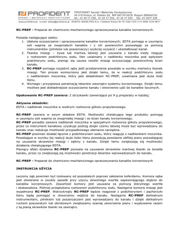 RC-PREP - Preparat do chemiczno-mechanicznego opracowywania kanałów korzeniowych. Posiada następujące zalety: 1. Ułatwia oczyszczanie i opracowywanie kanałów korzeniowych; EDTA pomaga w usunięciu soli wapnia ze zwapniałych kanałów i z ich powierzchni pozwalając za pomocą instrumentów (pilników lub poszerzaczy) szybciej oczyścić i ukształtować kanał. 2. Tkanka miazgi – żywa lub martwa łatwiej jest usuwana z kanału kiedy reaguje z roztworem podchlorynu sodu, tlen uwalniany z nadtlenku mocznika pod wpływem podchlorynu sodu, pieniąc się usuwa resztki miazgi oczyszczając powierzchnię ścian kanału. 3. RC-PREP pomaga rozjaśnić zęby jeśli przebarwienie powstało w wyniku martwicy tkanek miazgi. Ten proces wzmocniony jest dzięki temu, że w reakcji podchlorynu sodu z nadtlenkiem mocznika, który jest składnikiem RC-PREP, uwalniana jest duża ilość tlenu. 4. Wzmaga i przyspiesza penetrację lekarstw wewnątrz systemu korzeniowego. Dzięki temu możliwe jest dokładniejsze oczyszczenie kanału i otworzenie ujść do kanałów bocznych. Opakowanie RC-PREP zawiera: 2 strzykawki zawierające po 9 g preparatu w każdej; Aktywne składniki: EDTA i nadtlenek mocznika w wodnym roztworze glikolu propylenowego. RC-PREP zawiera w swym składzie EDTA. Możliwości chelatujące tego produktu pomogą w usunięciu soli wapnia ze zwapniałej miazgi i ze ścian kanału korzeniowego. RC-PREP ponadto zawiera nadtlenek mocznika w specjalnym roztworze glikolu propylenowego, przez co instrument kanałowy uzyskuje poślizg dzięki czemu łatwiej może być wprowadzany do kanału oraz redukuje możliwość przypadkowego złamania narzędzia. RC-PREP powinien działać łącznie z podchlorynem sodu, który reaguje z nadtlenkiem mocznika. Powstające w wyniku tej reakcji duże ilości tlenu powodują powstanie obfitej piany pozwalającej na usuwanie skrawków miazgi i zębiny z kanału. Dzięki temu zwiększają się możliwości działania chelatującego EDTA. Pieniący efekt działania RC-PREP pozwala na usuwanie skrawków martwej tkanki ze światła kanału, przez co zwiększają się możliwości penetracji lekarstw wprowadzanych do kanału. RC-PREP - Preparat do chemiczno-mechanicznego opracowywania kanałów korzeniowych INSTRUKCJA UŻYCIA Leczony ząb powinien być izolowany od pozostałych poprzez założenie koferdamu. Komora zęba jest otwierana w zwykły sposób przy użyciu dowolnego wiertła zapewniającego dojście do kanałów korzeniowych. Zawartość komory jest usuwana za pomocą sterylnego wiertła i ekskawatora. Później przepłukana roztworem podchlorynu sodu. Następnie komora miazgi jest wypełniana RC-PREP. Wstrzyknięty RC-PREP będzie reagował z podchlorynem i pęcherzyki tlenu będą pomagać w otworzeniu wejścia do kanału. Następnie RC-PREP delikatnym instrumentem, pilnikiem lub poszerzaczem jest wprowadzany do kanału i dzięki delikatnym ruchom posuwistym lub obrotowym zwiększamy szansę utworzenia piany i wypływanie razem z tą pianą skrawków tkanki na zewnątrz. Pierwszy instrument nie powinien być wsunięty dalej niż do połowy długości kanału. Za każdym razem takie działanie jest poprzedzane delikatnym przepłukaniem kanału roztworem podchlorynu sodu. Cała procedura jest powtarzana z dodaniem RC-PREP. W tym czasie instrument jest wprowadzany do ¾ długości roboczej kanału. Łagodne ruchy posuwiste lub rotacyjne narzędzia ułatwiają wypływanie na zewnątrz z kanału większej ilości skrawków martwej tkanki wraz z tworzącą się obfitą pianą. Jeżeli w kanale jest żywa miazga to często zdarza się, że cała zawartość kanału unosi się wraz z pianą lub wysuwa wraz z pilnikiem. Po delikatnym przepłukaniu podchlorynem sodu (za pomocą specjalnych do tego celu igieł) instrument jest ponownie wsuwany do kanału na długość około 1 mm krótszą niż położenie otworu radiologicznego (wykonanie zdjęcia RTG może potwierdzić ten pomiar). Ten pomiar poprawnie dokonany powinien być zanotowany i ewentualnie skorygowany. Stosując tę metodę redukujemy prawdopodobieństwo przepchnięcia zawartości z kanału poza wierzchołek i zainfekowania okołowierzchołkowej tkanki. Pozwala to zredukować dyskomfort po zabiegu. W zębach z dwoma, trzema lub z większą ilością kanałów spieniająca aktywność RC-PREP w połączeniu z podchlorynem sodu pozwala oczyścić komorę i otworzyć ujścia do kanałów. Łatwiejsze staje się wówczas znalezienie wejścia do poszczególnych kanałów i łatwiejsze jest wprowadzanie do światła kanału instrumentów kanałowych. Nigdy nie powinno się przechodzić do następnego rozmiaru instrumentu jeżeli poprzedni instrument nie przechodzi swobodnie do żądanej długości w kanale. RC-PREP jest używany w komorze i w kanale tylko z pierwszymi dwoma lub trzema rozmiarami instrumentów. Następnie kanały powinny być dalej opracowywane tylko z użyciem podchlorynu sodu przez kolejny jeden lub dwa rozmiary instrumentów. Taka ilość RC-PREP zazwyczaj wystarcza do zachowania jego aktywności w usuwaniu pozostałych skrawków i resztek miazgi. Podchloryn sodu powinien być używany do przepłukiwania kanałów aż do momentu kiedy ustanie wydzielanie się pęcherzyków powietrza. Wtedy kanały mogą być osuszone za pomocą ćwieków papierkowych, a następnie zamknięte wybranym przez lekarza stomatologa materiałem. Np. Cavit jest doskonałym opatrunkiem tymczasowym zapobiegającym zakażeniu opracowanego kanału między wizytami. Nie jest zalecane aby między wizytami RC-PREP pozostawał w kanale czy też w komorze zęba w celu rozmiękczenia i otworzenia zwapniałych kanałów. Mikroskopijne nawet ilości tkanki organicznej mogą wówczas przereagować z nadtlenkiem co może doprowadzić do powstania podwyższonego ciśnienia wewnątrz kanału na skutek uwalnianego tlenu i spowodować dyskomfort. Dlatego zawsze należy dokładnie wypłukać RC-PREP z kanałów i z komory roztworem