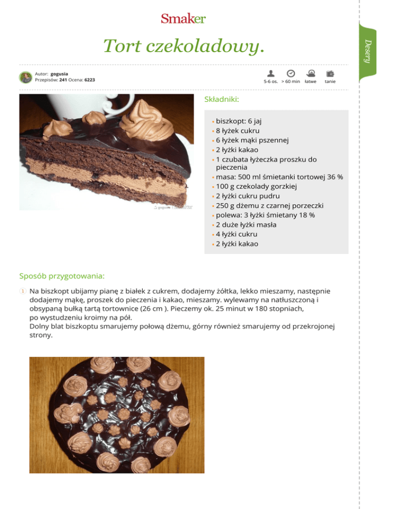 Tort czekoladowy. Autor: gogusia Przepisów: 241 Ocena: 6223 5-6 os. > 60 min łatwe tanie Składniki: biszkopt: 6 jaj 8 łyżek cukru 6 łyżek mąki pszennej 2 łyżki kakao 1 czubata łyżeczka proszku do pieczenia masa: 500 ml śmietanki tortowej 36 % 100 g czekolady gorzkiej 2 łyżki cukru pudru 250 g dżemu z czarnej porzeczki polewa: 3 łyżki śmietany 18 % 2 duże łyżki masła 4 łyżki cukru 2 łyżki kakao Sposób przygotowania: 1 Na biszkopt ubijamy pianę z białek z cukrem, dodajemy żółtka, lekko mieszamy, następnie dodajemy mąkę, proszek do pieczenia i kakao, mieszamy. wylewamy na natłuszczoną i obsypaną bułką tartą tortownice (26 cm ). Pieczemy ok. 25 minut w 180 stopniach, po wystudzeniu kroimy na pół. Dolny blat biszkoptu smarujemy połową dżemu, górny również smarujemy od przekrojonej strony. 2 Śmietankę wlewamy do rondelka i podgrzewamy na małym ogniu, dodajemy pokruszoną czekoladę i cukier puder, stale mieszamy. Gdy czekolada nam się całkowicie rozpuści, zestawiamy z ognia, wstawiamy do lodówki by wystygła i zrobiła się zimna. Gdy śmietanka jest zimna ubijamy ją robotem na najwyższych obrotach, wykładamy na biszkopt, zostawiając 2-3 łyżki na dekorację. Przygotowujemy polewę, podgrzewamy śmietanę, cukier, masło aż zacznie nam ładnie pyrkać i rozpuści się cukier, mieszamy by się nie przypaliło, dodajemy kakao, zestawiamy z ognia i dokładnie mieszamy. Polewamy wierzch tortu, wstawiamy do lodówki by ostygła polewa. Następnie dekorujemy wierzch zostawioną masą. 3 Po schłodzeniu mamy smaczny torcik. Twoje notatki do przepisu:
