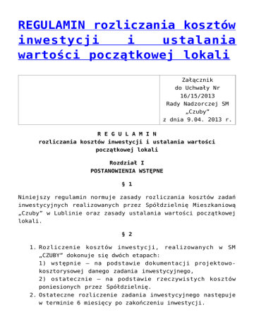 REGULAMIN rozliczania kosztów inwestycji i ustalania