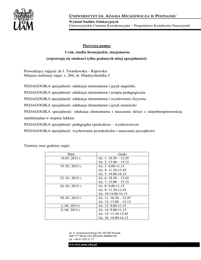Wydział Studiów Edukacyjnych Uniwersyteckie Centrum Koordynacyjno – Programowe Kształcenia Nauczycieli Pierwsza pomoc I rok, studia licencjackie, stacjonarne (rejestrują się studenci tylko podanych niżej specjalności): Prowadzący zajęcia: dr J. Twardowska – Rajewska Miejsce realizacji zajęć: s. 204, ul. Międzychodzka 5 PEDAGOGIKA specjalność: edukacja elementarna i język angielski PEDAGOGIKA specjalność: edukacja elementarna i terapia pedagogiczna PEDAGOGIKA specjalność: edukacja elementarna i wychowanie fizyczne PEDAGOGIKA specjalność: edukacja elementarna i język niemiecki PEDAGOGIKA specjalność: edukacja elementarna i nauczanie dzieci z niepełnosprawnością intelektualna w stopniu lekkim PEDAGOGIKA specjalność: pedagogika opiekuńczo – wychowawcza PEDAGOGIKA specjalność: wychowanie przedszkolne i nauczanie początkowe Terminy oraz godziny zajęć: Data 16.03. 2015 r. 19. 03. 2015 r. 23. 03. 2015 r. 26. 03. 2015 r. 30. 03. 2015 r. 2. 04. 2015 r. 9. 04. 2015 r. Godz. Gr. 1: 10.30 – 12.45 Gr. 2: 13.00 – 15.15 Gr. 3: 9.00-11.15 Gr. 4: 11.30-13.45 Gr. 5: 14.00-16.15 Gr. 6: 10.30 – 12.45 Gr. 7: 13.00 – 15.15 Gr. 8: 9.00-11.15 Gr. 9: 11.30-13.45 Gr. 10:14.00-16.15 Gr. 11: 10.30 – 12.45 Gr. 12: 13.00 – 15.15 Gr. 13: 9.00-11.15 Gr. 14: 9.00-11.15 Gr. 15: 11.30-13.45 Gr. 16: 14.00-16.15 ul. A. Szamarzewskiego 89, 60-568 Poznań NIP 777 00 06 350, REGON 000001293 tel. +48 61 829 21 57 www.wse.amu.edu.pl Wydział Studiów Edukacyjnych Uniwersyteckie Centrum Koordynacyjno – Programowe Kształcenia Nauczycieli 13. 04. 2015 r. 16. 04. 2015 r. 20. 04. 2015 r. 4. 05. 2015 r. 7. 05. 2015 r. 11. 05. 2015 r. 14. 05. 2015 r. 21. 05. 2015 r. Gr. 17: 10.30 – 12.45 Gr. 18: 13.00 – 15.15 Gr. 19: 9.00-11.15 Gr. 20: 11.30-13.45 Gr. 21: 14.00-16.15 Gr. 22: 10.30 – 12.45 Gr. 23: 13.00 – 15.15 Gr. 24: 10.30 – 12.45 Gr. 25: 13.00 – 15.15 Gr. 26: 9.00-11.15 Gr. 27: 11.30-13.45 Gr. 28: 14.00-16.15 Gr. 29: 10.30 – 12.45 Gr. 30: 13.00 – 15.15 Gr. 31: 9.00-11.15 Gr. 32: 11.30-13.45 Gr. 33: 14.00-16.15 Gr. 34: 9.00-11.15 Gr. 35: 11.30-13.45 Gr. 36: 14.00-16.15 ul. A. Szamarzewskiego 89, 60-568 Poznań NIP 777 00 06 350, REGON 000001293 tel. +48 61 829 21 57 www.wse.amu.edu.pl