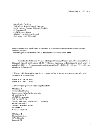 Piekary Śląskie 15.05.2013r. Samodzielny Publiczny Wojewódzki Szpital Chirurgii Urazowej im. Dr. Janusza Daaba w Piekarach Śląskich ul. Bytomska 62 41-940 Piekary Śląskie Sekcja d/s zamówień publicznych Znak sprawy: SZP.270-36/13 ……………………………………… ……………………………………… ……………………………………… Dotyczy zamówienia publicznego ogłoszonego w trybie przetargu nieograniczonego pod nazwą: Dostawa pieczywa. Numer ogłoszenia: 65069 - 2013; data zamieszczenia: 29.04.2013 Samodzielny Publiczny Wojewódzki Szpital Chirurgii Urazowej im. Dr. Janusza Daaba w Piekarach Śląskich ul. Bytomska 62, 41-940 Piekary Śląskie, na podstawie art. 92 ust. 1 ustawy z dnia 29.01.2004 r. – Prawo zamówień publicznych (Dz. U. z 2010 r. Nr 113, poz. 759, z póź. zm.) niniejszym informuje, iż: 1. Kwoty, jakie Zamawiający zamierza przeznaczyć na sfinansowanie poszczególnych części zamówienia, są następujące: Pakiet nr 1 – 73 590,62zl; Pakiet nr 2 – 35 815,50zl; 2. Do w/w postępowania wpłynęła jedna oferta: Oferta nr 1 Gminna Spółdzielnia Samopomoc Chłopska Kochanowice ul. Lubliniecka 2 42-713 Kochanowice T/F: 34 353 32 78 Termin wykonania zamówienia: 12 miesięcy. Okres gwarancji: Warunki płatności: 30 dni. Pakiet nr 2 Cena: 38 762,64zł Oferta nr 2 Piekarnia Lipianin G.W. Lipianin Przylesie 32 1 49-351 Przylesie T: 77 412-38-13 F: 77 412-38-14 Termin wykonania zamówienia: 12 miesięcy. Okres gwarancji: Warunki płatności: 30 dni. Pakiet nr 1 Cena: 82 971,31zł; Oferta nr 3 Piekarnia – Cukiernia Tadeusz Kwapisz ul. Daleka 12 41-908 Bytom T: 32-286-42-68 F: 32-283-13-36 Termin wykonania zamówienia: 12 miesięcy. Okres gwarancji: Warunki płatności: 30 dni. Pakiet nr 1 Cena: 79 524,92zł; Oferta nr 4 Zakład Produkcji Artykułów Spożywczych Mister Karol Binkowski, Ryszard Binkowski Sp. j. Zakład Pracy Chronionej Jeziorko 99c 26-006 Nowa Słupia T: 41-317-70-12 F: 41-317-7012 Termin wykonania zamówienia: 12 miesięcy. Okres gwarancji: Warunki płatności: 30 dni. Pakiet nr 1 Cena: 93 383,10zł; Oferta nr 5 Piekarnia-Cukiernia-Lody Śląska Krzysztof Wylon ul. Dąbrowskiego 29 41-710 Ruda Śląska T: 601-595-140; 601-42-88-40 F: 725-144-808 Termin wykonania zamówienia: 12 miesięcy. Okres gwarancji: Warunki płatności: 30 dni. Pakiet nr 1 Cena: 93 177,75zł; 2 3. Streszczenie i porównanie złożonych ofert: Nr pakietu 1. 2. NR OFERTY/ OFERENT Oferta nr 2 Piekarnia Lipianin Oferta nr 3 Piekarnia – Cukiernia Tadeusz Kwapisz Oferta nr 5 Piekarnia-Cukiernia-Lody Śląska Krzysztof Wylon Oferta nr 1 Gminna Spółdzielnia Samopomoc Chłopska Kochanowice PUNKTY W KRYTERIUM CENA PUNKTY RAZEM 95,85 95,85 100 100 85,35 85,35 100 100 4. Wybrano najkorzystniejszą ofertę: Oferta nr 3 Piekarnia – Cukiernia Tadeusz Kwapisz ul. Daleka 12 41-908 Bytom T: 32-286-42-68 F: 32-283-13-36 Termin wykonania zamówienia: 12 miesięcy. Okres gwarancji: Warunki płatności: 30 dni. Pakiet nr 1 Cena: 79 524,92zł; Uzasadnienie: Oferta spełnia warunki zawarte w siwz i uzyskała największą liczbę punktów w kryteriach oceny ofert a zatem na podstawie art. 91 ust 1 Pzp. oferta została uznana za najkorzystniejszą. Oferta nr 1 Gminna Spółdzielnia Samopomoc Chłopska Kochanowice ul. Lubliniecka 2 42-713 Kochanowice T/F: 34 353 32 78 Termin wykonania zamówienia: 12 miesięcy. Okres gwarancji: Warunki płatności: 30 dni. Pakiet nr 2 Cena: 38 762,64zł Uzasadnienie: Oferta spełnia warunki zawarte w siwz i uzyskała największą liczbę punktów w kryteriach oceny ofert a zatem na podstawie art. 91 ust 1 Pzp. oferta została uznana za najkorzystniejszą. Zamawiający podwyższa kwotę jaką zamierza przeznaczyć na sfinansowanie zamówienia do ceny najkorzystniejszej oferty. 3 5. Nie wykluczono żadnego wykonawcy. 6. Odrzucono następującą ofertę. Oferta nr 4 Zakład Produkcji Artykułów Spożywczych Mister Karol Binkowski, Ryszard Binkowski Sp. j. Zakład Pracy Chronionej Jeziorko 99c 26-006 Nowa Słupia T: 41-317-70-12 F: 41-317-7012 Termin wykonania zamówienia: 12 miesięcy. Okres gwarancji: Warunki płatności: 30 dni. Pakiet nr 1 Cena: 93 383,10zł; Wykonawca nie dołączył, a na wezwanie zamawiającego nie złożył wymaganego w SIWZ opisu potwierdzającego parametry oferowanych produktów (opisane numerem pakietu i poz.). Zatem oferta jest niezgodna z SIWZ i jako taka na podstawie art. 89. ust. 1 pkt 2 ustawy Prawo zamówień publicznych zostaje odrzucona, jako że jej treść nie odpowiada treści specyfikacji istotnych warunków zamówienia 7. Zgodnie z art. 94 ust. 1 ustawy Prawo zamówień publicznych umowa może być zawarta w terminie nie krótszym niż 5 dni od dnia przesłania zawiadomienia o wyborze najkorzystniejszej oferty. Z poważaniem 4