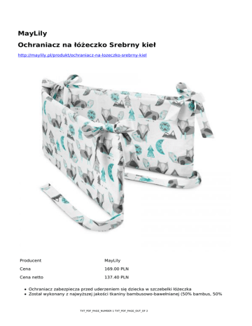 MayLily Ochraniacz na łóżeczko Srebrny kieł http://maylily.pl/produkt/ochraniacz-na-lozeczko-srebrny-kiel Producent MayLily Cena 169.00 PLN Cena netto 137.40 PLN Ochraniacz zabezpiecza przed uderzeniem się dziecka w szczebelki łóżeczka Został wykonany z najwyższej jakości tkaniny bambusowo-bawełnianej (50% bambus, 50% TXT_PDF_PAGE_NUMBER 1 TXT_PDF_PAGE_OUT_OF 2 bawełna) W środku posiada antyalergiczną włókninę najwyższej jakości Jest wiązany na wygodne szarfy Dostępny w dwóch opcjach: 180 cm (na łóżeczko 120x60 cm) oraz 210 cm (na łóżeczko 140x70 cm) Wysokość: 28 cm Idealny jako uzupełnienie naszej bambawełnianej pościeli Autorski, niepowtarzalny wzór Uszyto w Polsce TXT_PDF_PAGE_NUMBER 2 TXT_PDF_PAGE_OUT_OF 2