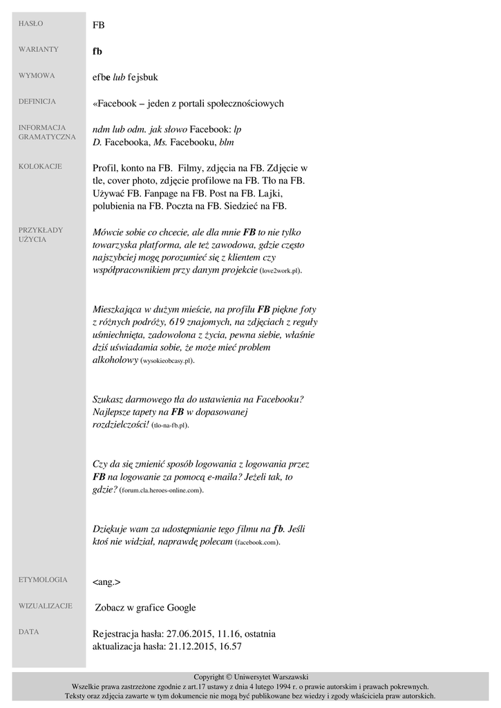 HASŁO FB WARIANTY fb WYMOWA efbe lub fejsbuk DEFINICJA «Facebook – jeden z portali społecznościowych» INFORMACJA GRAMATYCZNA ndm lub odm. jak słowo Facebook: lp D. Facebooka, Ms. Facebooku, blm KOLOKACJE Profil, konto na FB. Filmy, zdjęcia na FB. Zdjęcie w tle, cover photo, zdjęcie profilowe na FB. Tło na FB. Używać FB. Fanpage na FB. Post na FB. Lajki, polubienia na FB. Poczta na FB. Siedzieć na FB. PRZYKŁADY UŻYCIA Mówcie sobie co chcecie, ale dla mnie FB to nie tylko towarzyska platforma, ale też zawodowa, gdzie często najszybciej mogę porozumieć się z klientem czy współpracownikiem przy danym projekcie (love2work.pl). Mieszkająca w dużym mieście, na profilu FB piękne foty z różnych podróży, 619 znajomych, na zdjęciach z reguły uśmiechnięta, zadowolona z życia, pewna siebie, właśnie dziś uświadamia sobie, że może mieć problem alkoholowy (wysokieobcasy.pl). Szukasz darmowego tła do ustawienia na Facebooku? Najlepsze tapety na FB w dopasowanej rozdzielczości! (tlo-na-fb.pl). Czy da się zmienić sposób logowania z logowania przez FB na logowanie za pomocą e-maila? Jeżeli tak, to gdzie? (forum.cla.heroes-online.com). Dziękuje wam za udostępnianie tego filmu na fb. Jeśli ktoś nie widział, naprawdę polecam (facebook.com). ETYMOLOGIA WIZUALIZACJE DATA <ang.> Zobacz w grafice Google Rejestracja hasła: 27.06.2015, 11.16, ostatnia aktualizacja hasła: 21.12.2015, 16.57 Copyright © Uniwersytet Warszawski Wszelkie prawa zastrzeżone zgodnie z art.17 ustawy z dnia 4 lutego 1994 r. o prawie autorskim i prawach pokrewnych. Teksty oraz zdjęcia zawarte w tym dokumencie nie mogą być publikowane bez wiedzy i zgody właściciela praw autorskich. AUTOR Paweł Ciach REDAKTOR Maciej Czeszewski Copyright © Uniwersytet Warszawski Wszelkie prawa zastrzeżone zgodnie z art.17 ustawy z dnia 4 lutego 1994 r. o prawie autorskim i prawach pokrewnych. Teksty oraz zdjęcia zawarte w tym dokumencie nie mogą być publikowane bez wiedzy i zgody właściciela praw autorskich. Powered by TCPDF (www.tcpdf.org)