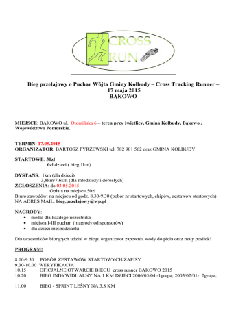 Bieg przełajowy o Puchar Wójta Gminy Kolbudy – Cross Tracking Runner – 17 maja 2015 BĄKOWO MIEJSCE: BĄKOWO ul. Otomińska 6 – teren przy świetlicy, Gmina Kolbudy, Bąkowo , Województwo Pomorskie. TERMIN: 17.05.2015 ORGANIZATOR: BARTOSZ PYRZEWSKI tel. 782 981 562 oraz GMINA KOLBUDY STARTOWE: 30zł 0zł dzieci ( bieg 1km) DYSTANS: 1km (dla dzieci) 3,8km/7,6km (dla młodzieży i dorosłych) ZGŁOSZENIA: do 03.05.2015 Opłata na miejscu 50zł Biuro zawodów: na miejscu od godz. 8.30-9.30 (pobór nr startowych, chipów, zestawów startowych) NA ADRES MAIL: [email protected] NAGRODY: • medal dla każdego uczestnika • miejsca I-III puchar ( nagrody od sponsorów) • dla dzieci niespodzianki Dla uczestników biorących udział w biegu organizator zapewnia wody do picia oraz mały posiłek! PROGRAM: 8.00-9.30 9.30-10.00 10.15 10.20 POBÓR ZESTAWÓW STARTOWYCH/ZAPISY WERYFIKACJA OFICJALNE OTWARCIE BIEGU cross runner BĄKOWO 2015 BIEG INDYWIDUALNY NA 1 KM DZIECI 2006/05/04 -1grupa; 2003/02/01- 2grupa; 11.00 BIEG - SPRINT LEŚNY NA 3,8 KM 12.15 14.00 14.00 BIEG – WYZWANIE NA 7,6 KM DEKORACJA ( miejsca I-III ) FESTYN DLA DZIECI Z UDZIAŁEM STRAŻY POŻARNEJ UWAGA !!! Wprowadzony zostaje elektroniczny pomiar czasu. każdy z zawodników otrzyma przed zawodami chip(hologram z indywidualnym numerem przypisany do jego imienia i nazwiska(do odbioru w biurze zawodów) W związku z tym koordynatorzy muszą do 03.05.2015r, przesłać pełną listę zawodników zakwalifikowanych do poszczególnych startów (na dołączonym formularzu). Możliwe będą drobne poprawki na miejscu zawodów Prosimy o wcześniejsze przybycie w celu szybkiego i sprawnego odbierania chipów, nie później niż godzinę przed startem Nie dopuszcza się startu w obuwiu z kolcami. Organizator nie ubezpiecza uczestników zawodów. 5. WARUNKI UCZESTNICTWA Uczestnikiem biegu może być osoba, która spełni następujące warunki: 1. W 2014 r. kończy 18 lat (rocznik 1995 ) a uczestnicy w przedziale wieku 16 – 17 lat ( 1997- 1998 ) mogą startować po przedstawieniu pisemnej zgody rodziców lub opiekunów prawnych. Osoby poniżej 16 roku życia dopuszcza się do startu wyłącznie pod stałą opieką rodziców lub opiekunów prawnych będących na imprezie. 2. Zarejestruje się za pomocą formularza elektronicznego umieszczonego na stronie internetowej www. ................ (zgłoszenie elektroniczne jest możliwe do......................), dokona osobistego zgłoszenia w Biurze Zawodów w dniu ich rozgrywania. Osoby niepełnoletnie przedstawią zgodę-oświadczenie rodziców dla zawodnika niepełnoletniego (roczniki 1997 i młodsi) 3. Dokona opłaty startowej w wysokości podanej w regulaminie zawodów . Oryginał dowodu opłaty startowej należy przedstawić do wglądu w Biurze Zawodów podczas rejestracji i odbioru numeru startowego. 4. Potwierdzi udział w biegu poprzez okazanie w Biurze Zawodów dowodu dokonania opłaty startowej,(jeśli opłata nie była dokona wcześniej) 5. Otrzyma przed startem od Organizatora bezpłatny numer startowy. 6. KATEGORIE WIEKOWE 1. dzieci : I grupa roczniki 2006/05/04 II grupa 2003/02/01 bieg na 1 km 2. młodzież i dorośli : od rocznika 2000 do 1950 7. DYSTANS Bieg przełajowy, terenowy z naturalnymi przeszkodami na trasie leśnej (występują strome podbiegi i zbiegi). Dystans MINI-sprint leśny- 1km/3,8 km Dystans PEŁNY ( 2 kółka-wyzwanie- 7,6 km) TRASA BIEGU: 8. KLASYFIKACJE Zwycięzcą Biegu Przełajowego zostanie pierwszy zawodnik, który pokona zgodnie z regulaminem wyznaczony dystans i nie pominie żadnego punktu kontrolnego .Zwycięzcami biegu w poszczególnych kategoriach oraz dystansach zostaną uczestnicy, którzy w najkrótszym czasie pokonają trasę biegu w swojej kategorii i nie pominą żadnego punktu kontrolnego. 9. OPŁATY STARTOWE 1. Opłata startowa za udział w Biegu wynosi 30 zł przy wpłacie na konto do 03.05.2015 i 50 zł przy rejestracji w dniu zawodów. Zawodnicy poniżej 16 roku życia, startujący pod opieką rodzica/opiekuna prawnego – start bezpłatny 2. Opłata startowa może być dokonana w formie przelewów z banków tradycyjnych, internetowych, przekazów pocztowych na konto Organizatora nr pkobp 93 1020 1909 0000 3202 0170 0491 Na przelewie bankowym lub pocztowym należy koniecznie zaznaczyć tytuł opłaty, odpowiednio: cross run 2015 oraz imię i nazwisko zawodnika i dystans. Uwaga! Dowód wpłaty przy dokonaniu przelewu elektronicznego należy okazać w biurze zawodów podczas rejestracji i odbioru numeru startowego. Opłatę można również dokonać gotówką w Biurze Zawodów – zgodnie z taryfikatorem opłat startowych powyżej. 3. Organizator nie ponosi odpowiedzialności za terminy realizacji przelewów bankowych i pocztowych. 4. Każdy uczestnik dokonujący wpłaty w biurze zawodów otrzymuje dowód wpłaty. 5. Organizator nie zwraca opłaty wpisowej osobom, które nie ukończyły zawodów lub nie wystartowały. 11. ZASADY ROZGRYWANIA 1. Zawody zostaną przeprowadzone zgodnie z niniejszym Regulaminem 2. Bieg zostanie przeprowadzony na trasie okrężnej, trasa będzie udostępniona na stronie internetowej 3. Organizator zastrzega sobie możliwość modyfikacji trasy 4. Start do Biegu odbędzie się ze startu wspólnego, każda kategoria osobno. Organizator zastrzega sobie prawo do innego sposobu przeprowadzania startu, o czym poinformuje uczestników na odprawie technicznej w dniu rozgrywania zawodów. 5. Trasa będzie oznakowana, zabezpieczona przez porządkowych, ratowników medycznych oraz strażaków. 7. Na trasie będą zlokalizowane punkty kontrolne. Ominięcie punktu kontrolnego będzie karane dyskwalifikacją. 8. Na trasie będzie znajdował się bufet w okolicach startu/mety Szczegółowe informacje będą udzielane na odprawie technicznej. 9. Zawodnik, który nie dobiegnie do mety do wyznaczonej godziny nie zostanie sklasyfikowany 12. ŚWIADCZENIA DLA UCZESTNIKÓW 1. W ramach wpisowego każdy uczestnik otrzymuje: – pam