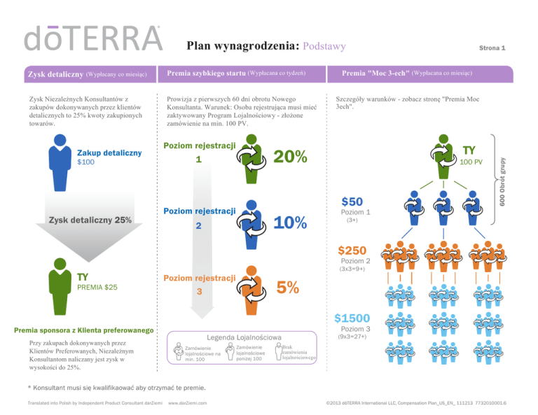 Plan wynagrodzenia: Podstawy Premia szybkiego startu (Wypłacana co tydzeń) Zysk Niezależnych Konsultantów z zakupów dokonywanych przez klientów detalicznych to 25% kwoty zakupionych towarów. Prowizja z pierwszych 60 dni obrotu Nowego Konsultanta. Warunek: Osoba rejestrująca musi mieć zaktywowany Program Lojalnościowy - złożone zamówienie na min. 100 PV. Zakup detaliczny $100 Zysk detaliczny 25% Poziom rejestracji Premia "Moc 3-ech" (Wypłacana co miesiąc) Szczegóły warunków - zobacz stronę "Premia Moc 3ech". TY 20% 1 100 PV $50 Poziom rejestracji 10% 2 600 Obrót grupy Zysk detaliczny (Wypłacany co miesiąc) Strona 1 Poziom 1 (3+) $250 Poziom 2 TY PREMIA $25 (3x3= 9+) Poziom rejestracji $1500 Premia sponsora z Klienta preferowanego Przy zakupach dokonywanych przez Klientów Preferowanych, Niezależnym Konsultantom naliczany jest zysk w wysokości do 25%. 5% 3 Poziom 3 Legenda Lojalnościowa Zamówienie lojalnościowe na min. 100 Zamówienie lojalnościowe poniżej 100 (9x3=27+) Brak zamówienia lojalnościowego * Konsultant musi się kwalifikaować aby otrzymać te premie. Translated into Polish by Independent Product Consultant darZiemi www.darZiemi.com ©2013 dōTERRA International LLC, Compensation Plan_US_EN_ 111213 7732010001.6 Plan wynagrodzenia: Dodatkowe zarobki Strona 2 Premia organizacji poziomów (wypłacana miesięcznie na skompresowanym obrocie grupy ) Wypłacalna ranga Konsultant Manager Dyrektor Executive Elite Premier Silver Gold Platyna Diament Niebieski Diament Prezydencki Diament Miesięczny PV 50 100 100 100 100 100 100 100 100 100 100 100 Miesięczny OV * 500 1,000 2,000 3,000 5,000 * * * * * * Kwalifikowane odnogi* * * * * * 2 3 3 3 4 5 6 Wymagania odnóg * * * * * Executive Elite Premier Silver Silver Gold Poziom 1 2% 2% 2% 2% 2% 2% 2% 2% 2% 2% 2% 2% 3% 3% 3% 3% 3% 3% 3% 3% 3% 3% 3% 5% 5% 5% 5% 5% 5% 5% 5% 5% 5% 5% 5% 5% 5% 5% 5% 5% 5% 5% 6% 6% 6% 6% 6% 6% 6% 6% 6% 6% 6% 6% 6% 6% 6% 7% 7% 7% 7% 7% 7% Poziom 2 Poziom 3 Poziom 4 Poziom 5 Poziom 6 Poziom 7 Platyna Dynamiczna Kompresja 3% Pula nieograniczonej wydajności (wypłacana miesięcznie od całkowitego obrotu firmy) Ilość udziałów Udziały Puli Wydajności: Zdobądź dodatkowe udzialy za każdego osobiście zarejestrowanego Elite (Pula Wydajności Liderów) lub Premiera (PulaWydajności Diamentów)† Pula wydajności diamentów Pula wydajności liderów 1 5 10 1 2 3 1+ 1+ 1+ 1+ 1+ 1+ 2% 1% Pula Diamentu 3% Pula diamentów (wypłacana miesięcznie od całkowitego obrotu firmy) Udziały Niebieskich Diamentów i Diamentów: Zdobądź dodatkowe udzialy za każdego osobiście zarejestrowanego Premiera† Udziały Prezydenckich Diamentów: Zdobądź dodatkowe udzialy za każdego osobiście zarejestrowanego Silver† Ilość udziałów *Odnogi muszą być osobiście rejestrowane. †Muszą być nowi kwalifikowani, nieograniczone udziały. Zobacz zasady firmy po więcej szczegułów. Translated into Polish by Independent Product Consultant darZiemi www.darZiemi.com Pula Pula Niebieskiego Prezydenckiego Diamentu Diamentu 3 3 3 1+ 1+ 1+ 1% 1% 1% ©2013 dōTERRA International LLC, Compensation Plan_US_EN_ 111213 7732010001.6