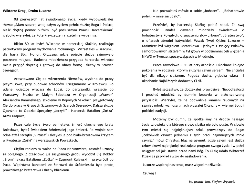 Wiktorze Drogi, Druhu Luxorze 0d pierwszych lat świadomego życia, kiedy wypowiedziałeś słowa: „Mam szczerą wolę całym życiem pełnić służbę Bogu i Polsce, nieść chętną pomoc bliźnim, być posłusznym Prawu Harcerskiemu” głęboko wierzyłeś, że Rotę Przyrzeczenia rzetelnie wypełnisz. Blisko 80 lat byłeś Wiktorze w harcerskiej Służbie, realizując patriotyczny program wychowania rodzinnego. Wzrastałeś w szacunku dla hasła Bóg, Honor, Ojczyzna, gdzie pojęcie służby zajmowało poczesne miejsce. Radosna młodzieńcza przygoda harcerska wkrótce miała przyjąć dojrzałą i gotową do ofiary formę służby w Szarych Szeregach. Aresztowano Cię po wkroczeniu Niemców, wysłano do pracy przymusowej przy budowie schronów Kriegsmarine w Królewcu. Po udanej ucieczce wracasz do Łodzi, do partyzantki, wreszcie do Warszawy. Służba w Małym Sabotażu w Organizacji „Wawer” Aleksandra Kamińskiego, szkolenie w Bojowych Szkołach przygotowały Cię do pracy w Grupach Szturmowych Szarych Szeregów. Dalsza służba Ojczyźnie to Oddział Specjalny „Jerzyki” i Harcerski Batalion „Zośka” Armii Krajowej. Przez całe życie żywo pamiętałeś śmierć ukochanego brata Bolesława, byłeś świadkiem żołnierskiej jego śmierci. Po wojnie sam odnalazłeś szczątki „Virtusa” i złożyłeś je pod biało-brzozowym krzyżem w Kwaterze „Zośki” na warszawskich Powązkach. Ciężko raniony w walce na Placu Narutowicza, zostałeś uznany za poległego. Z częściowo już zasypanego grobu wydobył Cię Doktor „Brom” lekarz Batalionu „Zośka” – Zygmunt Kujawski i przywrócił do życia. Wędrówka kanałami ze Starówki do Śródmieścia była próbą prawdziwego braterstwa i służby bliźniemu. Nie pozwalałeś mówić o sobie „bohater”. „Bohaterowie polegli – mnie się udało”. Przeżyłeś, by harcerską Służbę pełnić nadal. Za swą powinność uznałeś dawanie młodzieży świadectwa o bohaterstwie Poległych, o znaczeniu słów „Honor”, „Braterstwo”, o ofiarach zbrodni katyńskiej. Wszak Twój Ojciec Luxorze – Kazimierz był więźniem Ostaszkowa i jednym z tysięcy Polaków zamordowanych strzałem w tył głowy w podziemnej celi więzienia NKWD w Twerze, spoczywających w Miednoje. Praca zawodowa – 30 lat przy azbeście. Ukochane kolejne pokolenia w rodzinie, którym służyłeś całym sercem. Nie chciałeś być dla nikogo ciężarem. Pogoda ducha, głęboka wiara i ukochanie Najbliższych dodawały Ci sił. Byłeś szczęśliwy, że doczekałeś prawdziwej Niepodległości i prosiłeś młodzież by dumnie kroczyła w biało-czerwoną przyszłość. Wierzyłeś, że na podwalinie kamieni rzuconych na szaniec młodzi wzniosą gmach przyszłej Ojczyzny – wiernej Bogu i polskiej tradycji. Możemy być dumni, że spotkaliśmy na drodze naszego życia człowieka dla którego słowo służba nie było puste. W słowie tym mieści się najpiękniejszy szlak prowadzący do Boga: „cokolwiek czynisz jednemu z tych braci najmniejszych mnie czynisz” mówi Chrystus. Idąc na azymut, gdzie celem jest służba człowiekowi najpiękniej realizujesz program swego życia i w pełni osiągasz cel jaki stawia przed nami Bóg. To Ci się udało Wiktorze! Dzięki za przykład i wzór do naśladowania. Luxorze wspieraj nas teraz, masz więcej możliwości. Czuwaj ! ks. prałat hm. Stefan Wysocki Jesteśmy Wiktorze! Jesteśmy dziś przy Tobie tak, jak Ty byłeś z nami – na zbiórkach, spotkaniach, biwakach, rajdach, zlotach. Byłeś z nami „od zawsze”. Niezawodny, niezmordowany, zawsze gotowy uczynić zadość zaproszeniu do szkoły w dowolnym zakątku Polski, zawsze szeroko otwierający drzwi mieszkania dla garnącej się do Ciebie harcerskiej braci. Do późnego wieku zachowałeś jasność umysłu i sprawność fizyczną. Zadziwiałeś gawędami wywołującymi równie często uśmiech na twarzach młodych i starszych słuchaczy jak i ocieraną niekiedy ukradkiem łzę wzruszenia. „LUXOR” Było w Tobie to „coś” co przyciąga, skłania do zasłuchania i refleksji, pozwala uwierzyć jak ważna jest na co dzień bezinteresowna życzliwość, przyjaźń i Twoja przysłowiowa „pogoda ducha i brzucha”... To Twoje słowa: „Będę żył aż do samej śmierci!” Żyjesz nadal Luxorze! Żyjesz w pamięci tysięcy zasłuchanych w Twoje gawędy młodych Polaków. Żyjesz i pozostaniesz żywy we wspomnieniach przyjaciół, w sercach harcerskich pokoleń którym pomogłeś zrozumieć prawdziwe i współczesne znaczenie słów „Honor”, „Ojczyzna”, „Służba”, „Patriotyzm”. Byłeś jednym z pokolenia „Kolumbów rocznika 20-tego”. My – pokolenia młodsze, przejmujemy z Twoich rąk pałeczkę wielkiej sztafety polskich pokoleń wiernych Rzeczypospolitej, zawsze Niepospolitej! Każdą gawędę kończyłeś żartobliwym zaproszeniem na swój pogrzeb... Przyjmowaliśmy je z uśmiechem, oklaskami i serdecznymi życzeniami... Trudno uwierzyć, że ta chwila nadeszła... Harcerz Rzeczypospolitej WIKTOR MATULEWICZ 14. III. 1920 - 26. I. 2011 Jesteśmy Luxorze! CZUWAJ! hm Krzysztof Jakubiec Pożegnanie 31.I.2011 na Starym Cmentarzu w Łodzi