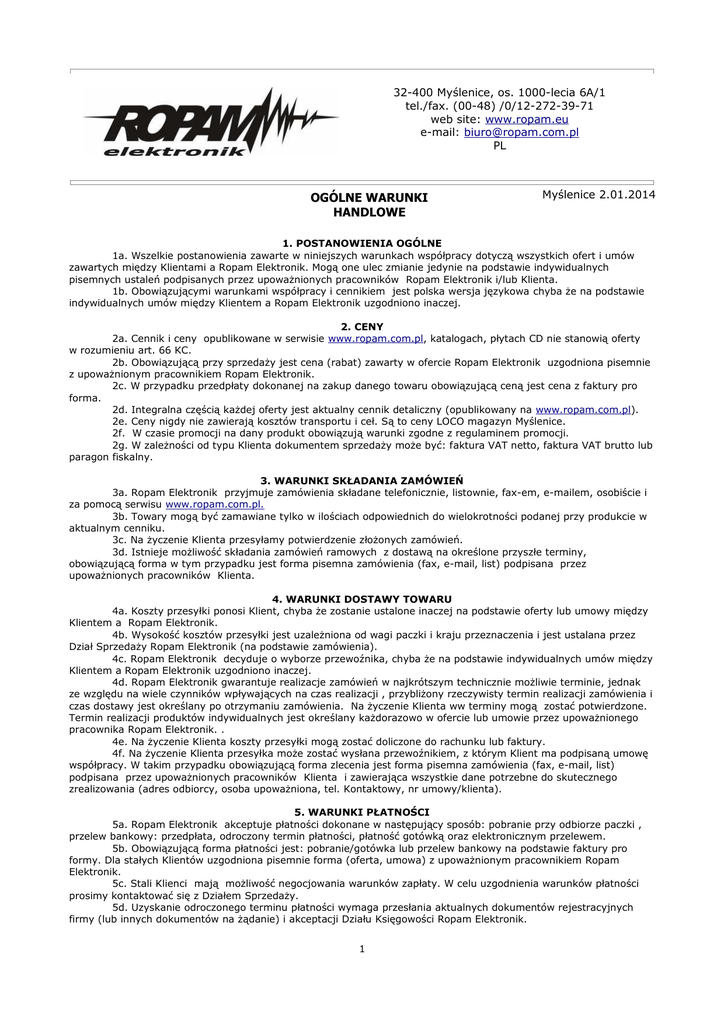 32-400 Myślenice, os. 1000-lecia 6A/1 tel./fax. (00-48) /0/12-272-39-71 web site: www.ropam.eu e-mail: [email protected] PL OGÓLNE WARUNKI HANDLOWE Myślenice 2.01.2014 1. POSTANOWIENIA OGÓLNE 1a. Wszelkie postanowienia zawarte w niniejszych warunkach współpracy dotyczą wszystkich ofert i umów zawartych między Klientami a Ropam Elektronik. Mogą one ulec zmianie jedynie na podstawie indywidualnych pisemnych ustaleń podpisanych przez upoważnionych pracowników Ropam Elektronik i/lub Klienta. 1b. Obowiązującymi warunkami współpracy i cennikiem jest polska wersja językowa chyba że na podstawie indywidualnych umów między Klientem a Ropam Elektronik uzgodniono inaczej. 2. CENY 2a. Cennik i ceny opublikowane w serwisie www.ropam.com.pl, katalogach, płytach CD nie stanowią oferty w rozumieniu art. 66 KC. 2b. Obowiązującą przy sprzedaży jest cena (rabat) zawarty w ofercie Ropam Elektronik uzgodniona pisemnie z upoważnionym pracownikiem Ropam Elektronik. 2c. W przypadku przedpłaty dokonanej na zakup danego towaru obowiązującą ceną jest cena z faktury pro forma. 2d. Integralna częścią każdej oferty jest aktualny cennik detaliczny (opublikowany na www.ropam.com.pl). 2e. Ceny nigdy nie zawierają kosztów transportu i ceł. Są to ceny LOCO magazyn Myślenice. 2f. W czasie promocji na dany produkt obowiązują warunki zgodne z regulaminem promocji. 2g. W zależności od typu Klienta dokumentem sprzedaży może być: faktura VAT netto, faktura VAT brutto lub paragon fiskalny. 3. WARUNKI SKŁADANIA ZAMÓWIEŃ 3a. Ropam Elektronik przyjmuje zamówienia składane telefonicznie, listownie, fax-em, e-mailem, osobiście i za pomocą serwisu www.ropam.com.pl. 3b. Towary mogą być zamawiane tylko w ilościach odpowiednich do wielokrotności podanej przy produkcie w aktualnym cenniku. 3c. Na życzenie Klienta przesyłamy potwierdzenie złożonych zamówień. 3d. Istnieje możliwość składania zamówień ramowych z dostawą na określone przyszłe terminy, obowiązującą forma w tym przypadku jest forma pisemna zamówienia (fax, e-mail, list) podpisana przez upoważnionych pracowników Klienta. 4. WARUNKI DOSTAWY TOWARU 4a. Koszty przesyłki ponosi Klient, chyba że zostanie ustalone inaczej na podstawie oferty lub umowy między Klientem a Ropam Elektronik. 4b. Wysokość kosztów przesyłki jest uzależniona od wagi paczki i kraju przeznaczenia i jest ustalana przez Dział Sprzedaży Ropam Elektronik (na podstawie zamówienia). 4c. Ropam Elektronik decyduje o wyborze przewoźnika, chyba że na podstawie indywidualnych umów między Klientem a Ropam Elektronik uzgodniono inaczej. 4d. Ropam Elektronik gwarantuje realizacje zamówień w najkrótszym technicznie możliwie terminie, jednak ze względu na wiele czynników wpływających na czas realizacji , przybliżony rzeczywisty termin realizacji zamówienia i czas dostawy jest określany po otrzymaniu zamówienia. Na życzenie Klienta ww terminy mogą zostać potwierdzone. Termin realizacji produktów indywidualnych jest określany każdorazowo w ofercie lub umowie przez upoważnionego pracownika Ropam Elektronik. . 4e. Na życzenie Klienta koszty przesyłki mogą zostać doliczone do rachunku lub faktury. 4f. Na życzenie Klienta przesyłka może zostać wysłana przewoźnikiem, z którym Klient ma podpisaną umowę współpracy. W takim przypadku obowiązującą forma zlecenia jest forma pisemna zamówienia (fax, e-mail, list) podpisana przez upoważnionych pracowników Klienta i zawierająca wszystkie dane potrzebne do skutecznego zrealizowania (adres odbiorcy, osoba upoważniona, tel. Kontaktowy, nr umowy/klienta). 5. WARUNKI PŁATNOŚCI 5a. Ropam Elektronik akceptuje płatności dokonane w następujący sposób: pobranie przy odbiorze paczki , przelew bankowy: przedpłata, odroczony termin płatności, płatność gotówką oraz elektronicznym przelewem. 5b. Obowiązującą forma płatności jest: pobranie/gotówka lub przelew bankowy na podstawie faktury pro formy. Dla stałych Klientów uzgodniona pisemnie forma (oferta, umowa) z upoważnionym pracownikiem Ropam Elektronik. 5c. Stali Klienci mają możliwość negocjowania warunków zapłaty. W celu uzgodnienia warunków płatności prosimy kontaktować się z Działem Sprzedaży. 5d. Uzyskanie odroczonego terminu płatności wymaga przesłania aktualnych dokumentów rejestracyjnych firmy (lub innych dokumentów na żądanie) i akceptacji Działu Księgowości Ropam Elektronik. 1 5e. Ropam Elektronik zastrzega sobie możliwość odmowy przyjęcia zamówienia, wstrzymania realizacji zamówienia lub wysyłki zamówionego, jeżeli Klient zalega z płatnościami albo jego sytuacja prawna lub finansowa może powodować problemy z dokonaniem płatności w przyszłości. 5f. Ropam Elektronik zastrzega sobie możliwość odmowy przyjęcia zamówienia, wstrzymania realizacji zamówienia lub wysyłki zamówionego, jeżeli postawa i działania Klienta naruszają aktualnie lub w przyszłości dobre obyczaje handlowe, wizerunek, renomę, dobre imię lub interesy Ropam Elektronik. 6. WARUNKI GWARANCJI 6a. Towary oferowane przez Ropam Elektronik są objęte gwarancją producenta i dostarczane z odpowiednimi kartami gwarancyjnymi lub warunkami gwarancji. W przypadku braku dołączonych warunków gwarancji obowiązują ogólne warunki gwarancji Ropam Elektronik. 7. REKLAMACJE 7a. Reklamacja (zgłoszenie gwarancyjne) musi zawierać dokładny opis przyczyny reklamacji, Ropam Elektronik ma prawo zażądać przedstawienia kopii dowodu zakupu. 7b. Podlegający gwarancji sprzęt należy do siedziby Ropam Elektronik na koszt Klienta, chyba że na podstawie indywidualnych umów między Klientem a Ropam Elektronik uzgodniono inaczej. 7c. Reklamacje ilościowe mogą być zgłaszane nie później niż w ciągu 1 dnia roboczego od otrzymania przesyłki. 7d. Reklamacje dotyczące uszkodzenia towaru w czasie transportu wymagają sporządzenia stosownego protokołu w obecności kuriera (przewoźnik