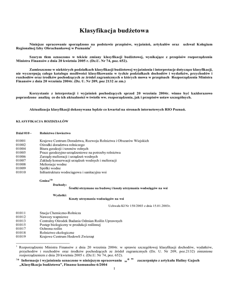 Klasyfikacja budżetowa Niniejsze opracowanie sporządzono na podstawie przepisów, wyjaśnień, artykułów oraz Regionalnej Izby Obrachunkowej w Poznaniu1 uchwał Kolegium Szarym tłem oznaczono w tekście zmiany klasyfikacji budżetowej, wynikające z przepisów rozporządzenia Ministra Finansów z dnia 20 kwietnia 2005 r. (Dz.U. Nr 74, poz. 652). Zamieszczone w niektórych podziałkach klasyfikacji budżetowej wyjaśnienia i interpretacje dotyczące klasyfikacji, nie wyczerpują całego katalogu możliwości klasyfikowania w tychże podziałkach dochodów i wydatków, przychodów i rozchodów oraz środków pochodzących ze źródeł zagranicznych o których mowa w przepisach Rozporządzenia Ministra Finansów z dnia 20 września 2004r. (Dz. U. Nr 209, poz 2132 ze zm.) Korzystanie z interpretacji i wyjaśnień pochodzących sprzed 20 września 2004r. winno być każdorazowo poprzedzone analizą co do ich aktualności w świetle ww. rozporządzenia, jak i przepisów ustaw szczególnych. Aktualizacja klasyfikacji dokonywana będzie co kwartał na stronach internetowych RIO Poznań. KLASYFIKACJA ROZDZIAŁÓW Dział 010 - Rolnictwo i łowiectwo 01001 01002 01004 01005 01006 01007 01008 01009 01010 Krajowe Centrum Doradztwa, Rozwoju Rolnictwa i Obszarów Wiejskich Ośrodki doradztwa rolniczego Biura geodezji i terenów rolnych Prace geodezyjno-urządzeniowe na potrzeby rolnictwa Zarządy melioracji i urządzeń wodnych Zakłady konserwacji urządzeń wodnych i melioracji Melioracje wodne Spółki wodne Infrastruktura wodociągowa i sanitacyjna wsi Gmina2* Dochody: Środki otrzymane na budowę i koszty utrzymania wodociągów na wsi Wydatki: Koszty utrzymania wodociągów na wsi Uchwała KI Nr 158/2003 z dnia 15.01.2003r. 01011 01012 01013 01015 01017 01018 01019 1 Stacja Chemiczno-Rolnicza Nawozy wapniowe Centralny Ośrodek Badania Odmian Roślin Uprawnych Postęp biologiczny w produkcji roślinnej Ochrona roślin Rolnictwo ekologiczne Krajowe Centrum Hodowli Zwierząt Rozporządzenie Ministra Finansów z dnia 20 września 2004r. w sprawie szczegółowej klasyfikacji dochodów, wydatków, przychodów i rozchodów oraz środków pochodzących ze źródeł zagranicznych (Dz. U. Nr 209, poz.2132) zmienione rozporządzeniem z dnia 20 kwietnia 2005 r. (Dz.U. Nr 74, poz. 652). * Informacje i wyjaśnienia oznaczone w niniejszym opracowaniu „* ” zaczerpnięto z artykułu Haliny Gajoch 2 „Klasyfikacja budżetowa”, Finanse komunalne 6/2004 1 01020 01021 01022 01023 01025 01027 01028 01029 01030 01031 01032 01033 01034 01035 01036 01037 01038 01039 01040 01078 01095 Postęp biologiczny w produkcji zwierzęcej Główny Inspektorat Weterynarii Zwalczanie chorób zakaźnych zwierząt oraz badania monitoringowe pozostałości chemicznych i biologicznych w tkankach zwierząt i produktach pochodzenia zwierzęcego Inspekcja Jakości Handlowej Artykułów Rolno-Spożywczych Monitorowanie dostępu polskich artykułów rolno-spożywczych do rynków zagranicznych i wielkości importu Agencja Restrukturyzacji i Modernizacji Rolnictwa Fundusz Ochrony Gruntów Rolnych Dopłaty do oprocentowania kredytów na cele rolnicze Izby rolnicze Grupy producentów rolnych Inspekcja Ochrony Roślin i Nasiennictwa Wojewódzkie inspektoraty weterynarii Powiatowe inspektoraty weterynarii Graniczne inspektoraty weterynarii Restrukturyzacja i modernizacja sektora żywnościowego oraz rozwój obszarów wiejskich W rozdziale tym ujmuje się wydatki związane z finansowaniem zadań objętych Sektorowym Programem Operacyjnym - Restrukturyzacja i modernizacja sektora żywnościowego i rozwój obszarów wiejskich. Jednostki samorządu terytorialnego wykazują w tym rozdziale wydatki ponoszone w szczególności na scalanie gruntów, gospodarowanie rolniczymi zasobami wodnymi, a także na odnowę wsi oraz zachowanie i ochronę dziedzictwa kulturowego. Płatności uzupełniające do gruntów rolnych Rozwój obszarów wiejskich W rozdziale tym ujmuje się wydatki związane z finansowaniem zadań objętych Planem Rozwoju Obszarów Wiejskich finansowanych z Funduszu Orientacji i Gwarancji Rolnej - Sekcja Gwarancji. Pozostałe zadania Wspólnej Polityki Rolnej Opłaty cukrowe Usuwanie skutków klęsk żywiołowych Pozostała działalność Dochody: ze sprzedaży gruntów lub użytków rolnych - § 087 3 01097 Gospodarstwa pomocnicze Dział 020 - Leśnictwo 02001 Gospodarka leśna Powiat 1. Ekwiwalent z tytułu wyłączenia gruntu z upraw rolnych i prowadzenia 4 uprawy leśnej (środki z ARiMR) Dochody: § 246 Wydatki: § 303 2. Dotacje na zalesienie i nadzór nad gospodarką leśną - § 211* Gmina * Dochody: 3 Pismo Min. Finansów ,,Departament Finansów Samorządu Terytorialnego Nr ST1-4800-83/2005/98 z dnia 19.04.2005 do Skarbnika Gminy Szydłowo 4 Pismo Min. Finansów ,,Departament Polityki Regionalnej i Rolnictwa. Nr RR-1/0650/19-2/03/870 z dnia 01.04.2003r. do Starostwa Powiatowego w Kaliszu oraz Minist. Fin., Departament Budżetu Państwa Nr BP1-4071/83/2002/1344 z dnia 29.08.2002r do Regionalnej Izby Obrachunkowej w Olsztynie 2 1. Czynsz za dzierżawę obwodów łowieckich - § 075 2. Sprzedaż drewna z lasu gminnego – § 084 Wydatki : związane z utrzymaniem lasów gminnych – paragrafy jak w jednostce budżetowej 02002 02003 02078 02095 02097 Nadzór nad gospodarką leśną Biuro Nadleśnictwa Leśnego Usuwanie skutków klęsk żywiołowych Pozostała działalność Gospodarstwa pomocnicze Dział 050 - Rybołówstwo i rybactwo 05001 05002 05003 05004 05005 05006 05007 05008 05009 05010 05078 05095 Rybołówstwo Rybactwo Państwowa Straż Rybacka Inspektoraty rybołówstwa morskiego Wykup kwot połowowych dla rybołówstwa dalekomorskiego Zarybianie polskich obszarów morskich Dopłaty do oprocentowania kredytów na skup i przechowywanie zapasów ryb morskich Organizacje producentów rybnych Rybołówstwo i przetwórstwo ryb Rozdział ten obejmuje wydatki na dostosowanie nakładu połowowego do zasobów, odnowę i moderniz