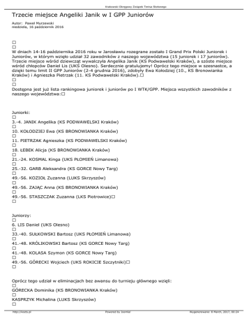 Krakowski Okręgowy Związek Tenisa Stołowego Trzecie miejsce Angeliki Janik w I GPP Juniorów Autor: Paweł Murzewski niedziela, 16 październik 2016 W dniach 14-16 października 2016 roku w Jarosławiu rozegrane zostało I Grand Prix Polski Juniorek i Juniorów, w którym wzięło udział 32 zawodników z naszego województwa (15 juniorek i 17 juniorów). Trzecie miejsce wśród dziewcząt wywalczyła Angelika Janik (KS Podwawelski Kraków), a szóste miejsce wśród chłopców Daniel Lis (UKS Olesno). Serdecznie gratulujemy! Oprócz tego miejsce w szesnastce, a dzięki temu limit II GPP Juniorów (2-4 grudnia 2016), zdobyły Ewa Kołodziej (10., KS Bronowianka Kraków) i Agnieszka Pietrzak (11. KS Podwawelski Kraków). Dostępna jest już lista rankingowa juniorek i juniorów po I WTK/GPP. Miejsca wszystkich zawodników z naszego województwa: Juniorki: 3.-4. JANIK Angelika (KS PODWAWELSKI Kraków) 10. KOŁODZIEJ Ewa (KS BRONOWIANKA Kraków) 11. PIETRZAK Agnieszka (KS PODWAWELSKI Kraków) 18. ŁEBEK Alicja (KS BRONOWIANKA Kraków) 21.-24. KOSMAL Kinga (UKS PŁOMIEŃ Limanowa) 25.-32. GARB Aleksandra (KS GORCE Nowy Targ) 49.-56. KOZIOŁ Zuzanna (LUKS Skrzyszów) 49.-56. ZAJĄC Anna (KS BRONOWIANKA Kraków) 49.-56. STASZCZAK Zuzanna (LKS Piotrowice) Juniorzy: 6. LIS Daniel (UKS Olesno) 33.-40. SUŁKOWSKI Bartosz (UKS PŁOMIEŃ Limanowa) 41.-48. KRÓLIKOWSKI Bartosz (KS GORCE Nowy Targ) 41.-48. KOLASA Szymon (KS GORCE Nowy Targ) 49.-56. GÓRECKI Wojciech (UKS ROKICIE Szczytniki) Oprócz tego udział w eliminacjach bez awansu do turnieju głównego wzięli: GÓRECKA Dominika (KS BRONOWIANKA Kraków) KASPRZYK Michalina (LUKS Skrzyszów) http://kozts.pl Powered by Joomla! Wygenerowano: 8 March, 2017, 00:24 Krakowski Okręgowy Związek Tenisa Stołowego GACH Klaudia (KS GORCE Nowy Targ) ŻYDOWSKA Weronika (MKS TARNOVIA Tarnów) CHYL Kinga (UKS PŁOMIEŃ Limanowa) KOWALCZYK Zuzanna (KS GORCE Nowy Targ) GALUS Mateusz (LUKS Skrzyszów) PETKA Krzysztof (KS PODWAWELSKI Kraków) ZAJĄC Jacek (MKS KSOS Kraków) PEREK Nikodem (MKS KSOS Kraków) PIEGZA Adrian (AS PROGRES Kraków) OLESIAK Grzegorz (UKS PŁOMIEŃ Limanowa) KOŁOS Arkadiusz (UKS ROKICIE Szczytniki) MOREK Radosław (KS PODWAWELSKI Kraków) BŁOCHO Przemysław (UKS Olesno) KUTAJ Maksymilian (UKS ROKICIE Szczytniki) BOGACZ Wojciech (MKS KSOS Kraków) KNAGA Łukasz (KS BRONOWIANKA Kraków) http://kozts.pl Powered by Joomla! Wygenerowano: 8 March, 2017, 00:24