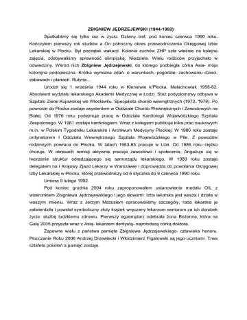 ZBIGNIEW JĘDRZEJEWSKI (1944-1992) Spotkaliśmy się tylko raz w życiu. Dziwny traf, pod koniec czerwca 1990 roku. Kończyłem pierwszy rok studiów a On półroczny okres przewodniczenia Okręgowej Izbie Lekarskiej w Płocku. Był początek wakacji. Kolonia zuchów ZHP szła właśnie na kolejne zajęcia, zdobywaliśmy sprawność olimpijską. Niedziela. Wielu rodziców przyjechało w odwiedziny. Wśród nich Zbigniew Jędrzejewski, do którego podbiegła córka Asia- moja kolonijna podopieczna. Krótka wymiana zdań: o warunkach, pogodzie, zachowaniu dzieci, zabawach i planach. Rutyna... Urodził się 1 września 1944 roku w Kleniewie k/Płocka. Małachowiak 1958-62. Absolwent wydziału lekarskiego Akademii Medycznej w Łodzi. Staż podyplomowy odbywa w Szpitalu Ziemi Kujawskiej we Włocławku. Specjalista chorób wewnętrznych (1973, 1978). Po powrocie do Płocka zostaje asystentem w Oddziale Chorób Wewnętrznych i Zawodowych na Białej. Od 1976 roku podejmuje pracę w Oddziale Kardiologii Wojewódzkiego Szpitala Zespolonego. W 1981 zostaje kardiologiem. Wraz z kolegami publikuje kilka prac naukowych m.in. w Polskim Tygodniku Lekarskim i Archiwum Medycyny Płockiej. W 1980 roku zostaje ordynatorem I Oddziału Wewnętrznego Szpitala Wojewódzkiego w Pile. Z powodów rodzinnych powraca do Płocka. W latach 1983-85 pracuje w Libii. Od 1986 roku ciężko choruje. W okresach remisji aktywnie pracuje zawodowo i społecznie. Angażuje się w tworzenie struktur odradzającego się samorządu lekarskiego. W 1989 roku zostaje delegatem na I Krajowy Zjazd Lekarzy w Warszawie i doprowadza do powołania Okręgowej Izby Lekarskiej w Płocku, której przewodniczy od 6 stycznia do 9 czerwca 1990 roku. Umiera 9 lutego 1992. Pod koniec grudnia 2004 roku zaproponowałem ustanowienie medalu OIL z wizerunkiem Zbigniewa Jędrzejewskiego i jego słowami: Izba lekarska jest wasza i działa w waszym imieniu. Wraz z Jerzym Mazusiem opracowaliśmy szczegóły, rada lekarska je zatwierdziła i powstał symboliczny złoty krążek wręczany lekarzom seniorom za ich dorobek życia: służbę ludzkiemu zdrowiu. Pierwszy egzemplarz odebrała żona Bożenna, która na Galę 2005 przyszła wraz z Asią- lekarzem dentystą- najmłodszą córką doktora. Zapewne wielu z państwa pamięta Zbigniewa Jędrzejewskiego- człowieka honoru. Płocczanie Roku 2006 Andrzej Drzewiecki i Włodzimierz Figatowski są jego uczniami. Trwa sztafeta pokoleń a pamięć zostaje.