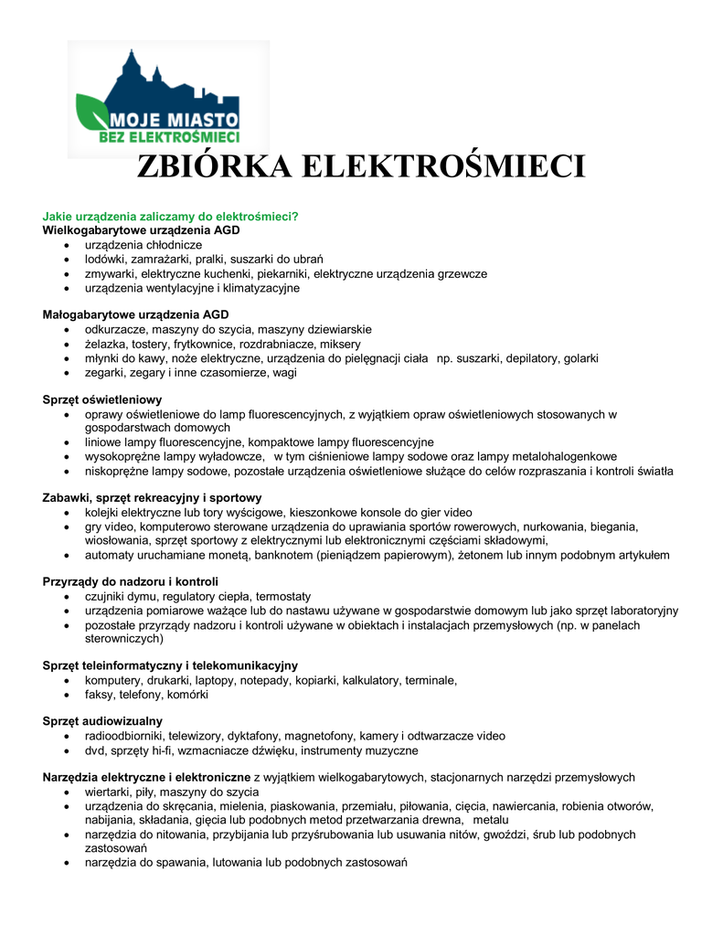 ZBIÓRKA ELEKTROŚMIECI Jakie urządzenia zaliczamy do elektrośmieci? Wielkogabarytowe urządzenia AGD urządzenia chłodnicze lodówki, zamrażarki, pralki, suszarki do ubrań zmywarki, elektryczne kuchenki, piekarniki, elektryczne urządzenia grzewcze urządzenia wentylacyjne i klimatyzacyjne Małogabarytowe urządzenia AGD odkurzacze, maszyny do szycia, maszyny dziewiarskie żelazka, tostery, frytkownice, rozdrabniacze, miksery młynki do kawy, noże elektryczne, urządzenia do pielęgnacji ciała np. suszarki, depilatory, golarki zegarki, zegary i inne czasomierze, wagi Sprzęt oświetleniowy oprawy oświetleniowe do lamp fluorescencyjnych, z wyjątkiem opraw oświetleniowych stosowanych w gospodarstwach domowych liniowe lampy fluorescencyjne, kompaktowe lampy fluorescencyjne wysokoprężne lampy wyładowcze, w tym ciśnieniowe lampy sodowe oraz lampy metalohalogenkowe niskoprężne lampy sodowe, pozostałe urządzenia oświetleniowe służące do celów rozpraszania i kontroli światła Zabawki, sprzęt rekreacyjny i sportowy kolejki elektryczne lub tory wyścigowe, kieszonkowe konsole do gier video gry video, komputerowo sterowane urządzenia do uprawiania sportów rowerowych, nurkowania, biegania, wiosłowania, sprzęt sportowy z elektrycznymi lub elektronicznymi częściami składowymi, automaty uruchamiane monetą, banknotem (pieniądzem papierowym), żetonem lub innym podobnym artykułem Przyrządy do nadzoru i kontroli czujniki dymu, regulatory ciepła, termostaty urządzenia pomiarowe ważące lub do nastawu używane w gospodarstwie domowym lub jako sprzęt laboratoryjny pozostałe przyrządy nadzoru i kontroli używane w obiektach i instalacjach przemysłowych (np. w panelach sterowniczych) Sprzęt teleinformatyczny i telekomunikacyjny komputery, drukarki, laptopy, notepady, kopiarki, kalkulatory, terminale, faksy, telefony, komórki Sprzęt audiowizualny radioodbiorniki, telewizory, dyktafony, magnetofony, kamery i odtwarzacze video dvd, sprzęty hi-fi, wzmacniacze dźwięku, instrumenty muzyczne Narzędzia elektryczne i elektroniczne z wyjątkiem wielkogabarytowych, stacjonarnych narzędzi przemysłowych wiertarki, piły, maszyny do szycia urządzenia do skręcania, mielenia, piaskowania, przemiału, piłowania, cięcia, nawiercania, robienia otworów, nabijania, składania, gięcia lub podobnych metod przetwarzania drewna, metalu narzędzia do nitowania, przybijania lub przyśrubowania lub usuwania nitów, gwoździ, śrub lub podobnych zastosowań narzędzia do spawania, lutowania lub podobnych zastosowań urządzenia do rozpylania, rozprowadzania, rozpraszania lub innego typu nanoszenia cieczy lub substancji gazowych innymi metodami narzędzia do koszenia trawy lub innych prac ogrodniczych Przyrządy medyczne, z wyjątkiem wszystkich wszczepianych i skażonych produktów sprzęt do radioterapii, sprzęt do badań kardiologicznych, sprzęt do dializoterapii sprzęt do wentylacji płuc urządzenia medyczne wykorzystujące technikę nuklearną sprzęt laboratoryjny do diagnozowania in-vitro, zamrażarki laboratoryjne, testy płodności pozostałe urządzenia do wykrywania, zapobiegania, monitorowania, leczenia, łagodzenia choroby, urazów Automaty do wydawania automaty do wydawania napojów gorących, automaty do wydawania butelek lub puszek z zimnymi i gorącymi napojami, automaty do wydawania produktów stałych