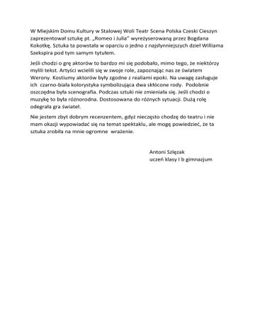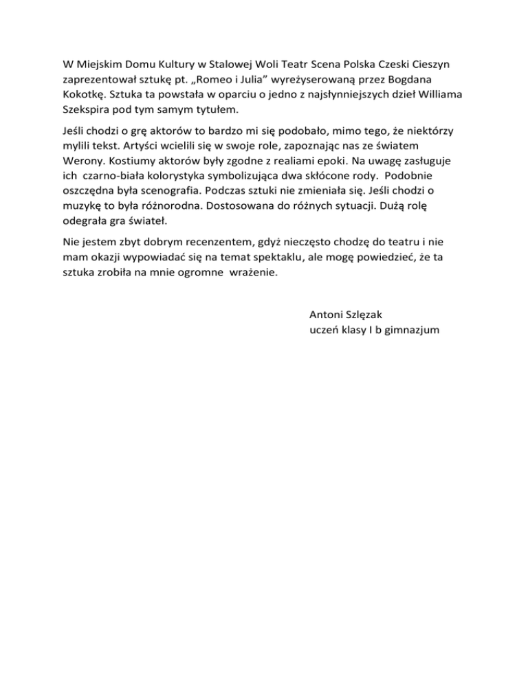 W Miejskim Domu Kultury w Stalowej Woli Teatr Scena Polska Czeski Cieszyn zaprezentował sztukę pt. „Romeo i Julia” wyreżyserowaną przez Bogdana Kokotkę. Sztuka ta powstała w oparciu o jedno z najsłynniejszych dzieł Williama Szekspira pod tym samym tytułem. Jeśli chodzi o grę aktorów to bardzo mi się podobało, mimo tego, że niektórzy mylili tekst. Artyści wcielili się w swoje role, zapoznając nas ze światem Werony. Kostiumy aktorów były zgodne z realiami epoki. Na uwagę zasługuje ich czarno-biała kolorystyka symbolizująca dwa skłócone rody. Podobnie oszczędna była scenografia. Podczas sztuki nie zmieniała się. Jeśli chodzi o muzykę to była różnorodna. Dostosowana do różnych sytuacji. Dużą rolę odegrała gra świateł. Nie jestem zbyt dobrym recenzentem, gdyż nieczęsto chodzę do teatru i nie mam okazji wypowiadad się na temat spektaklu, ale mogę powiedzied, że ta sztuka zrobiła na mnie ogromne wrażenie. Antoni Szlęzak uczeo klasy I b gimnazjum