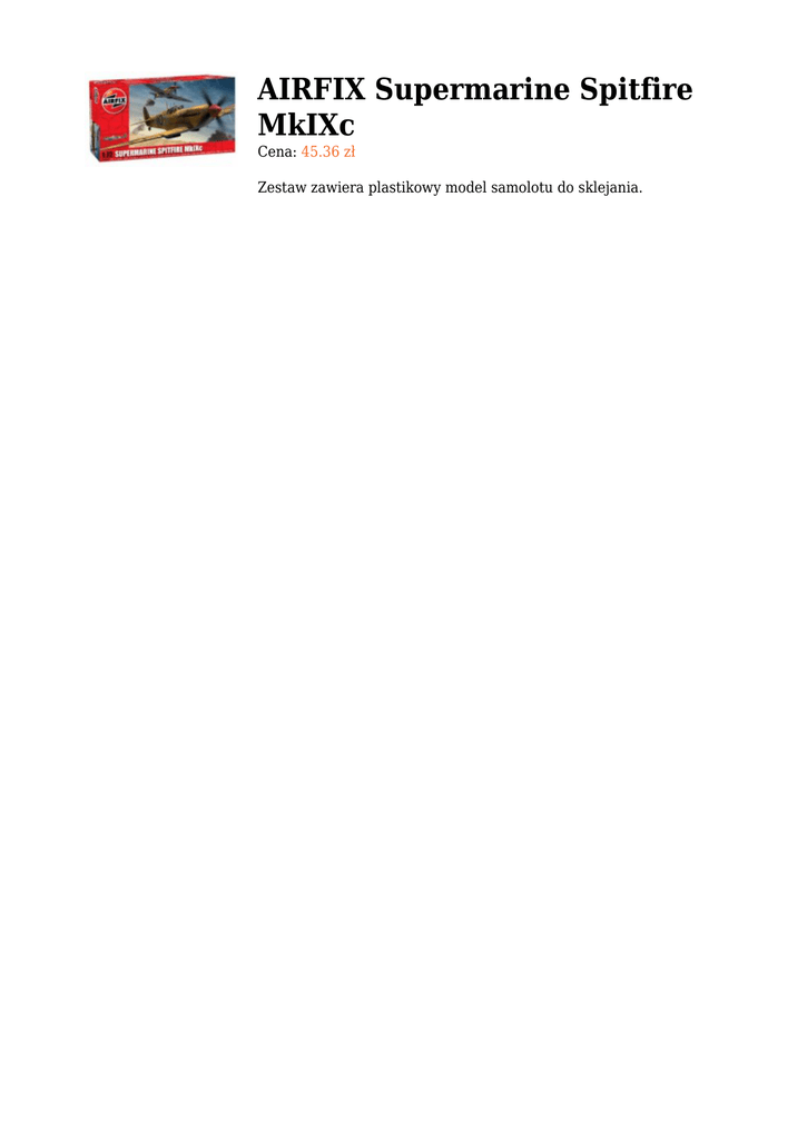 AIRFIX Supermarine Spitfire MkIXc Cena: 45.36 zł Zestaw zawiera plastikowy model samolotu do sklejania.