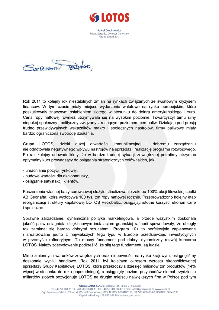 Rok 2011 to kolejny rok niestabilnych zmian na rynkach związanych ze światowym kryzysem finansów. W tym czasie miały miejsce wydarzenia walutowe na rynku europejskim, które poskutkowały znacznym osłabieniem złotego w stosunku do dolara amerykańskiego i euro. Cena ropy naftowej również utrzymywała się na wysokim poziomie. Towarzyszył temu silny niepokój społeczny i polityczny związany z rosnącym poziomem cen paliw. Działając pod presją trudno przewidywalnych wskaźników makro i społecznych nastrojów, firmy paliwowe miały bardzo ograniczoną swobodę działania. Grupa LOTOS, dzięki dużej otwartości komunikacyjnej i dobremu zarządzaniu nie odnotowała negatywnego wpływu nastrojów na sprzedaż i realizację programu rozwojowego. Po raz kolejny udowodniliśmy, że w bardzo trudnej sytuacji zewnętrznej potrafimy utrzymać optymalny kurs prowadzący do osiągania strategicznych celów takich, jak: - umacnianie pozycji rynkowej, - budowa wartości dla akcjonariuszy, - osiąganie satysfakcji klientów. Poszerzeniu własnej bazy surowcowej służyło sfinalizowanie zakupu 100% akcji litewskiej spółki AB Geonafta, która wydobywa 100 tys. ton ropy naftowej rocznie. Przeprowadzono kolejny etap reorganizacji struktury kapitałowej LOTOS Petrobaltic, osiągając istotne korzyści ekonomiczne i społeczne. Sprawne zarządzanie, dynamiczna polityka marketingowa, a przede wszystkim doskonała jakość paliw osiągnięta dzięki nowym instalacjom gdańskiej rafinerii spowodowały, że ubiegły rok zamknął się bardzo dobrymi rezultatami. Program 10+ to perfekcyjnie zaplanowane i zrealizowane jedno z największych tego typu w Europie przedsięwzięć inwestycyjnych w przemyśle rafineryjnym. To mocny fundament pod dobry, dynamiczny rozwój koncernu LOTOS. Należy zdecydowanie podkreślić, że siłą tego fundamentu są ludzie. Mimo zmiennych warunków zewnętrznych oraz niepewności na rynku krajowym, osiągnęliśmy doskonałe wyniki handlowe. Rok 2011 był kolejnym okresem wzrostu skonsolidowanej sprzedaży Grupy Kapitałowej LOTOS, która przekroczyła dziesięć milionów ton produktów (14% więcej w stosunku do roku poprzedniego), a osiągnięty poziom przychodów niemal trzydziestu miliardów złotych pozycjonuje LOTOS na drugim miejscu największych firm w Polsce pod tym względem. Dalsze zwiększenie udziału w rynku paliw do ponad 33% świadczy o sprawnym funkcjonowaniu służb handlowych. Ważnym osiągnięciem rynkowym i wizerunkowym był dynamiczny rozwój sieci stacji segmentu ekonomicznego – LOTOS Optima. To sukces koncepcji sprzedaży wysokiej jakości paliw za optymalną cenę, uwzględniającą realia rynku bardzo wrażliwego na poziom cen detalicznych. Koncern proaktywnie zareagował w ten sposób na sytuację społeczną i gospodarczą kraju, a także na oczekiwania swoich klientów i partnerów. Sukcesy odnotowaliśmy w segmentach olejów i asfaltów. Mimo bardzo ostrej konkurencji, LOTOS utrzymał pozycję lidera rynku. Zarówno oleje silnikowe, jak i przemysłowe przodują w swoich grupach sprzedaży. Trzeba wspomnieć też o dobrej pracy LOTOS Kolej. Spółka zajmuje trzecie miejsce wśród wszystkich przewoźników w kraju pod względem ilości przewiezionych towarów. To jedna z najlepiej rozwijających się firm transportu kolejowego w Polsce. W końcu minionego roku Zarząd Grupy LOTOS opracował Program Optymalnej Ekspansji, który jest dostosowaniem strategii na rok 2012 do zmiennych warunków rynkowych i zagrożeń ze strony międzynarodowych procesów makrofinansowych i makroekonomicznych. Efekt finansowy Programu szacowany jest na 220 mln zł. Zarząd Grupy LOTOS w sposób optymalny połączył redukcję wydatków i odsunięcie w czasie niektórych działań inwestycyjnych tak, aby zapewnić dodatkowe wsparcie dla najważniejszych celów strategicznych Spółki, przy koncentracji sił i środków na ich osiąganiu. Z pełną dynamiką będziemy kontynuować rozwój w obszarze upstreamu (działania poszukiwawcze i wydobywcze) we wszystkich obszarach zainteresowania LOTOSU. Energicznie rozwijana będzie sieć stacji paliwowych zarówno segmentu ekonomicznego LOTOS Optima, jak i premium. Rozsądna, bardzo realistyczna i z wysoką dyscypliną realizowana polityka finansowa LOTOSU stała się już powszechnie znanym wyznacznikiem jakości zarządzania naszą firmą. Zawsze skupiamy wszelkie siły dla osiągania zrównoważonego rozwoju, po to, żeby z jednej strony zapewnić Spółce i jej grupie kapitałowej stałą ekspansję, z drugiej zaś zachować pełne bezpieczeństwo finansowe. Grupa LOTOS we wszystkich rankingach zajmuje wysokie miejsca, jako firma nowocześnie i dynamicznie zarządzana, posiadająca realistyczną strategię, świetną kadrę zarządzającą oraz wysoko wykwalifikowaną i oddaną załogę. Zjawiska kryzysowe, które pojawiają się w obszarach europejskich finansów i gospodarki, stwarzają atmosferę niepewności i zagrożeń. Jestem przekonany, że dzięki doskonale zrealizowanej inwestycji, jaką był Program 10+, Grupa LOTOS znajduje się na uprzywilejowanej pozycji do osiągnięcia znacznych korzyści z oczekiwanej poprawy sytuacji makroekonomicznej. W Europie zaczyna brakować nowoczesnych mocy przetwarzania ropy naftowej. Instalacje rafinerii Grupy LOTOS dostarczają produkty najwyższej jakości i jednocześnie najgłębiej przetwarzają surowiec, co wpływa na podwyższenie efektywności finansowej rafinacji i umacnia konkurencyjną pozycję koncernu na rynku. Te efekty będą coraz silniej widoczne i odczuwalne w 2012 roku. 2 Grupa LOTOS w swoich działaniach stosuje strategię zrównoważonego rozwoju z silnym udziałem wymogów społecznej odpowiedzialności biznesu. Jest to zgodne ze współczesnymi trendami zarządzania wielkimi organizacjami przemysłowymi, w których praktyce czynnik społeczny odgrywa rosnącą rolę. Z jednej strony tworzy on otoczenie rynkowe przedsiębiorstwa, z drugiej zaś wp